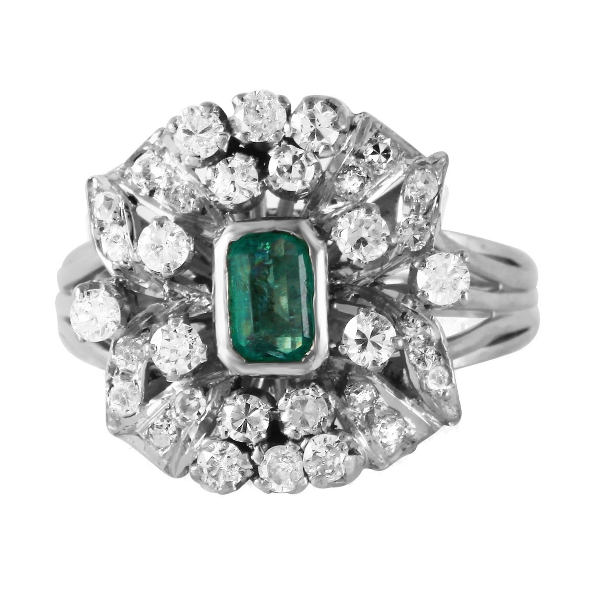 One electronically tested 14KT white gold ladies cast emerald and diamond ring with a bright polish finish. Condition is very good. Containing: One bezel set emerald standard step cut natural emerald, measuring 5.50 x 3.50 x 2.28mm, approximate total weight of 0.32ct., clarity is moderately included, type III, light, very slightly grayish, green color, Sixteen prong set single cut diamonds, measuring 1.30 - 1.30 x 0.78mm (depth est.) approximate total weight of 16 Stones = 0.13ct. Clarity: I-1 to I-2. Color: H - I. Sixteen prong set round brilliant cut diamonds, measuring 2.00 - 2.00 x 1.20mm (depth est.) approximate total weight of 16 Stones = 0.47ct. Clarity: SI-2 to I-1. Color: I - J. Approximate Total Weight of Colored Stones 0.32ct. Approximate Total Weight of Diamonds 0.60ct. Total Weight of Ring 6.50gm. Ring Size 7. The descriptions listed should not be construed as an appraisal. The detail is provided as a guideline for color, clarity, weights and measurements to the best of our ability. We welcome inspections. WE SHIP WORLDWIDE!