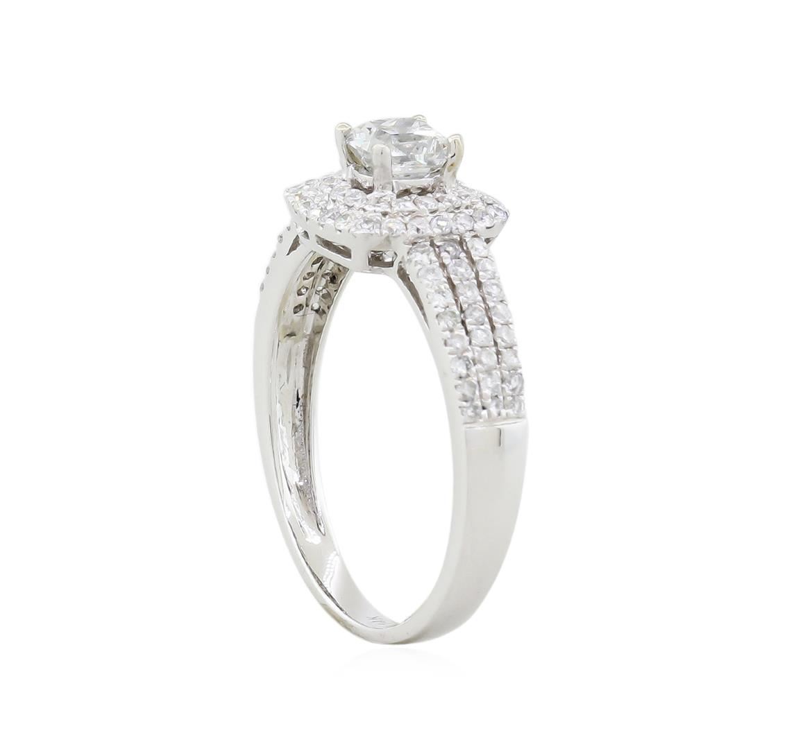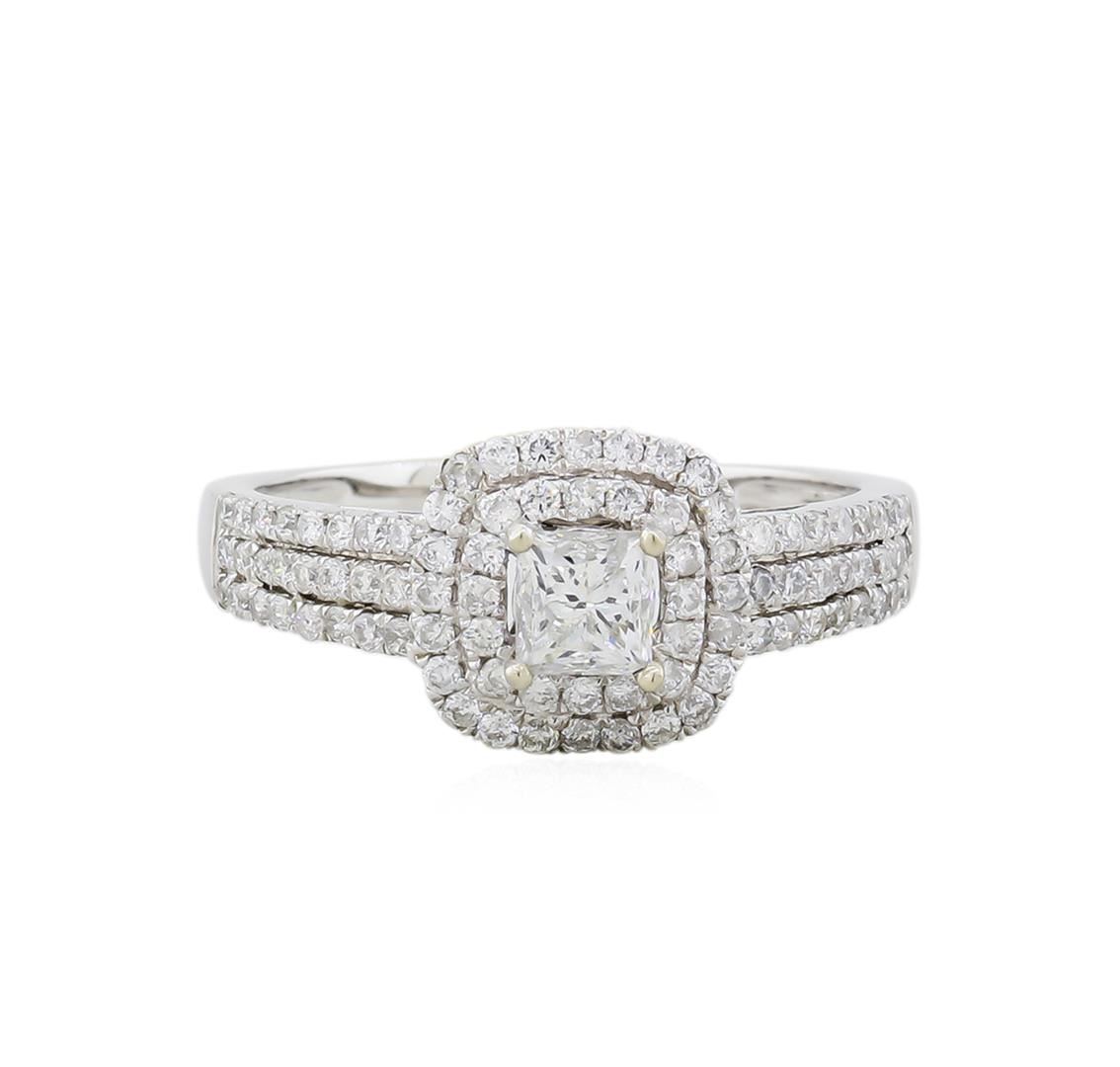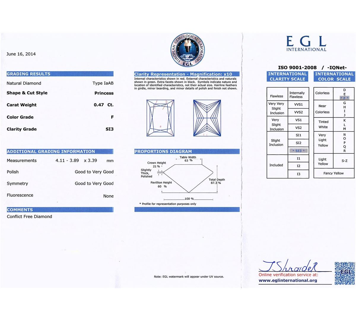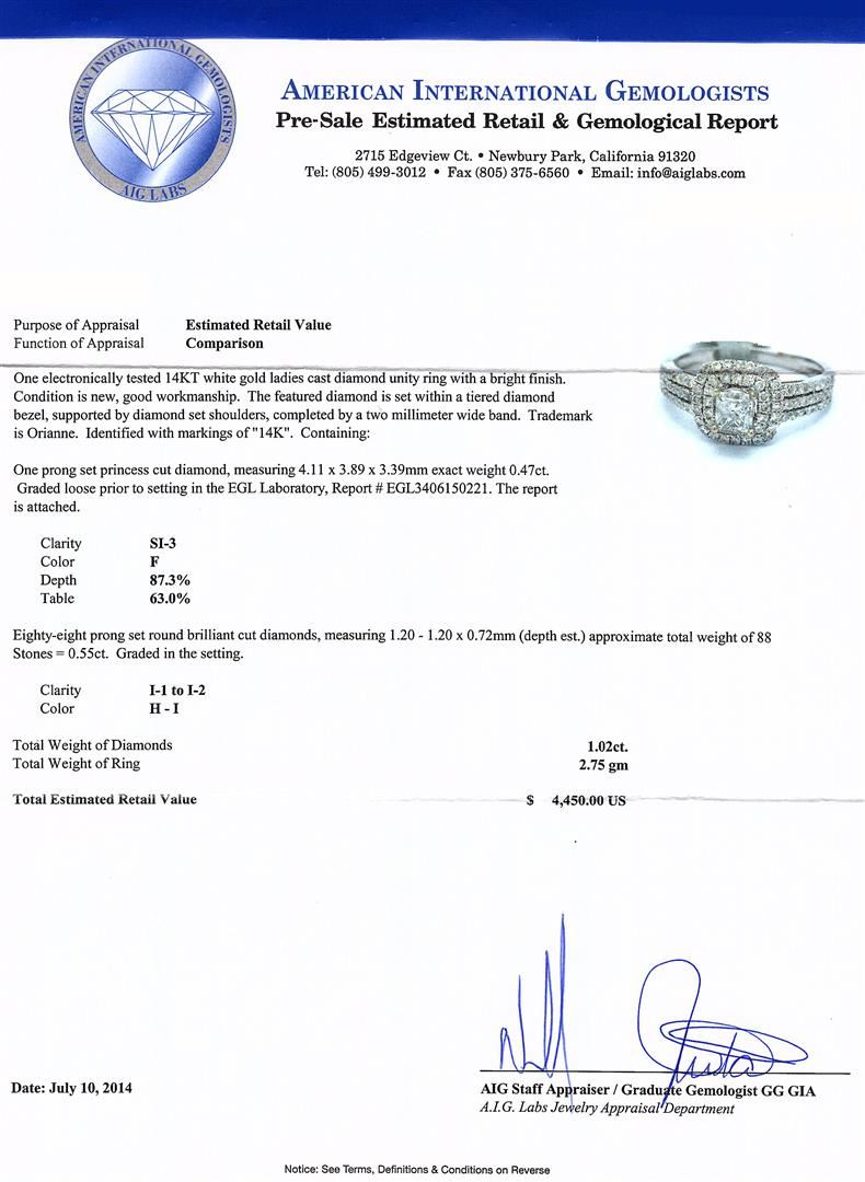 One electronically tested 14KT white gold ladies cast diamond unity ring with a bright finish. The featured diamond is set within a tiered diamond bezel, supported by diamond set shoulders, completed by a two millimeter wide band. Trademark is Orianne. Identified with markings of "14K". Condition is new, good workmanship. Containing: One prong set princess cut diamond, measuring 4.11 x 3.89 x 3.39mm exact weight 0.47ct. Graded loose prior to setting in the EGL Laboratory, Report # EGL3406150221. The report is attached. Clarity: SI-3. Color: FDepth 87.3%. Table 63.0%. Eighty-Eight prong set round brilliant cut diamonds, measuring 1.20 - 1.20 x 0.72mm (depth est.) approximate. Total Weight of 88 Stones = 0.55ct. Graded in the setting. Clarity: I-1 to I-2. Color: H - I. Total Weight of Diamonds 1.02ct. AIG Appraised at $4,450.00.