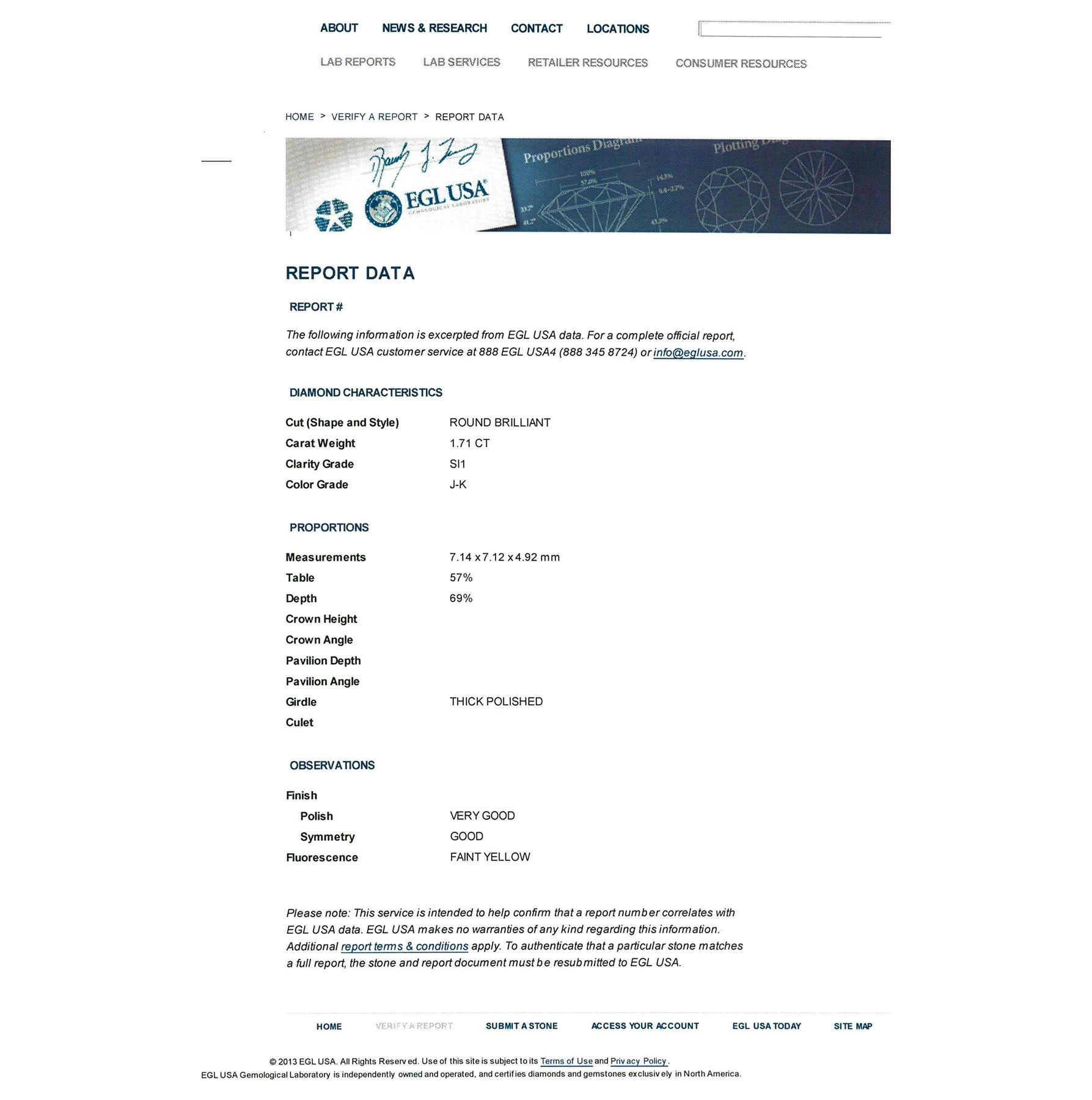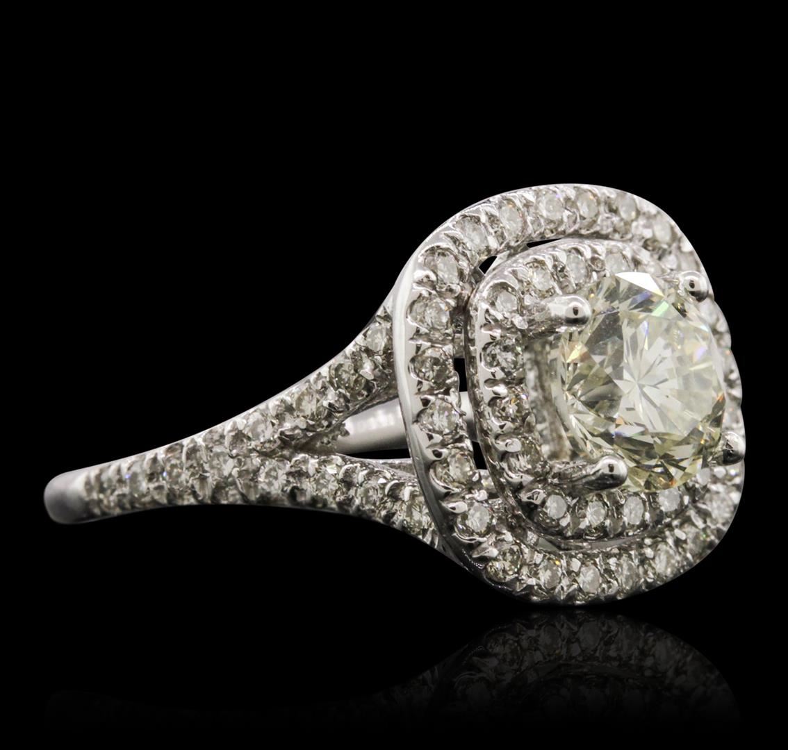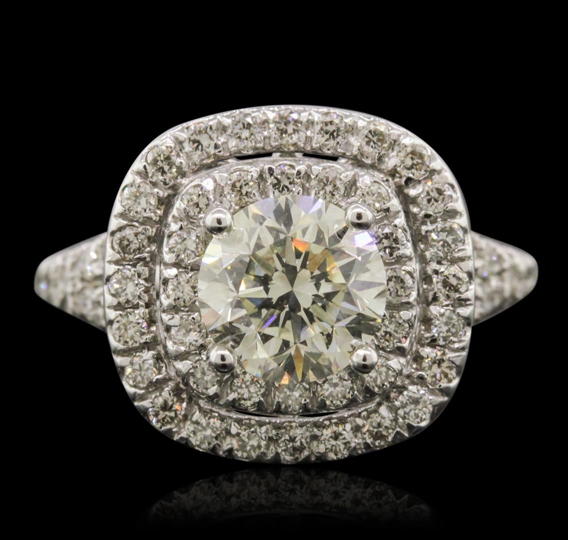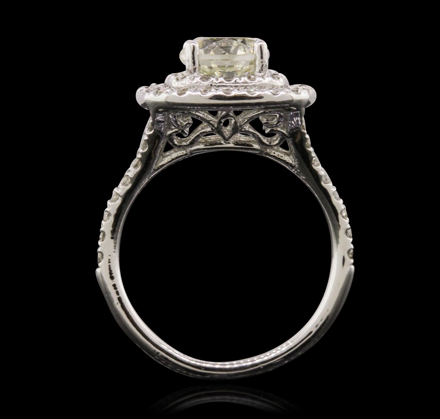 One electronically tested 14KT white gold ladies cast diamond unity ring with a bright polish finish. Condition is new, good workmanship. The featured diamond is set within two tiered diamond bezels supported by diamond set split shoulders, completed by a one and one-half millimeter wide band. Identified with markings of "14K". Containing: One prong set round brilliant cut diamond, measuring 7.14 - 7.12 x 4.92mm approximate weight of 1.71ct with a faint yellow fluorescence. EGL Report attached. Graded in the EGL Laboratory Report #US 911348434D. Clarity: SI-1. Color: J - Depth 69.0%. Table 57.0%. Sixty-Four prong set round brilliant cut diamonds, measuring 1.50 - 1.40 x 0.87mm (depth est.) approximate. Total Weight of 64 Stones = 0.74ct. EGL Report attached. Graded in the EGL Laboratory Report #US 911348434D. Clarity: SI-1 to SI-2. Color: H - I. Total Weight of Diamonds 2.45ct. Total Weight of Unity Ring 5.24 grams. AIG Appraised at $39,610.00.
