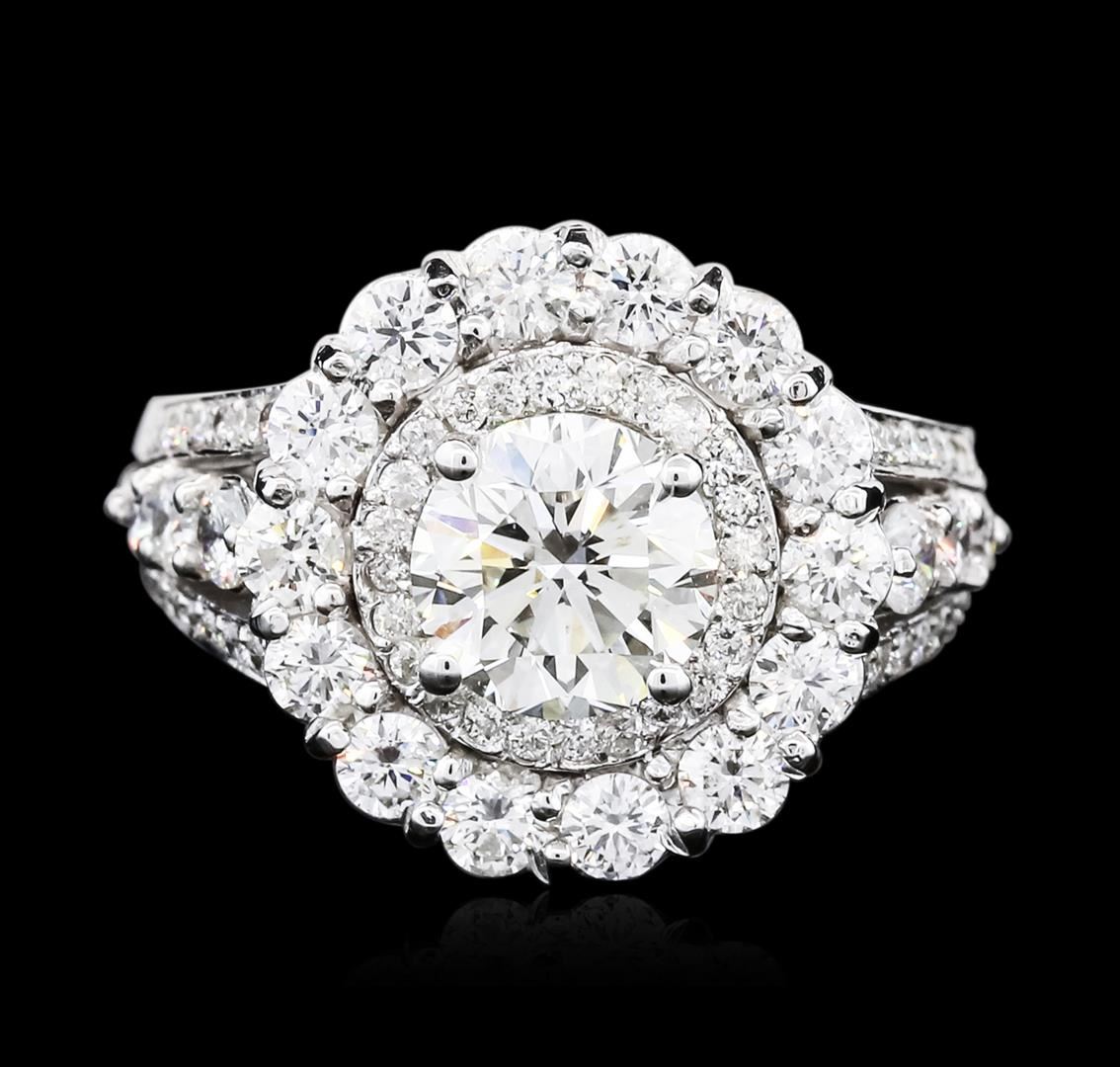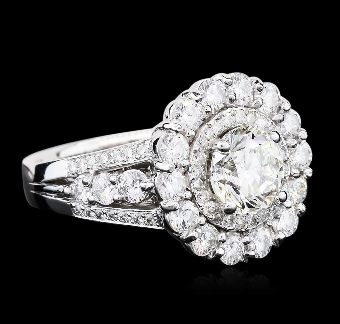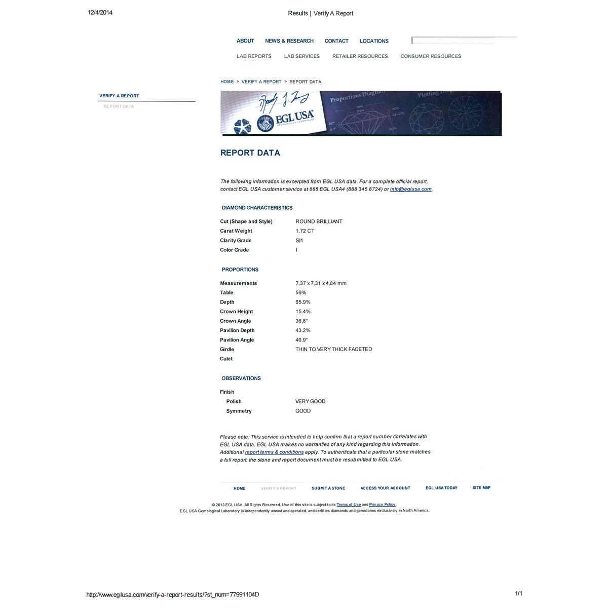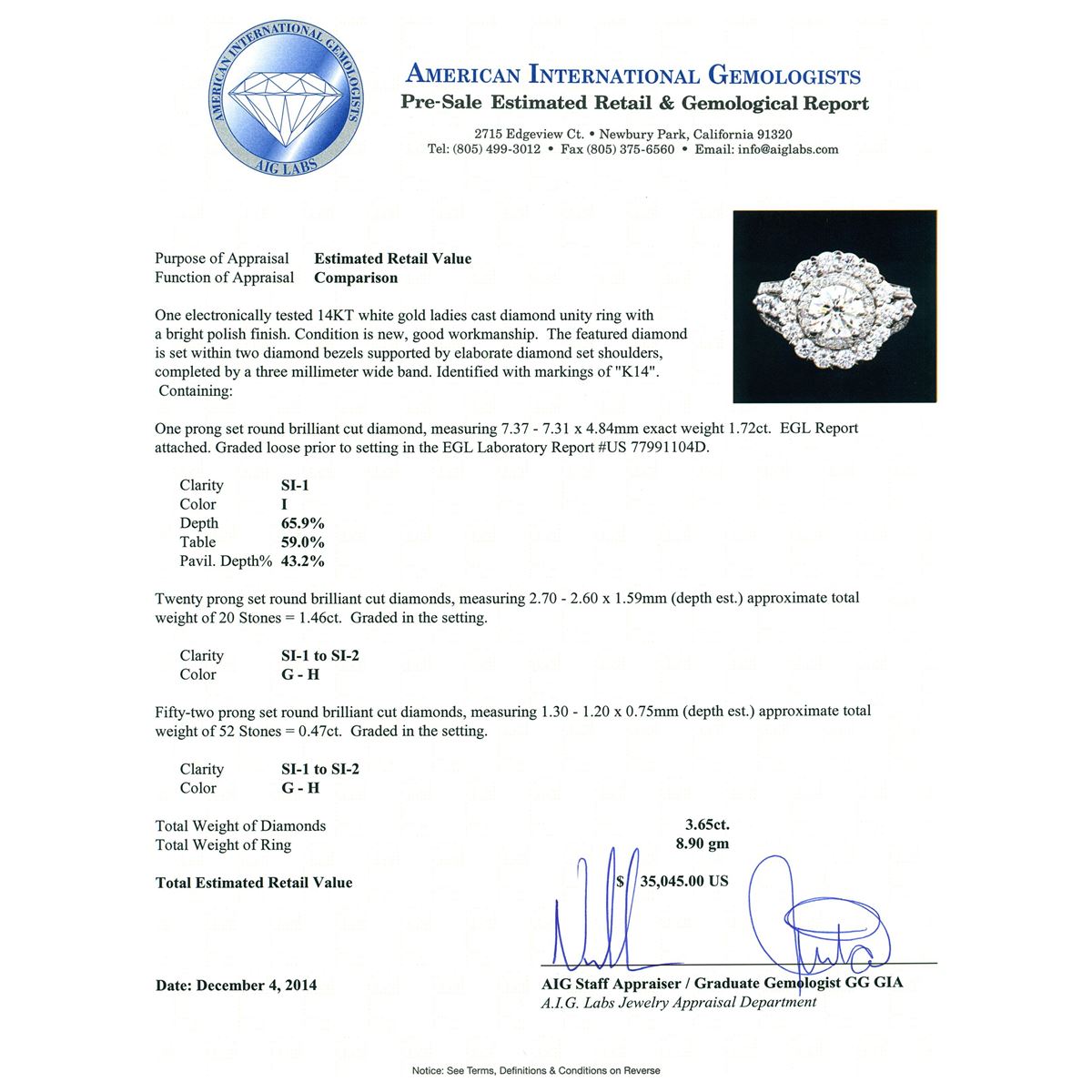 One electronically tested 14KT white gold ladies cast diamond unity ring with a bright polish finish. The featured diamond is set within two diamond bezels supported by elaborate diamond set shoulders, completed by a three millimeter wide band. Identified with markings of "K14". Condition is new, good workmanship. Containing: One prong set round brilliant cut diamond, measuring 7.37 - 7.31 x 4.84mm exact weight 1.72ct. EGL Report attached. Graded loose prior to setting in the EGL Laboratory Report #US 77991104D. Clarity: SI-1. Color: I. Depth 65.9%. Table 59.0%. Pavil. Depth% 43.2%. Twenty prong set round brilliant cut diamonds, measuring 2.70 - 2.60 x 1.59mm (depth est.) approximate total weight of 20 Stones = 1.46ct. Graded in the setting. Clarity: SI-1 to SI-2. Color: G - H Fifty-Two prong set round brilliant cut diamonds, measuring 1.30 - 1.20 x 0.75mm (depth est.) approximate total weight of 52 Stones = 0.47ct. Graded in the setting. Clarity: SI-1 to SI-2. Color: G - H. Total Weight of Diamonds 3.65ct. Total Weight of Ring 8.90 grams. AIG Appraised at $35,045.00.