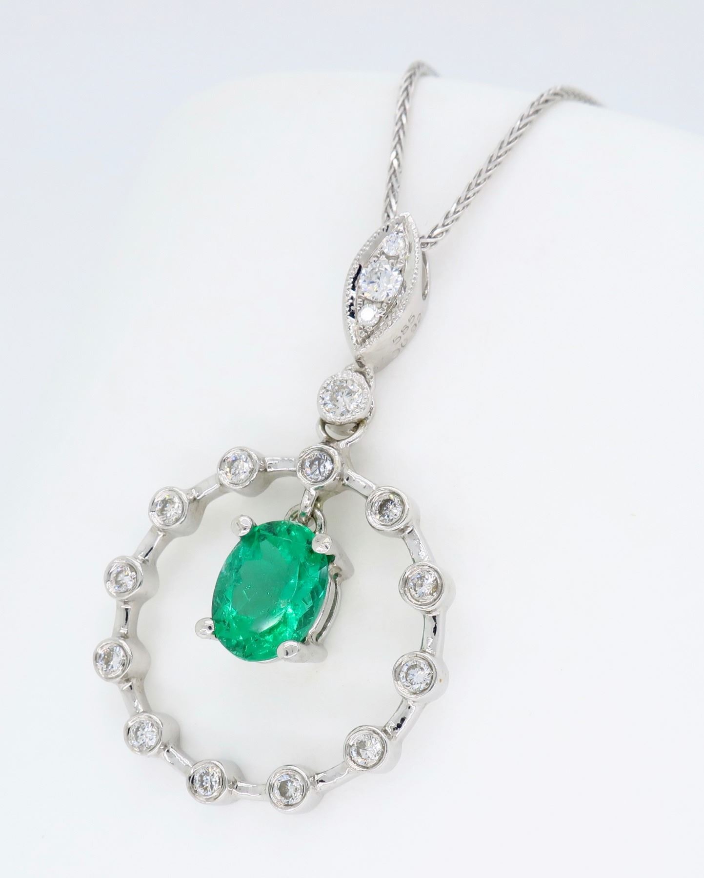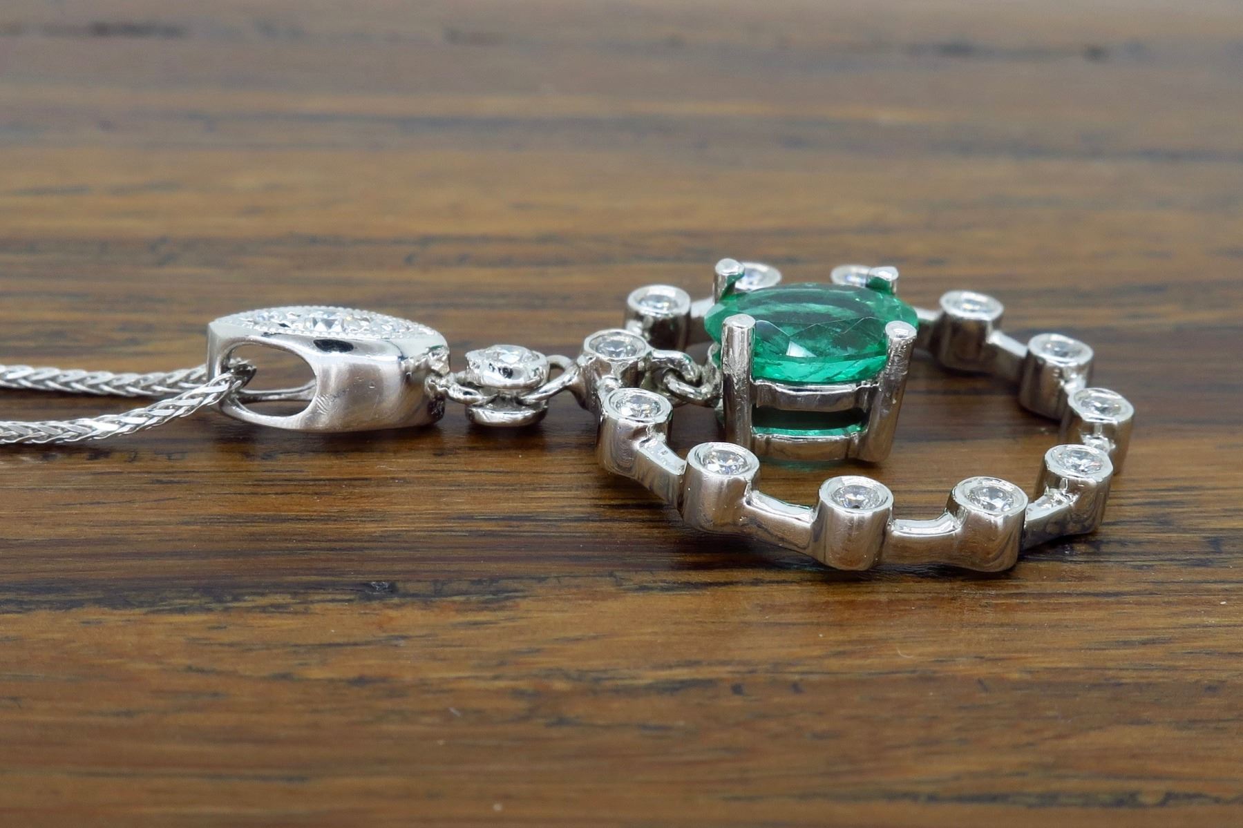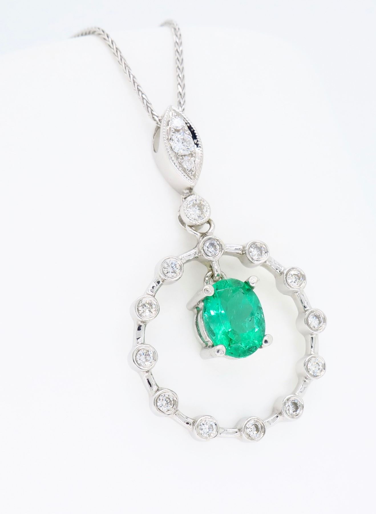 One 14KT White Gold Emerald and Diamond Pendant with Chain. (1) Oval shaped Emerald with a total weight of 0.92cts. (16) round Diamonds with a total weight of 0.32cts with a color of G-J and clarity of SI-2. Total weight of this pendant is 4.6 grams. Total length of this chain is 16 inches. Pendant length is 1.25 inches.