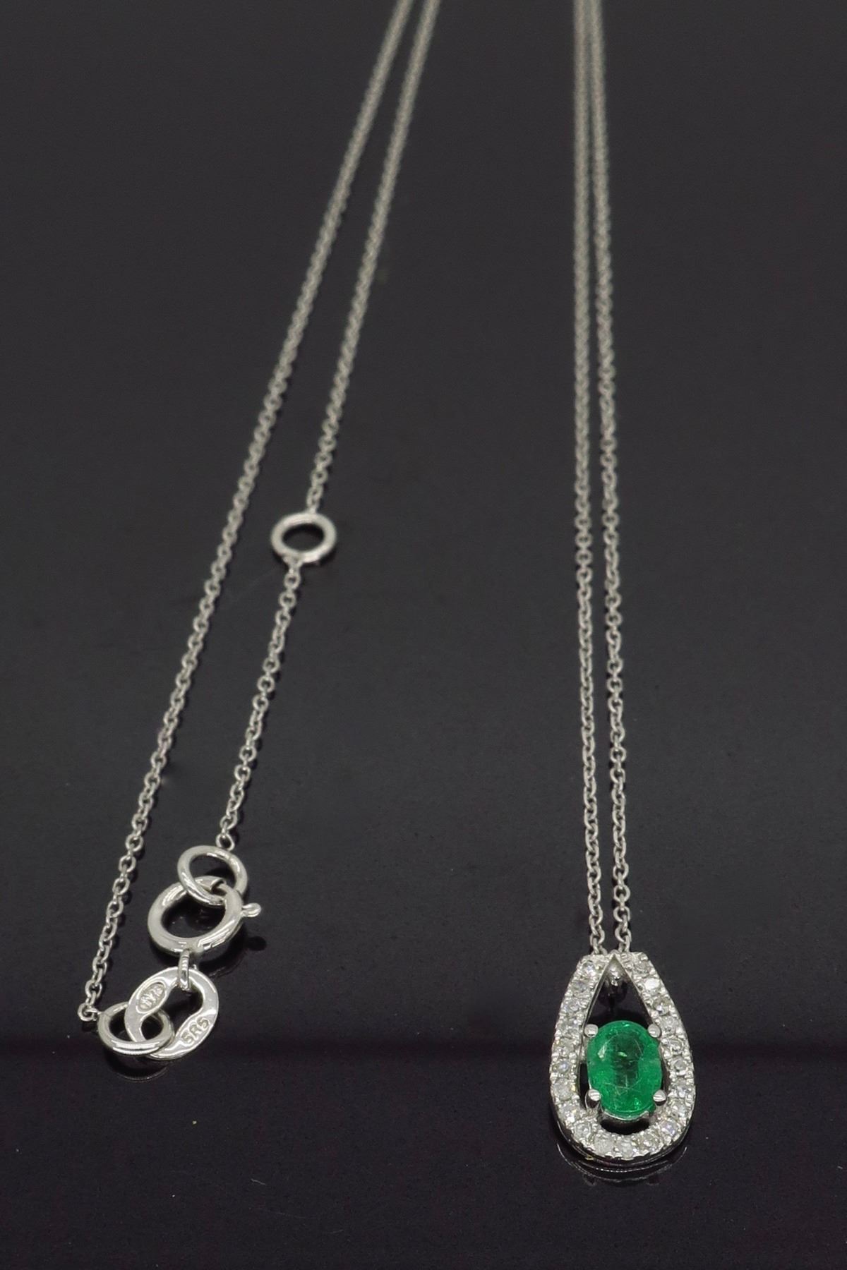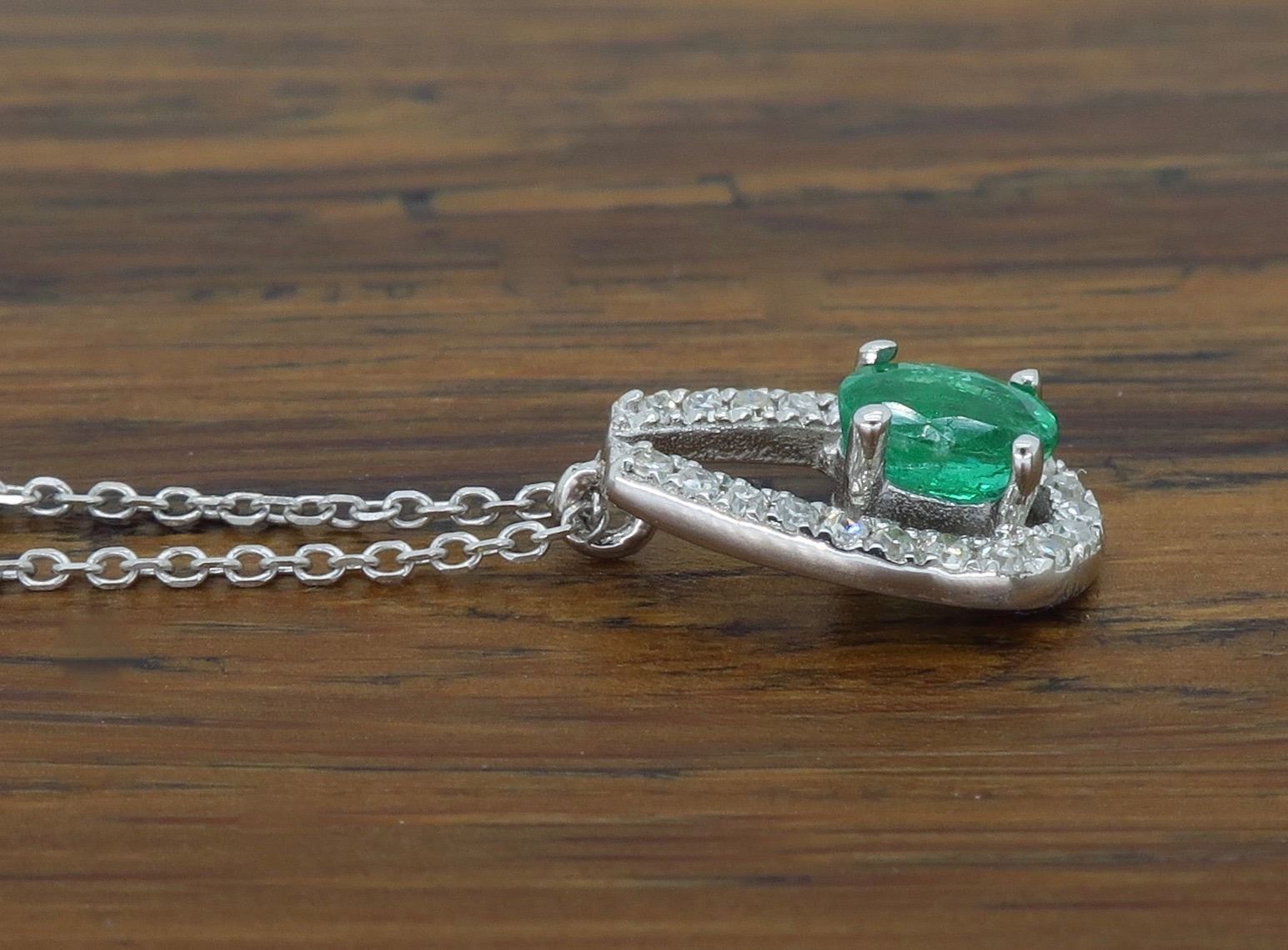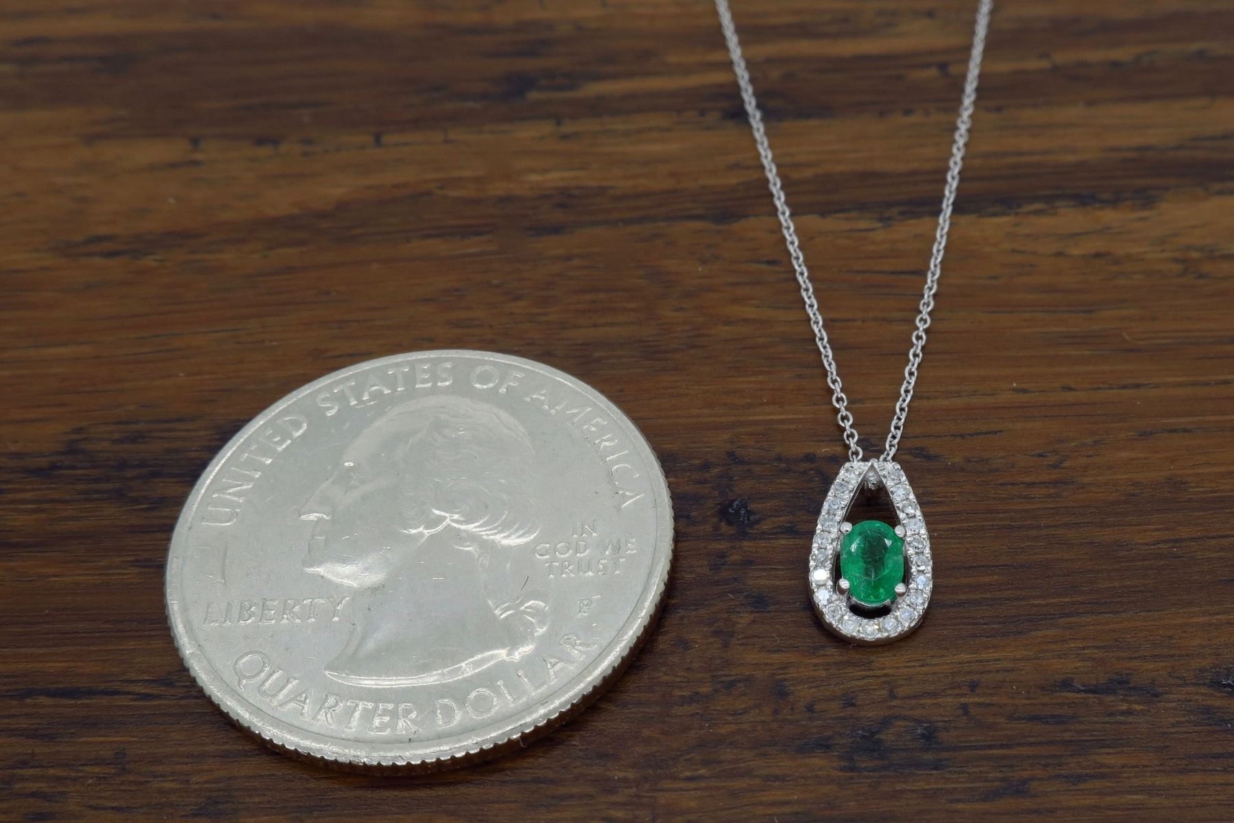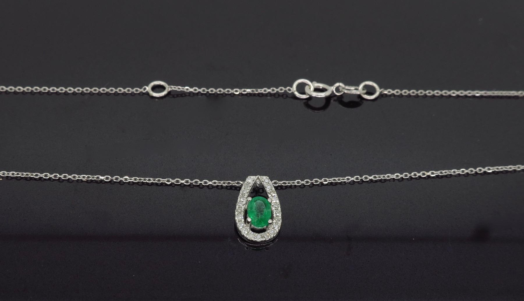 One 14KT White Gold Emerald and Diamond Pendant with Chain. (1) Oval Emerald measuring 4 x 3mm. (21) single cut Diamonds with a total weight of 0.08cts with a color of G-J and clarity of SI-2 to I-1. Total weight of this pendant is 1.3 grams. Adjustable chain from 15.5 inches to 16.5 inches long.