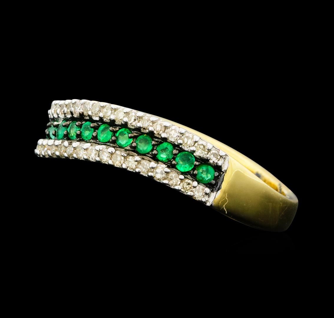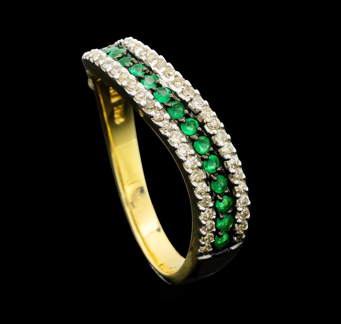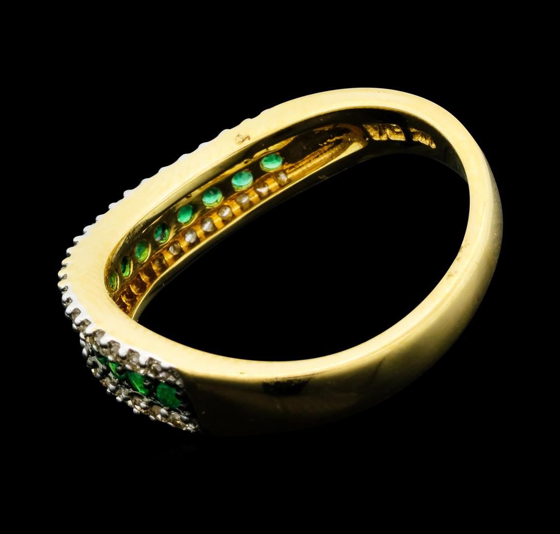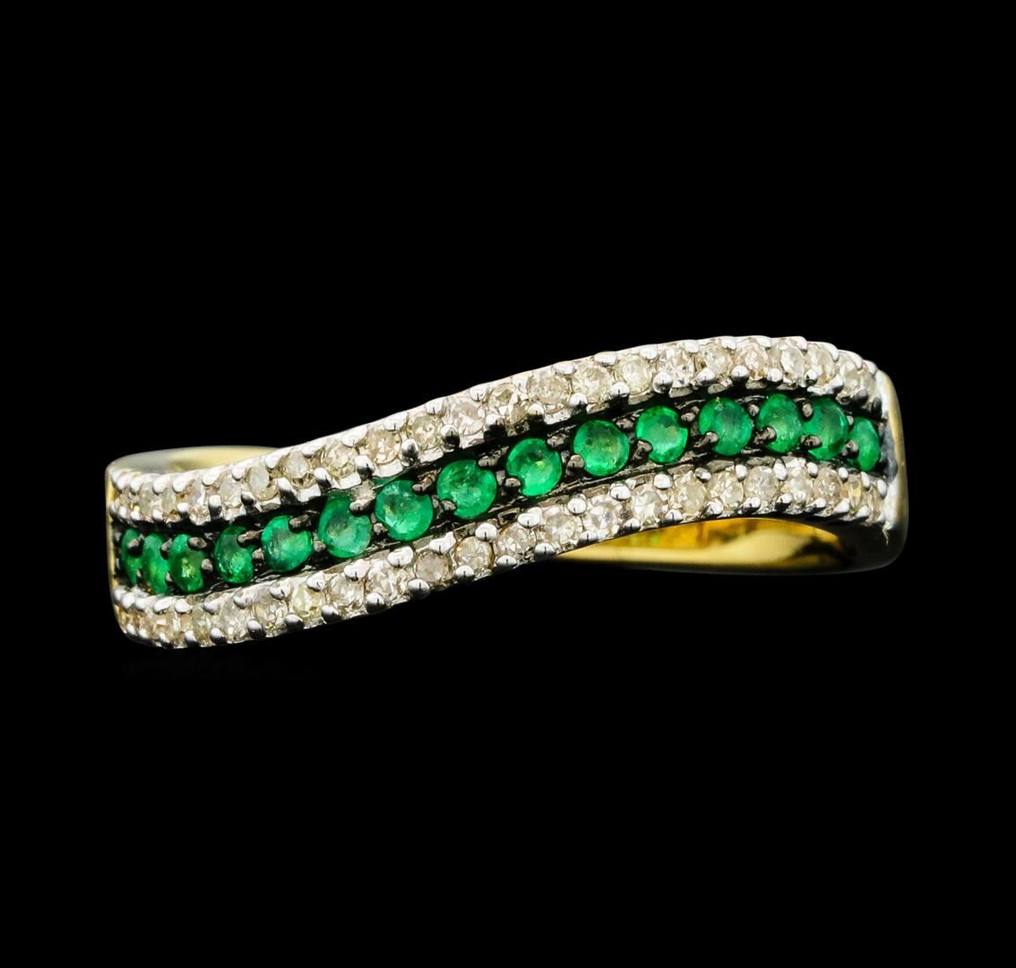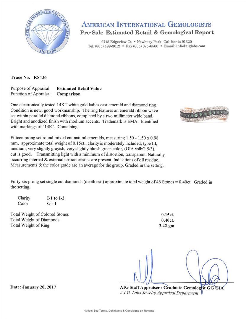 One electronically tested 14KT white gold ladies cast emerald and diamond ring. The ring features an emerald ribbon wave set within parallel diamond ribbons, completed by a two millimeter wide band. Bright and anodized finish with rhodium accents. Trademark is EMA. Identified with markings of "14K". Condition is new, good workmanship. Containing: Fifteen prong set round mixed cut natural emeralds, measuring 1.50 - 1.50 x 0.98 mm, approximate total weight of 0.15ct., clarity is moderately included, type III, medium, very slightly grayish, very slightly bluish green color, (GIA vslbG 5/3), cut is good. Transmitting light with a minimum of distortion, transparent. Naturally occurring internal & external characteristics are present. Indications of oil residue. Measurements & the color grade are an average for the group. Graded in the setting.Forty-Six prong set single cut diamonds (depth est.) approximate total weight of 46 Stones = 0.40ct. Graded in the setting. Clarity: I-1 to I-2. Color: G - I. Total Weight of Colored Stones 0.15ct. Total Weight of Diamonds 0.40ct. Total Weight of Ring 3.42gm. AIG Appraised.