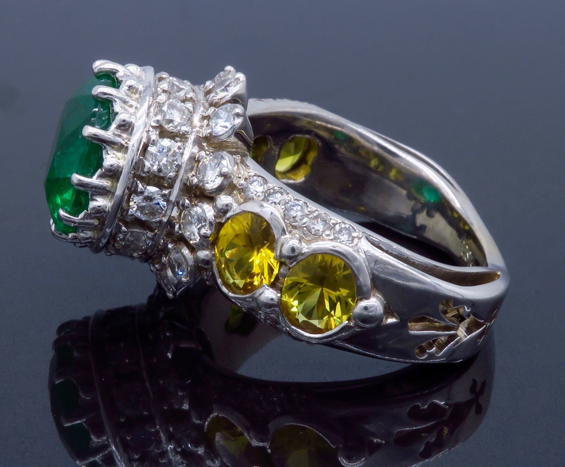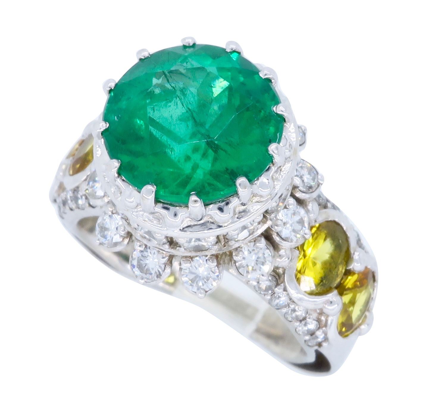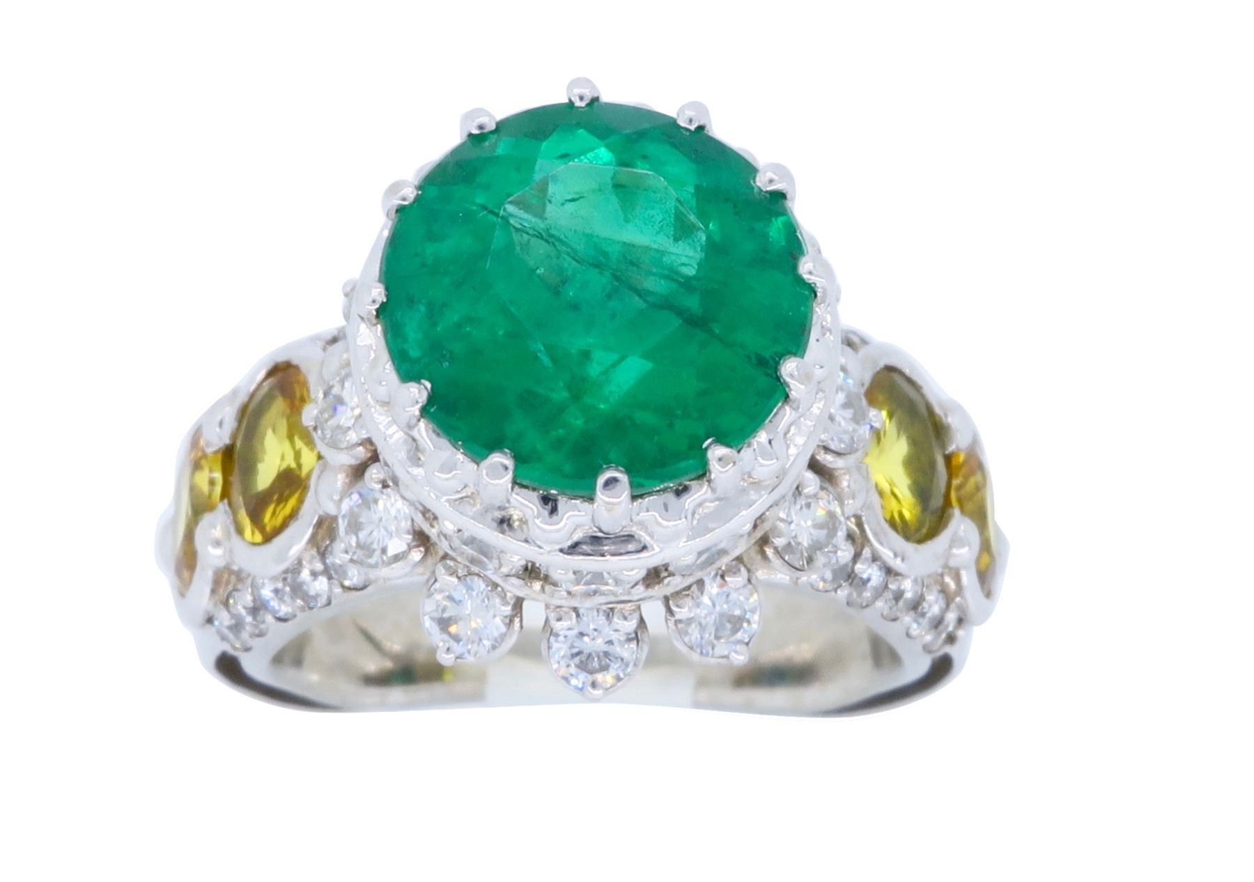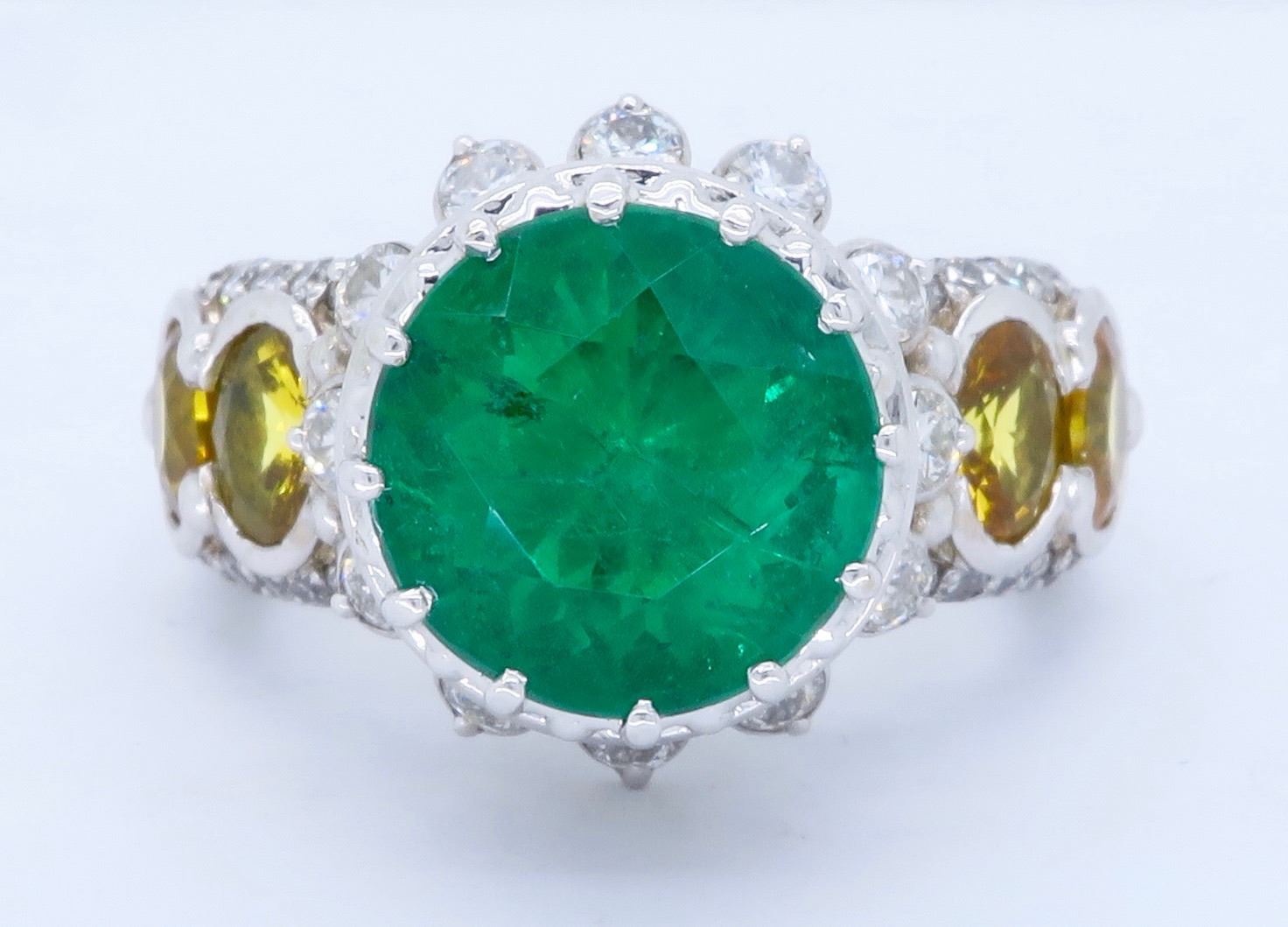 One 14KT White Gold Emerald and Diamond Ring. (1) 9.9MM Round Emerald. There is approximately 1.20CTW of diamonds adorning the ring. The diamonds display G-I color and VS2-SI2 clarity. To add a touch of uniqueness there are 4 additional round yellow stones flanking the featured emerald. Ring is a size 6 and weighs 11.4 grams.
