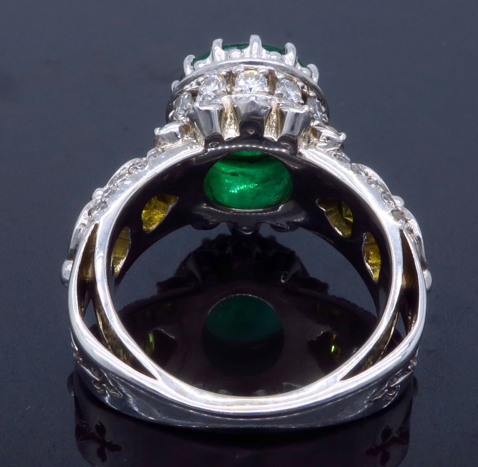 One 14KT White Gold Emerald and Diamond Ring. (1) 9.9MM Round Emerald. There is approximately 1.20CTW of diamonds adorning the ring. The diamonds display G-I color and VS2-SI2 clarity.  To add a touch of uniqueness there are 4 additional round yellow stones flanking the featured emerald. Ring is a size 6 and weighs 11.4 grams.
