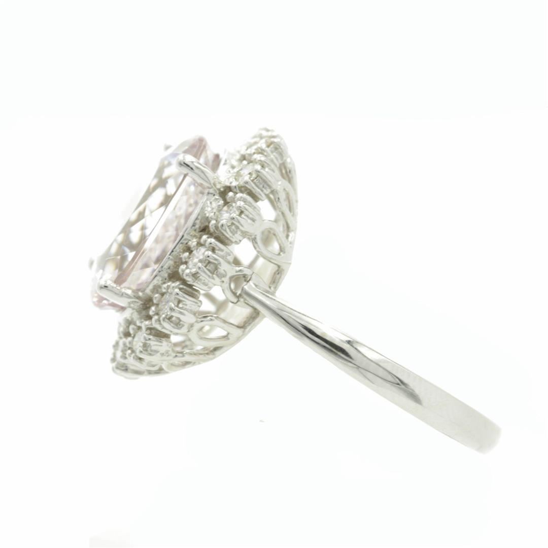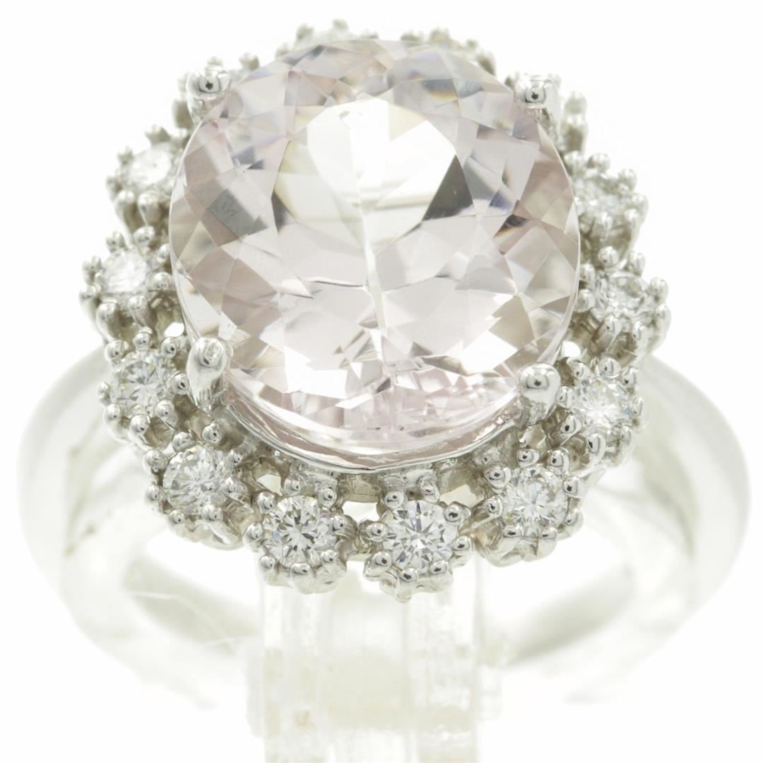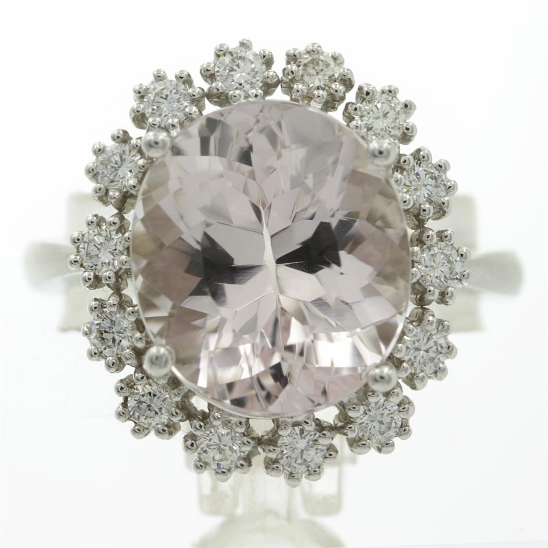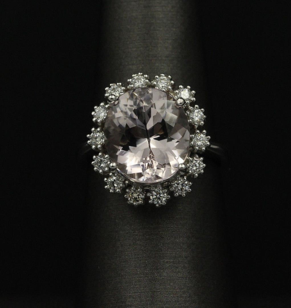 One Estate Bridal Oval Cut Morganite Ring and Round Cut Diamond in 14k Gold. Total carat weight of ring is 5.32 carats. Size 6.5 but resizable. Setting style is solitaire with accent. Gross weight is 5.72 grams with 15 total stones. Condition is brand new. Main stone is natural and non-enhanced. Main stone is 5.18 Ct, brilliant round cut shape, fine medium clarity, pink color, and very good cut. Side stone is natural and non-enhanced with a total of 0.14 Ct. Side diamond shape is brilliant round cut. Clarity is SI-1, color G-H, diamond cut is very good with a total of 14 side diamonds.