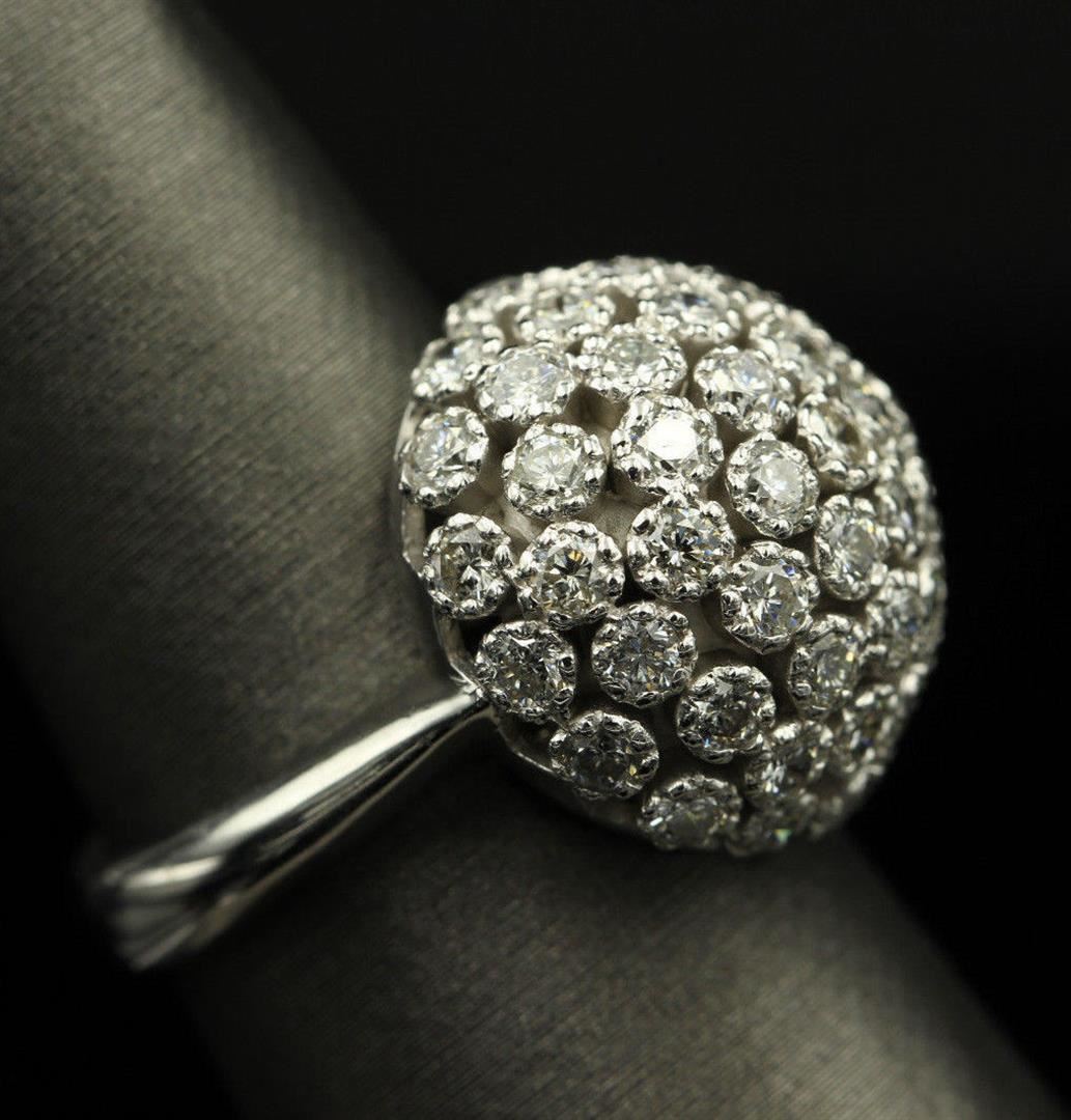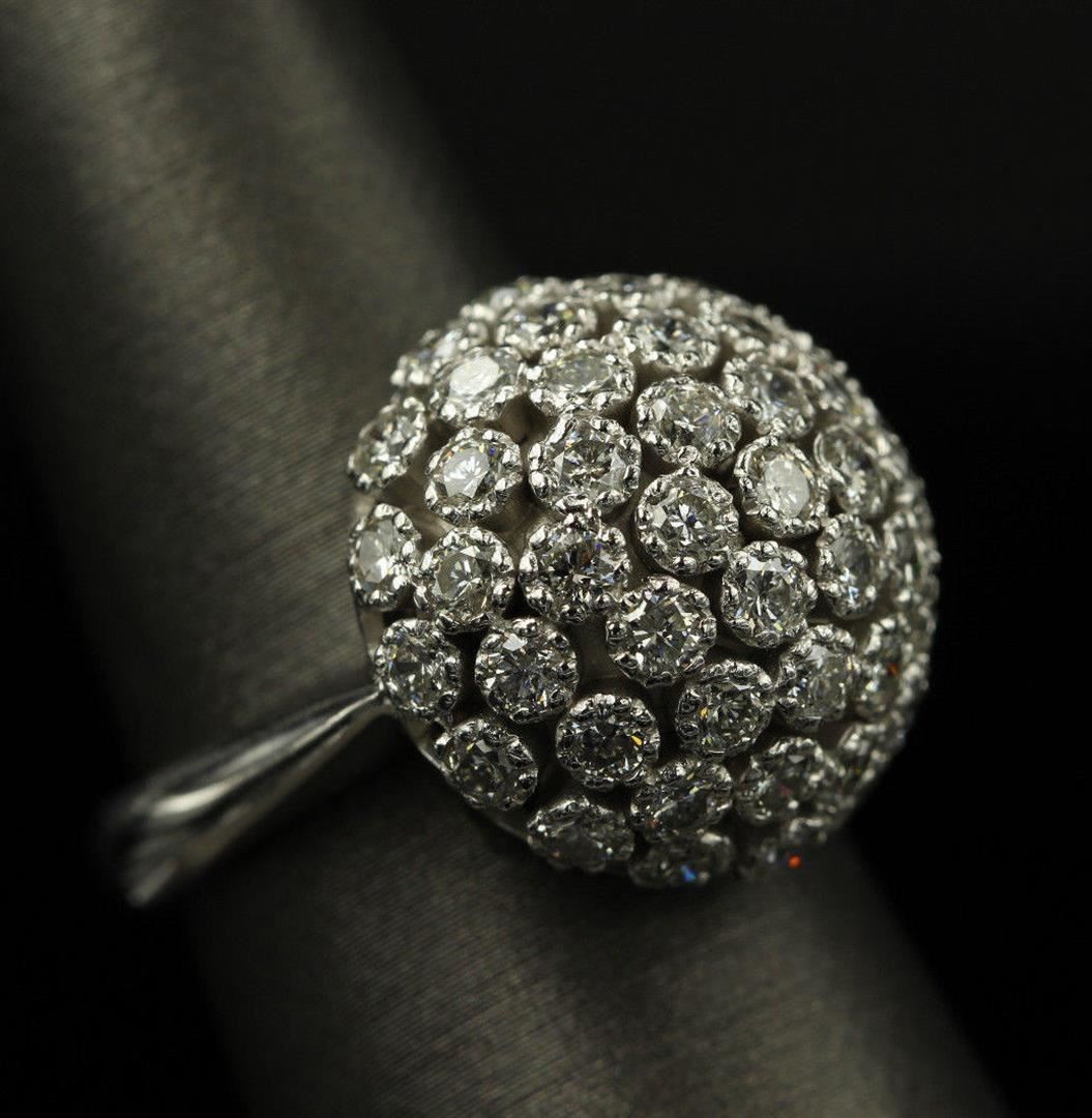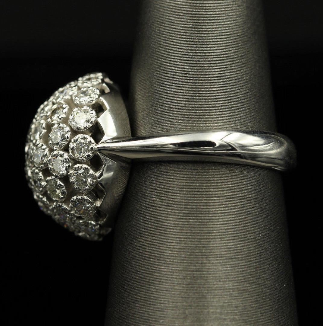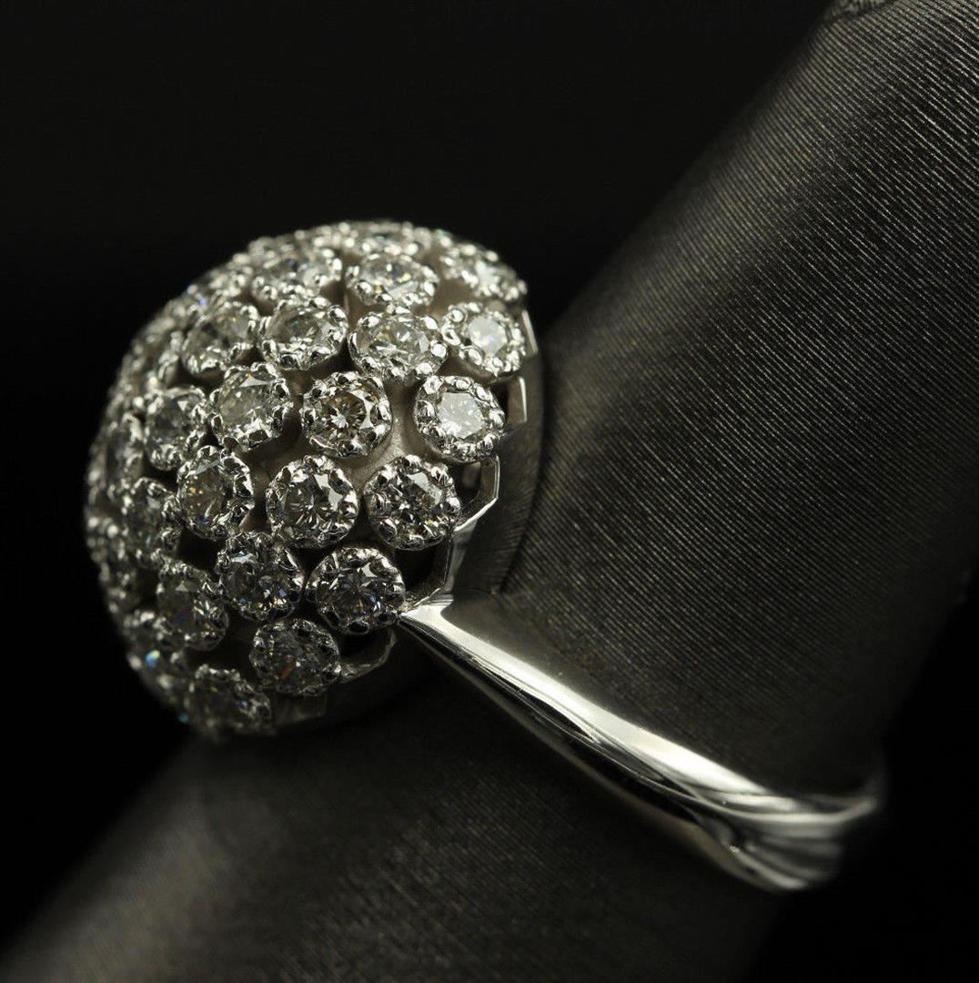 One Flower Design Ring in 14K White Gold. The total stone weight of this ring is 2.50 Ct. Size 6 but can be resized. Setting style is fashion. Gold weight is10.58 grams with a total of 50 stones. Condition is brand new. Main stone is natural and non-enhanced, round brilliant cut, clarity SI1, G-H color, and excellent cut.