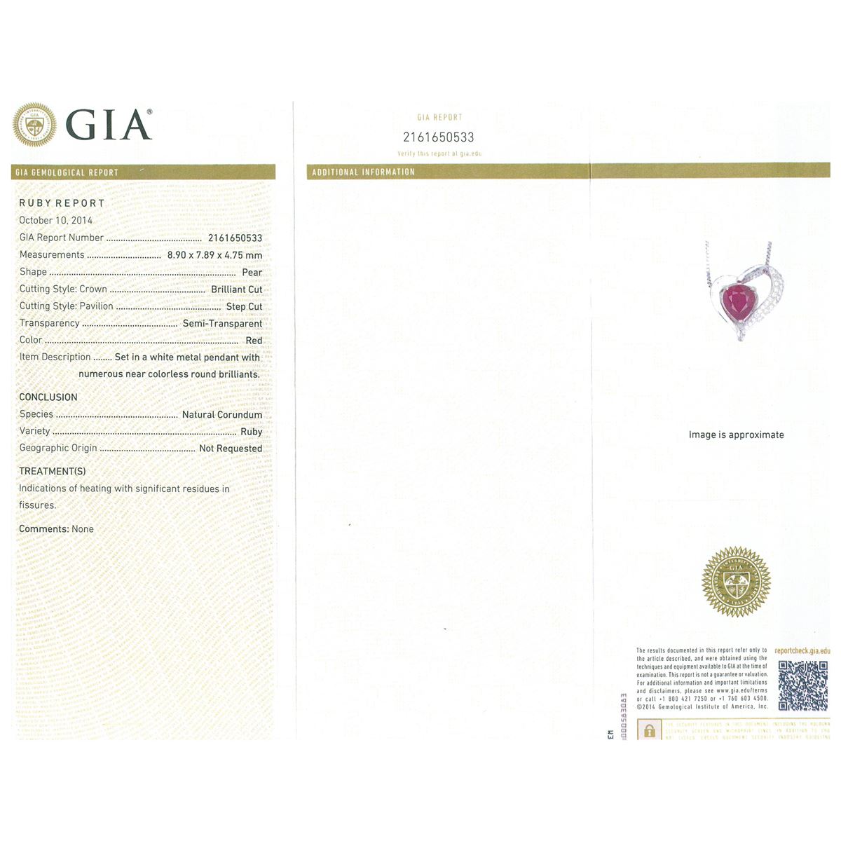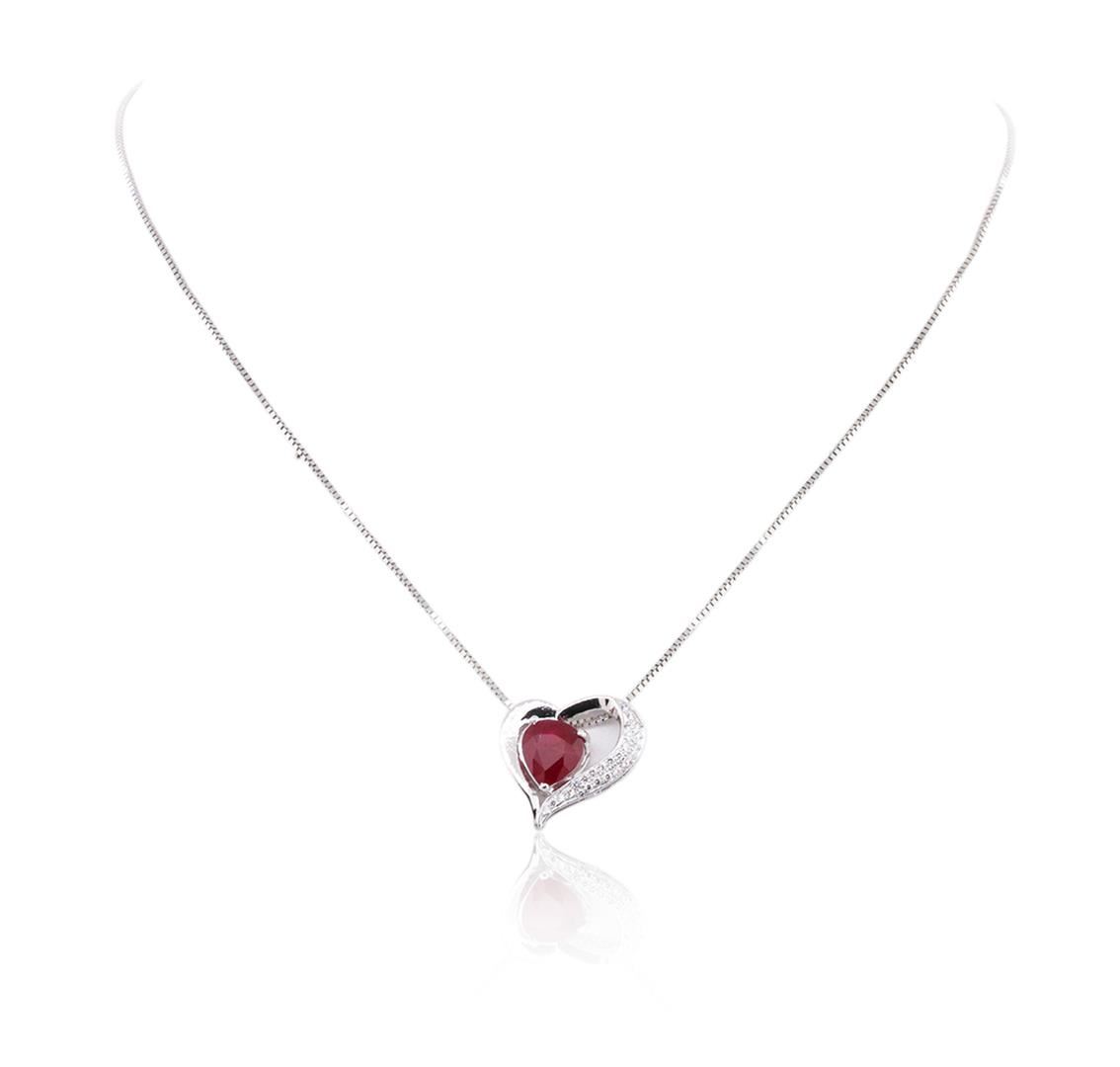One electronically tested 14KT white gold ladies cast & assembled ruby and diamond pendant with chain. The pendant features a ruby set within a stylized diamond accented heart design, completed by a hidden bail. The pendant is supported by a sixteen inch length 14KT white gold designer style chain, terminating in a spring ring clasp. Bright polish finish. Condition is new, good workmanship. Containing: One prong set pear mixed cut natural ruby, measuring 8.90 x 7.89 x 4.75mm, 6% bulge factor, approximate weight of 2.83ct., clarity is heavily included, type II, dark, very slightly brownish, red color, (GIA R 7/3), cut is good. Transmitting light somewhat diffusely, transparent to translucent. Naturally occurring internal& external characteristics are present. Indications of heating with significant residues in fissures. GIA Ruby Report attached. Graded in the GIA Laboratory, Report #2161650533.Twenty-Five bead set round brilliant cut diamonds, measuring 1.30 - 1.20 x 0.75mm (depth est.) approximate total weight of 25 Stones = 0.27ct. Graded in the setting. Clarity: VVS-2 to VS-1. Color: G - I. Total Weight of Colored Stones 2.83ct. Total Weight of Diamonds 0.27ct. Total Weight of Pendant With Chain 5.32 grams. AIG Appraised at $2,800.00.