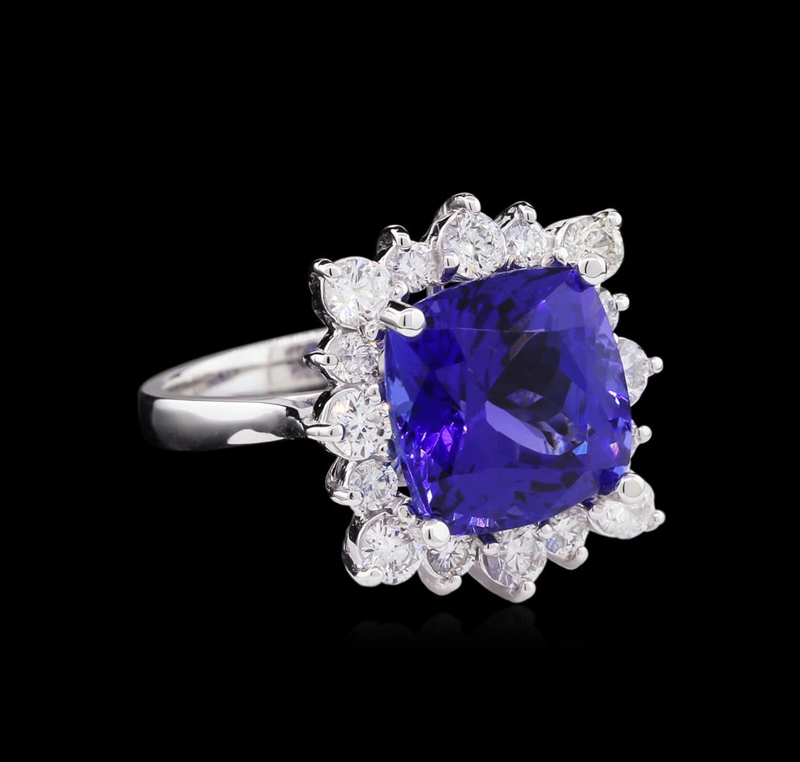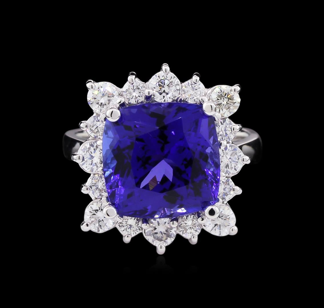 One electronically tested 14KT white gold ladies cast tanzanite and diamond ring with a bright polish finish. Condition is new, good workmanship. The featured tanzanite is set within a diamond lattice gallery, completed by a two and one-half millimeter wide band. Identified with markings of "K14". Containing: One prong set square cushion modified brilliant cut natural tanzanite, measuring 11.25 x 11.20 x 7.90mm, exact weight 7.53ct., clarity is eye clean, type I, medium dark, moderately strong, bluish violet color, (GIA bV 6/4), cut is good. Transmitting light with no distortion, transparent. GIA Gemological Report attached. Graded loose prior to setting in the GIA Laboratory, Report # 6167097858.Tanzanite is a very rare gemstone that is only found in the country of Tanzania. Originally discovered in 1967. Tiffany & Company, named the stone Tanzanite. It is found in the Usumburu Mountains that border the Umba Valley of northern Tanzania. Tanzanite occurs in gray, brown, violet, blue, reddish-purple, & green. The gem is interesting because of its exceptional pleochroism. Rotated in different directions a tanzanite will exhibit multiple changes of color. Tanzanite has a low tolerance to ultrasonic cleaning, and should not be cleaned using this method. Sixteen prong set round brilliant cut diamonds, measuring 3.00 - 2.30 x 1.59mm (depth est.) approximate total weight of 16 Stones = 1.26ct. Graded in the setting. Clarity: SI-2 to I-1 . Color: F - H. Total Weight of Colored Stones 7.53ct. Total Weight of Diamonds 1.26ct. Total Weight of Ring 6.80 grams. AIG Appraised at $25,545.00.