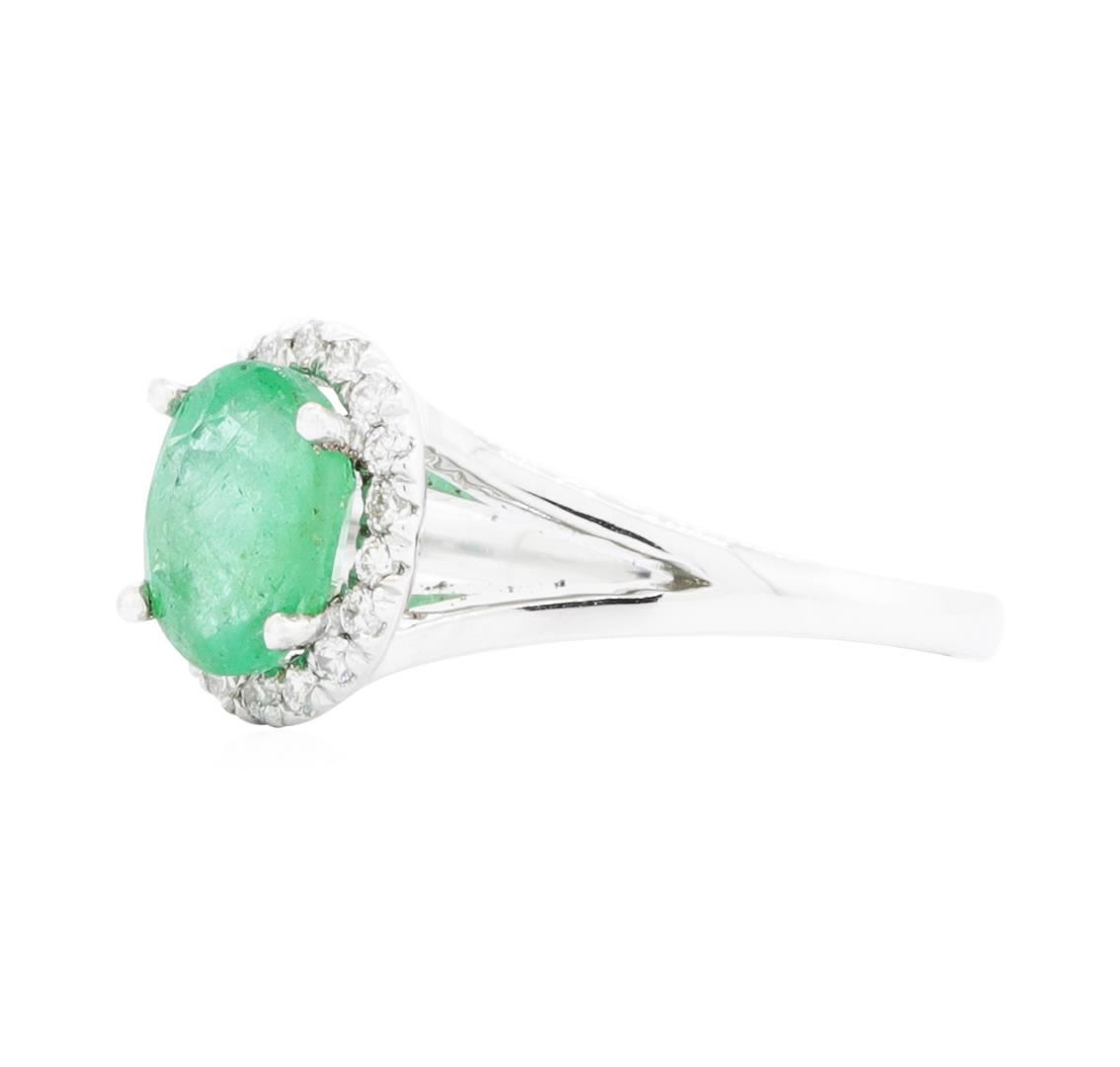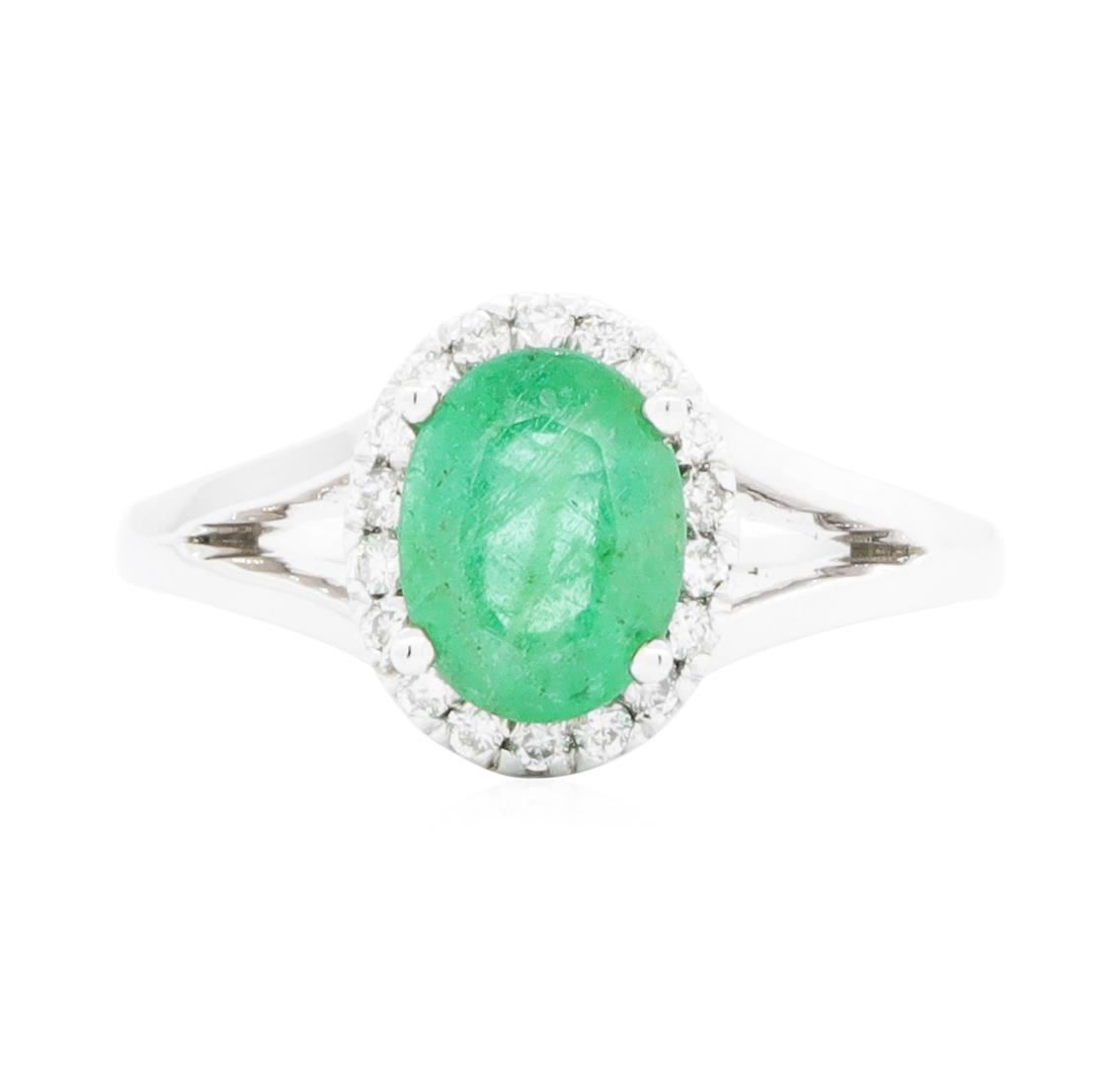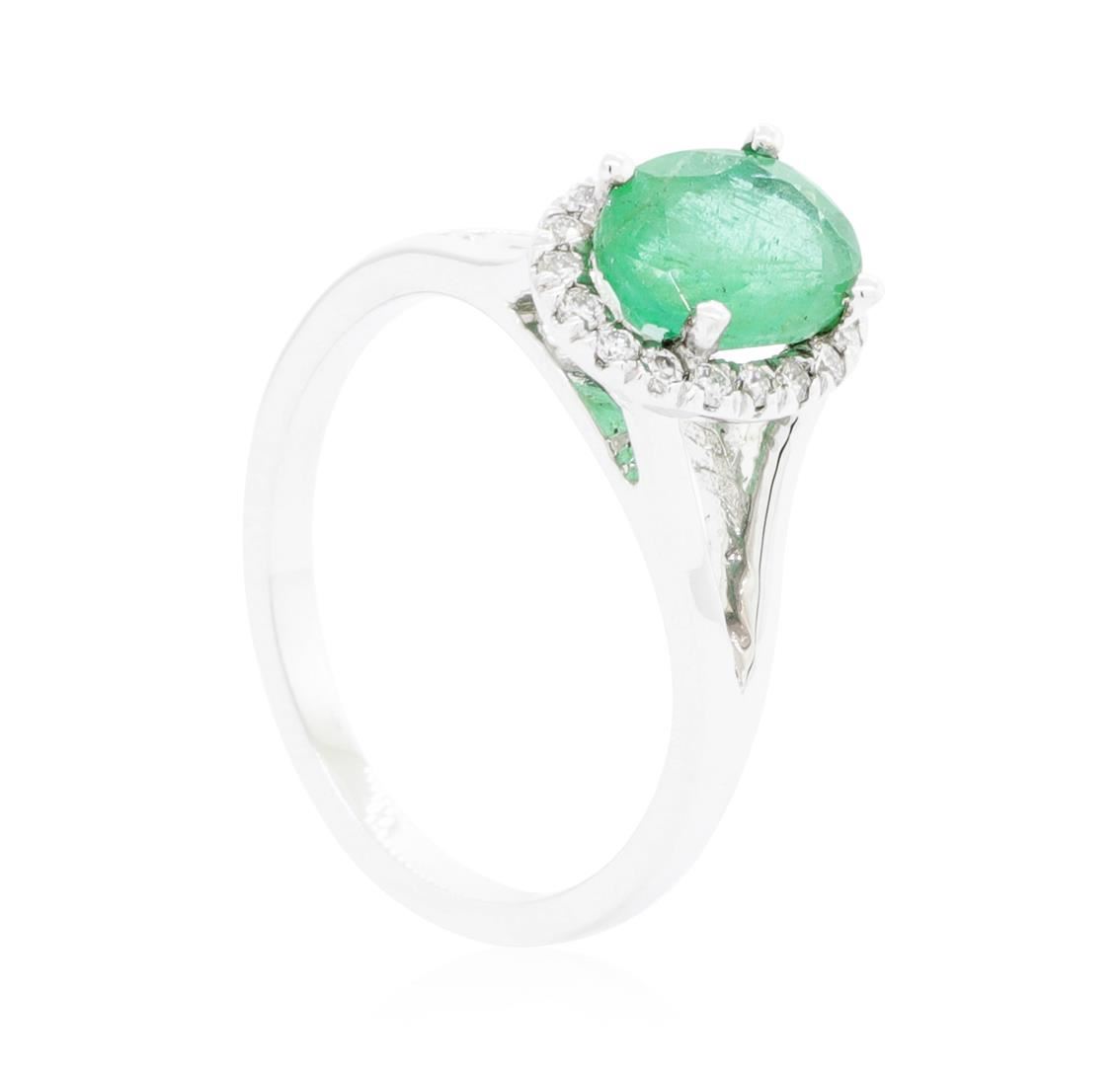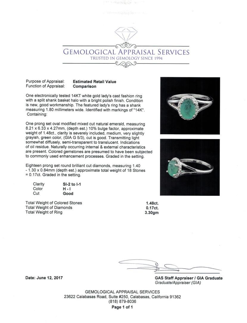 One electronically tested 14KT white gold lady's cast fashion ring with a split shank basket halo with a bright polish finish. The featured lady's ring has a shank measuring 1.80 millimeters wide. Identified with markings of '14K'. Condition is new, good workmanship. Containing: One prong set oval modified mixed cut natural emerald, measuring 8.21 x 6.33 x 4.27mm, (depth est.) 10%. bulge factor, approximate weight of 1.48ct., clarity is severely included, medium, very slightly grayish, green color, (GIA G 5/3), cut is good. Transmitting light somewhat diffusely, semi-transparent to translucent. Indications of oil residue. Naturally occurring internal & external characteristics are present. Colored gemstones are presumed to have been subjected to commonly used enhancement processes. Graded in the setting. Eighteen prong set round brilliant cut diamonds, measuring 1.40 - 1.30 x 0.84mm (depth est.) approximate total weight of 18 Stones = 0.17ct. Graded in the setting. Color H - I Clarity SI-2 to I-1 Cut Good. Total Weight of Colored Stones 1.48ct.. Total Weight of Diamonds 0.17ct.. Total Weight of Ring 3.30gm GAS Appraised.