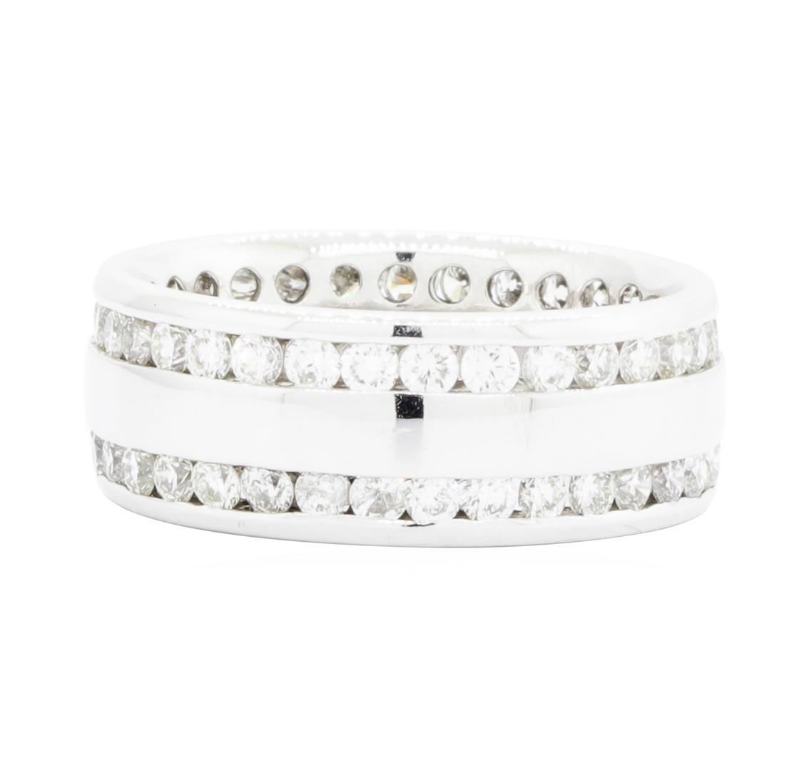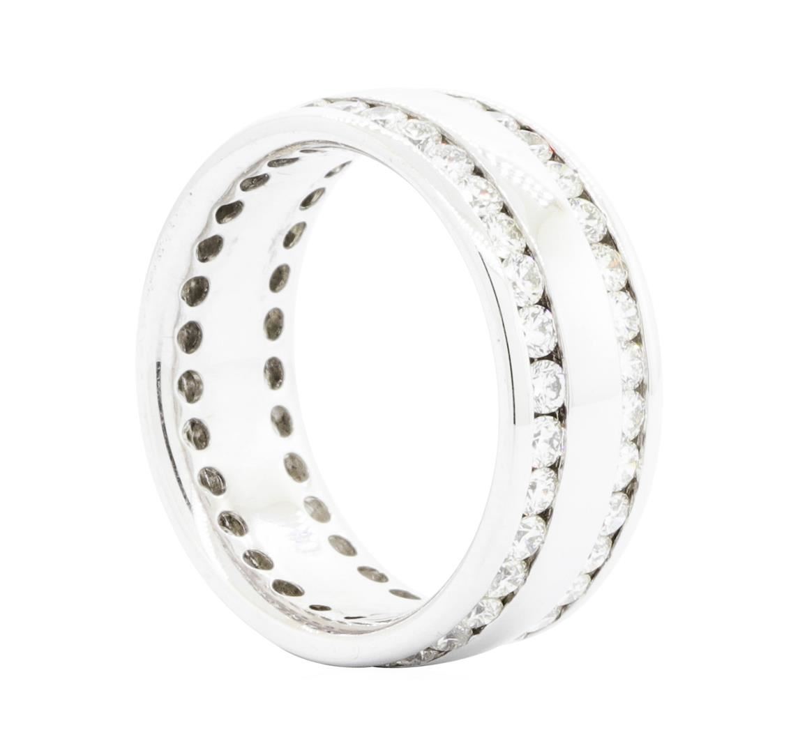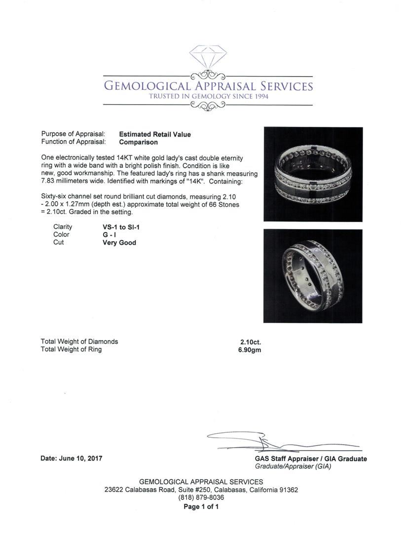 One electronically tested 14KT white gold lady's cast double eternity ring with a wide band with a bright polish finish. The featured lady's ring has a shank measuring 7.83 millimeters wide. Identified with markings of '14K'. Condition is like new, good workmanship. Containing: Sixty-Six channel set round brilliant cut diamonds, measuring 2.10 - 2.00 x 1.27mm (depth est.) approximate total weight of 66 Stones = 2.10ct. Graded in the setting. Color G - I Clarity VS-1 to SI-1 Cut Very Good. Total Weight of Diamonds 2.10ct.. Total Weight of Ring 6.90gm GAS Appraised.