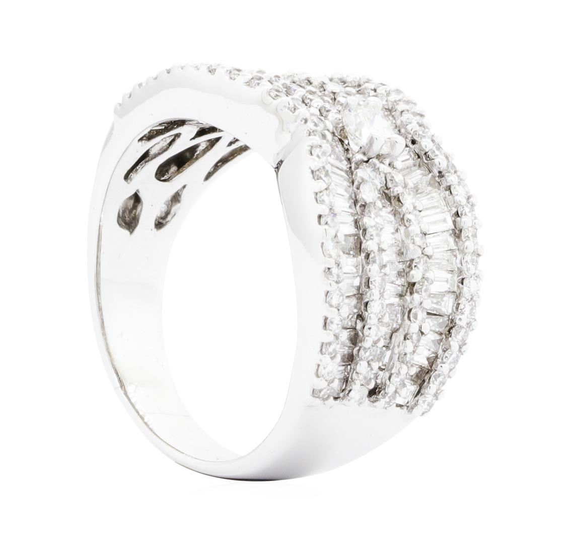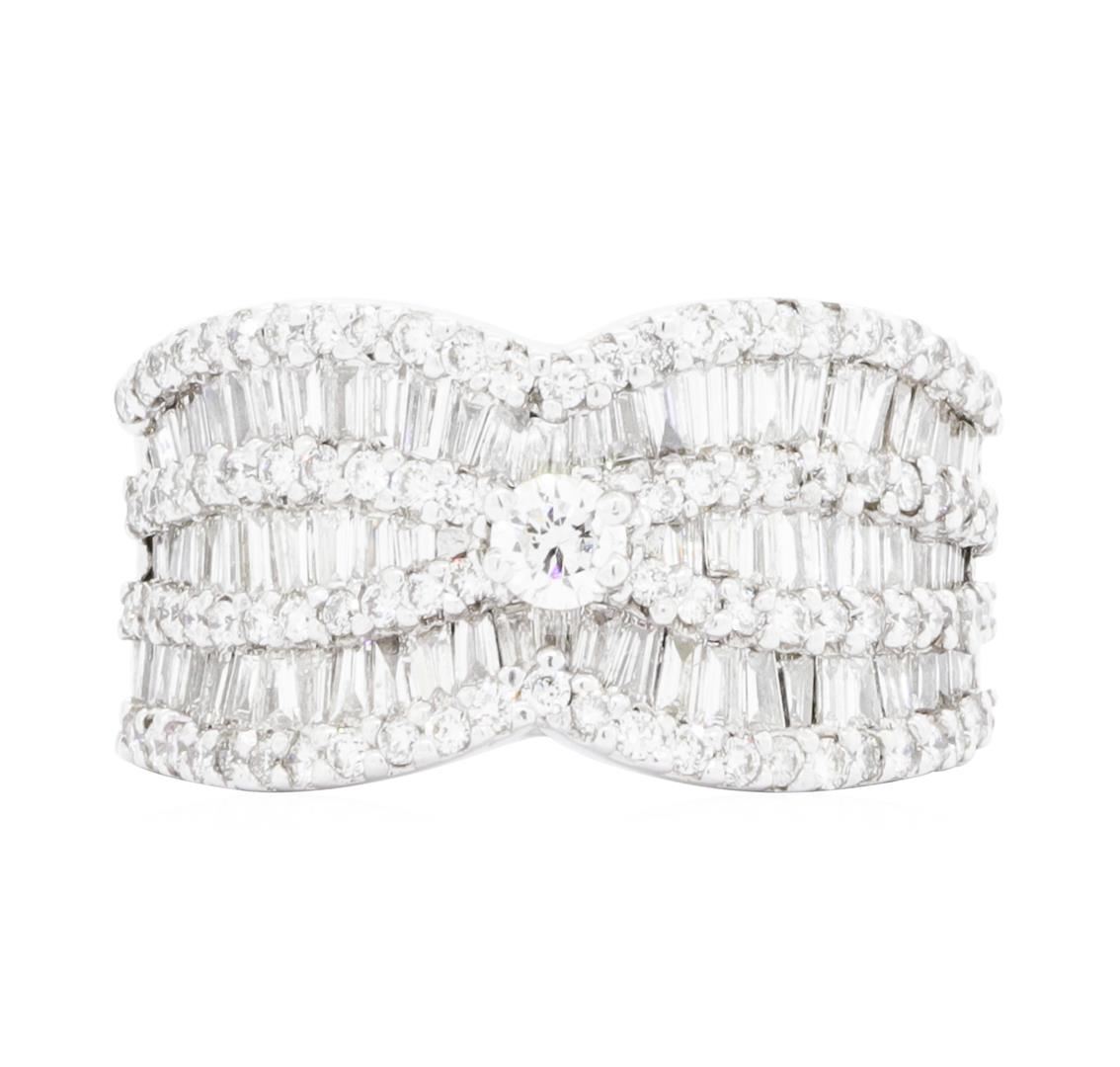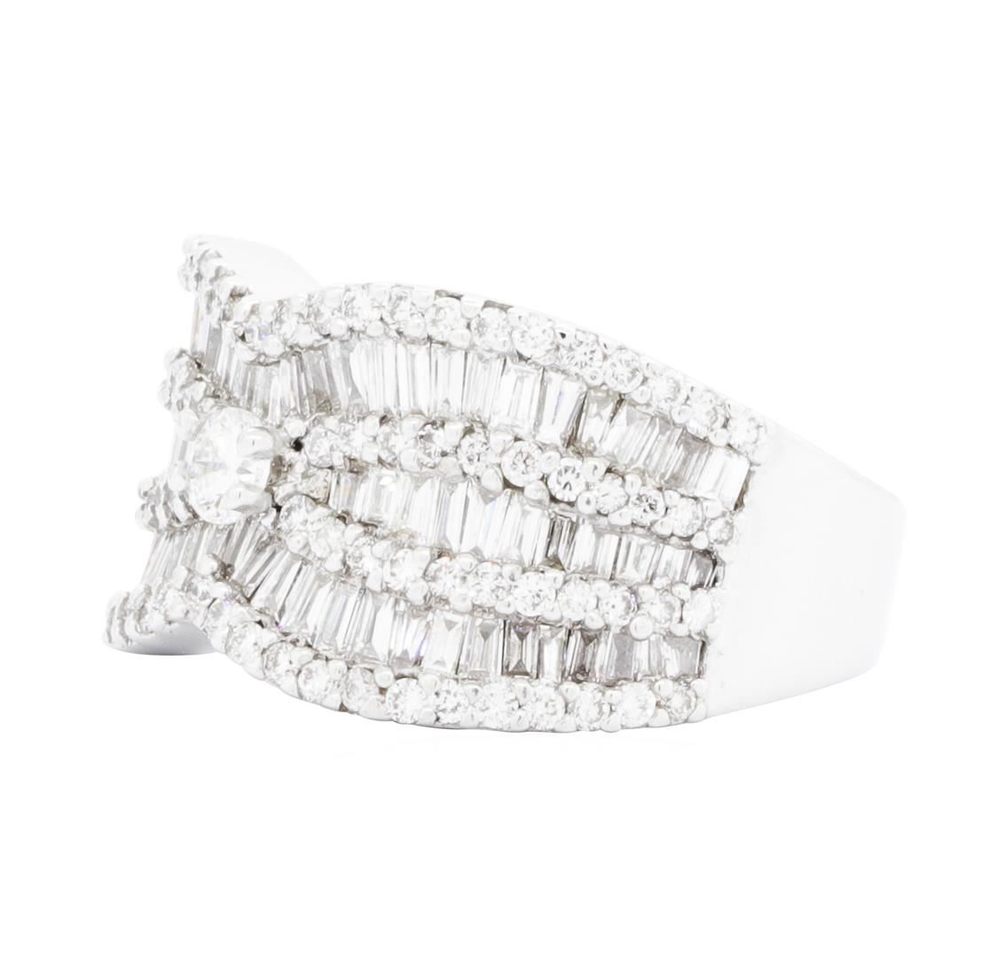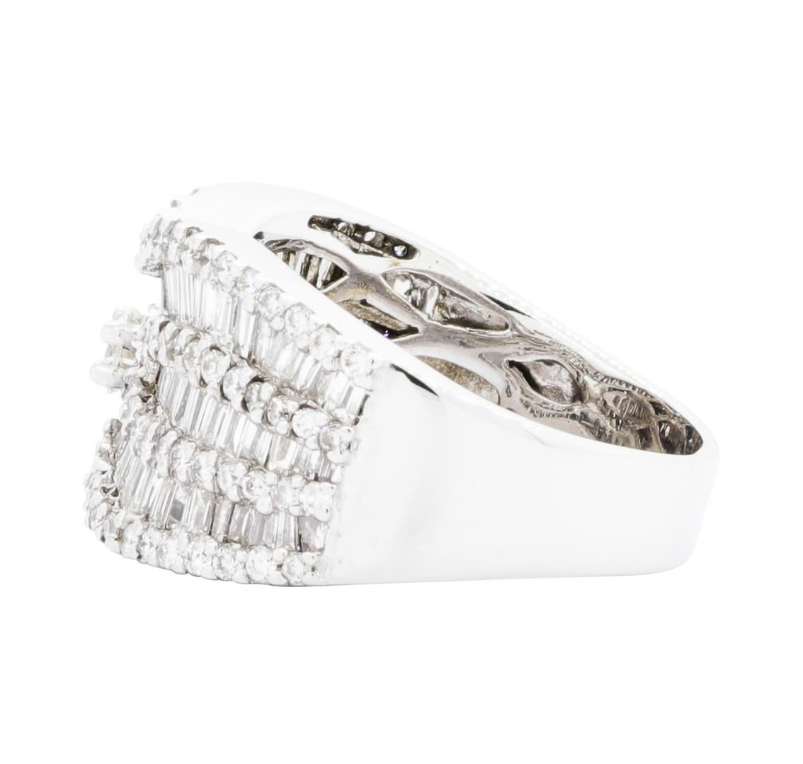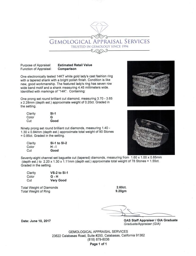 One electronically tested 14KT white gold lady's cast fashion ring with a tapered shank with a bright polish finish. The featured lady's ring has seven row wide band motif and a shank measuring 4.45 millimeters wide. Identified with markings of '14K'. Condition is like new, good workmanship. Containing: One prong set round brilliant cut diamond, measuring 3.70 - 3.65 x 2.28mm (depth est.) approximate weight of 0.20ct. Graded in the setting. Color G Clarity SI-1 Cut Good Ninety prong set round brilliant cut diamonds, measuring 1.40 - 1.30 x 0.84mm (depth est.) approximate total weight of 90 Stones = 0.85ct. Graded in the setting. Color H - I Clarity SI-1 to SI-2 Cut Good Seventy-Eight channel set baguette cut (tapered) diamonds, measuring from 1.60 x 1.00 x 0.85mm (depth est.) to 2.20 x 1.30 x 1.11mm (depth est.) approximate total weight of 78 Stones = 1.55ct. Graded in the setting. Color G - H Clarity VS-2 to SI-1 Cut Very Good. Total Weight of Diamonds 2.60ct.. Total Weight of Ring 9.20gm GAS Appraised.