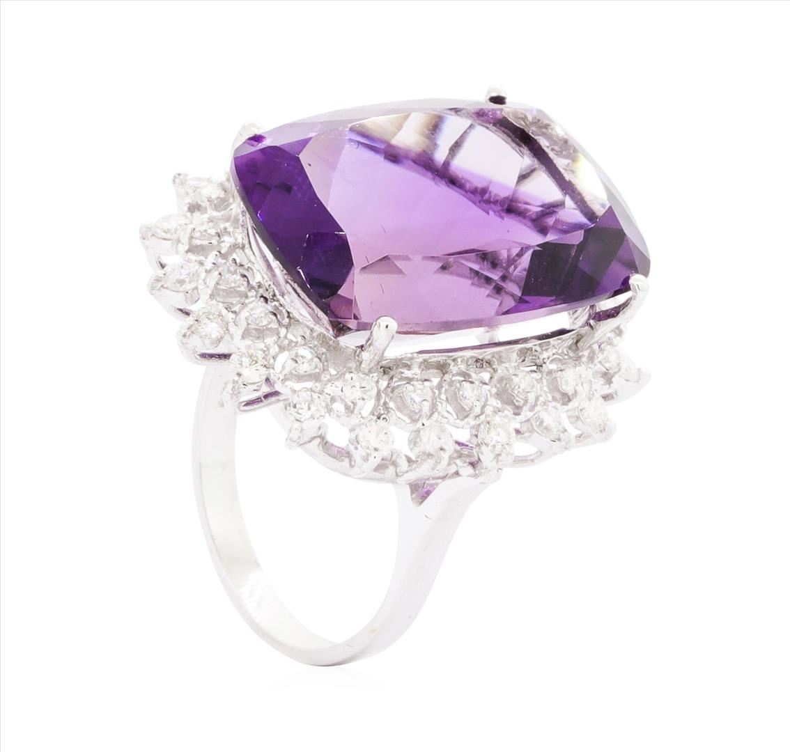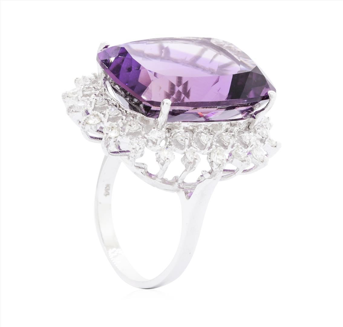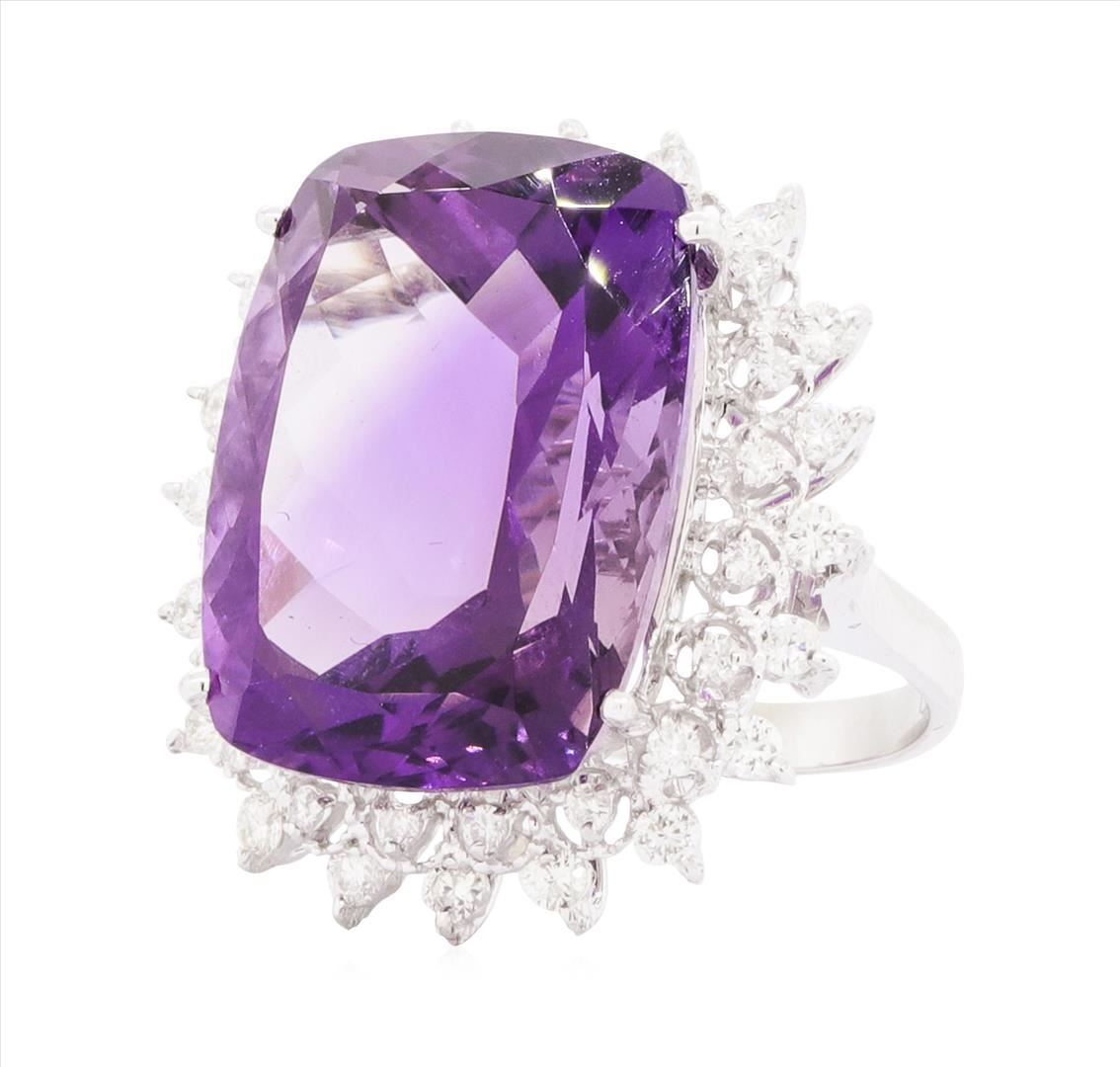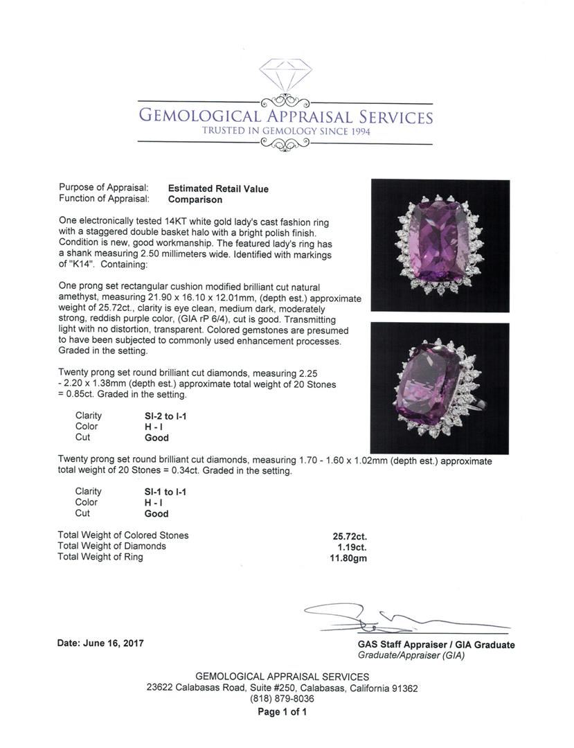 One electronically tested 14KT white gold lady's cast fashion ring with a staggered double basket halo with a bright polish finish. The featured lady's ring has a shank measuring 2.50 millimeters wide. Identified with markings of 'K14'. Condition is new, good workmanship. Containing: One prong set rectangular cushion modified brilliant cut natural amethyst, measuring 21.90 x 16.10 x 12.01mm, (depth est.) approximate weight of 25.72ct., clarity is eye clean, medium dark, moderately strong, reddish purple color, (GIA rP 6/4), cut is good. Transmitting light with no distortion, transparent. Colored gemstones are presumed to have been subjected to commonly used enhancement processes. Graded in the setting. Twenty prong set round brilliant cut diamonds, measuring 2.25 - 2.20 x 1.38mm (depth est.) approximate total weight of 20 Stones = 0.85ct. Graded in the setting. Color H - I Clarity SI-2 to I-1 Cut Good Twenty prong set round brilliant cut diamonds, measuring 1.70 - 1.60 x 1.02mm (depth est.) approximate total weight of 20 Stones = 0.34ct. Graded in the setting. Color H - I Clarity SI-1 to I-1 Cut Good. Total Weight of Colored Stones 25.72ct.. Total Weight of Diamonds 1.19ct.. Total Weight of Ring 11.80gm GAS Appraised.