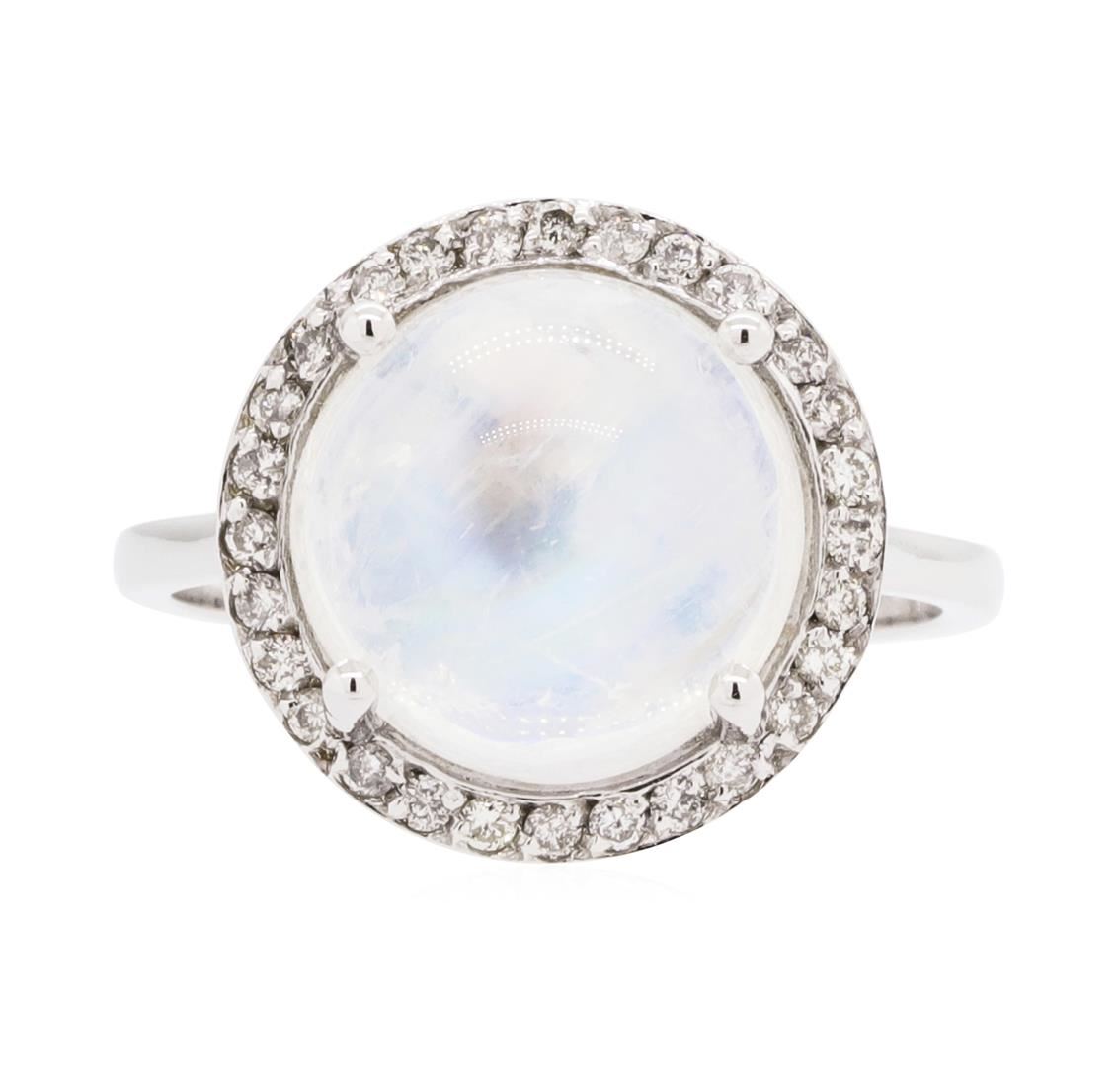 One lady's ring featuring: 14KT white gold weighing 4.1 grams containing one moonstone weighing 5.00ct and diamonds weighing 0.28ctw. The ring is a size 6.5.