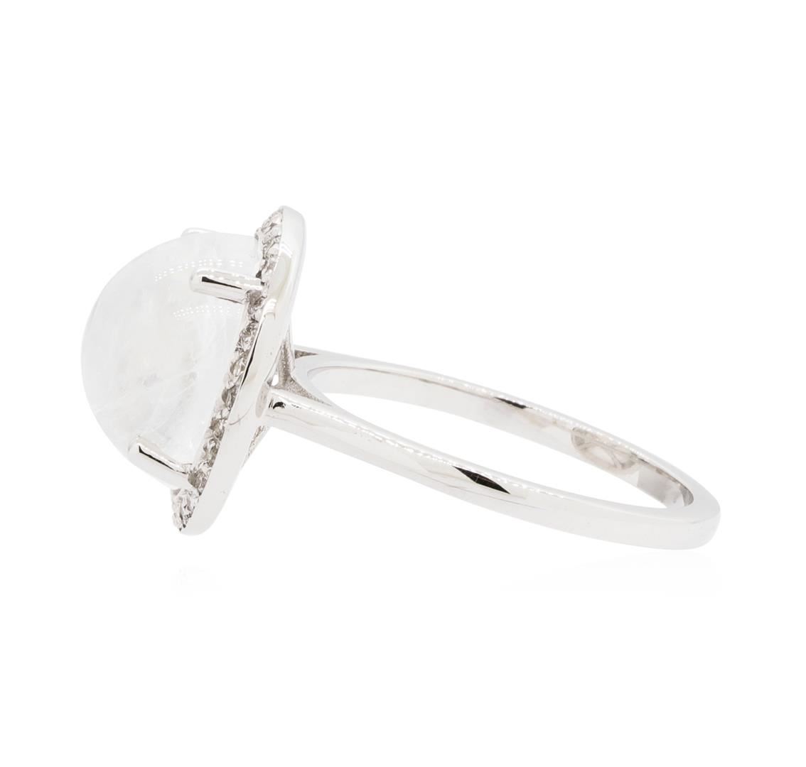 One lady's ring featuring: 14KT white gold weighing 4.1 grams containing one moonstone weighing 5.00ct and diamonds weighing 0.28ctw. The ring is a size 6.5.