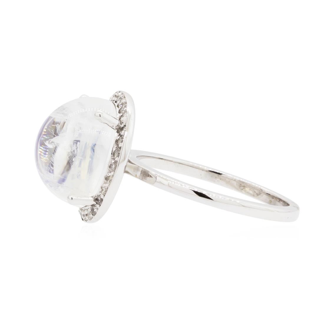 One lady's ring featuring: 14KT white gold weighing 4.7 grams containing one moonstone weighing 7.32ct and diamonds weighing 0.32ctw. The ring is a size 6.25.