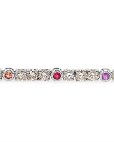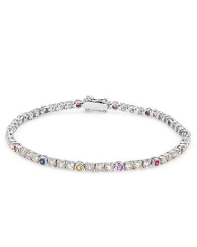 One 14KT White Gold Multi Color Sapphire and Diamond Bracelet. (14) Multi color stones with a total weight of 0.57cts. (42) round Diamonds with a total weight of 4.83cts with a color of I and clarity of I-1. Total length of this bracelet is 7.25 inches. Total weight of this bracelet is 6.31 grams.