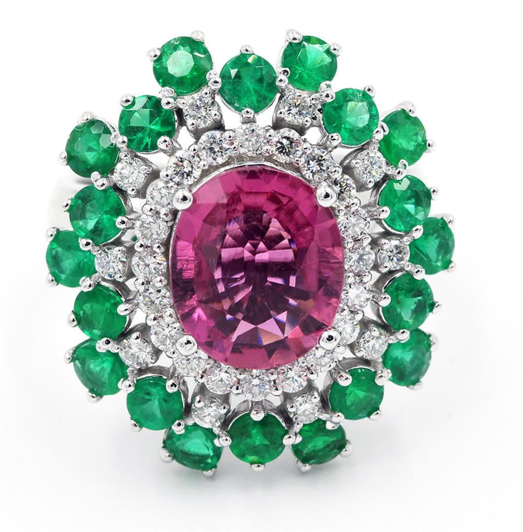 One Oval Cut Pink Tourmaline Diamond Engagement Ring in 14k White Gold. Condition is new. Ring size is 6 but resizable. The ring is at a total of 5.74 Carats. Setting style is solitaire with accents / halo design with white gold metal and purity of 14k. Gross weight is 9.80 grams with a total of 51 stones. The main stone treatment is non-enhanced / natural. Main stone is pink tourmaline, shape is oval, clarity fine bright, color natural pink, and cut is very good with it being 2.66 carats. Side stones specifications: stones are non-enhanced/natural. The diamond shape is brilliant round cut with SI1 clarity, G-H color, and cut being very good. Total of 30 diamonds on the side equating 0.88 ct. Side emerald shape is round cut with a total of 2.20 carats. Total of 20 emeralds on the side.