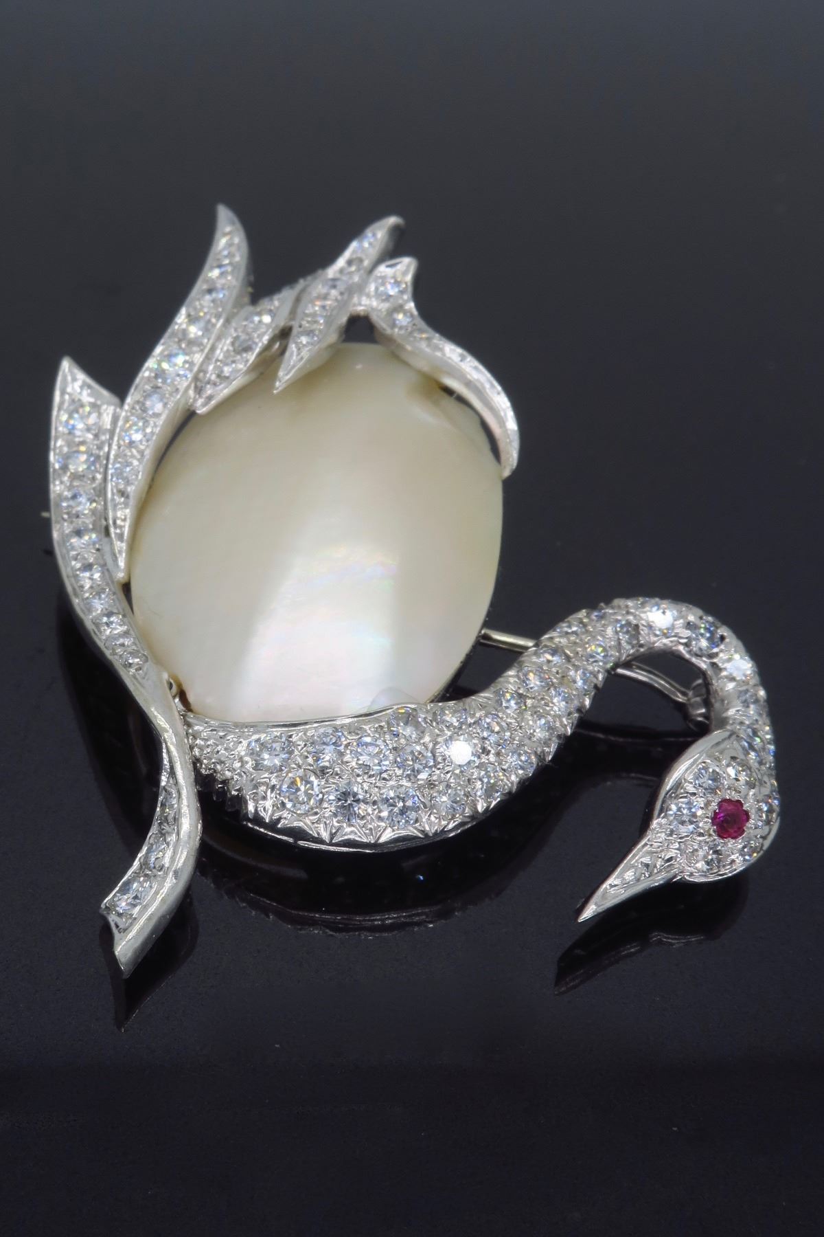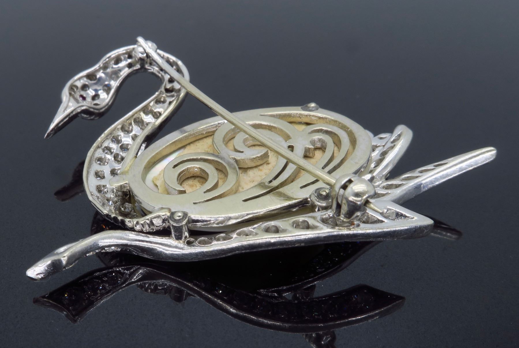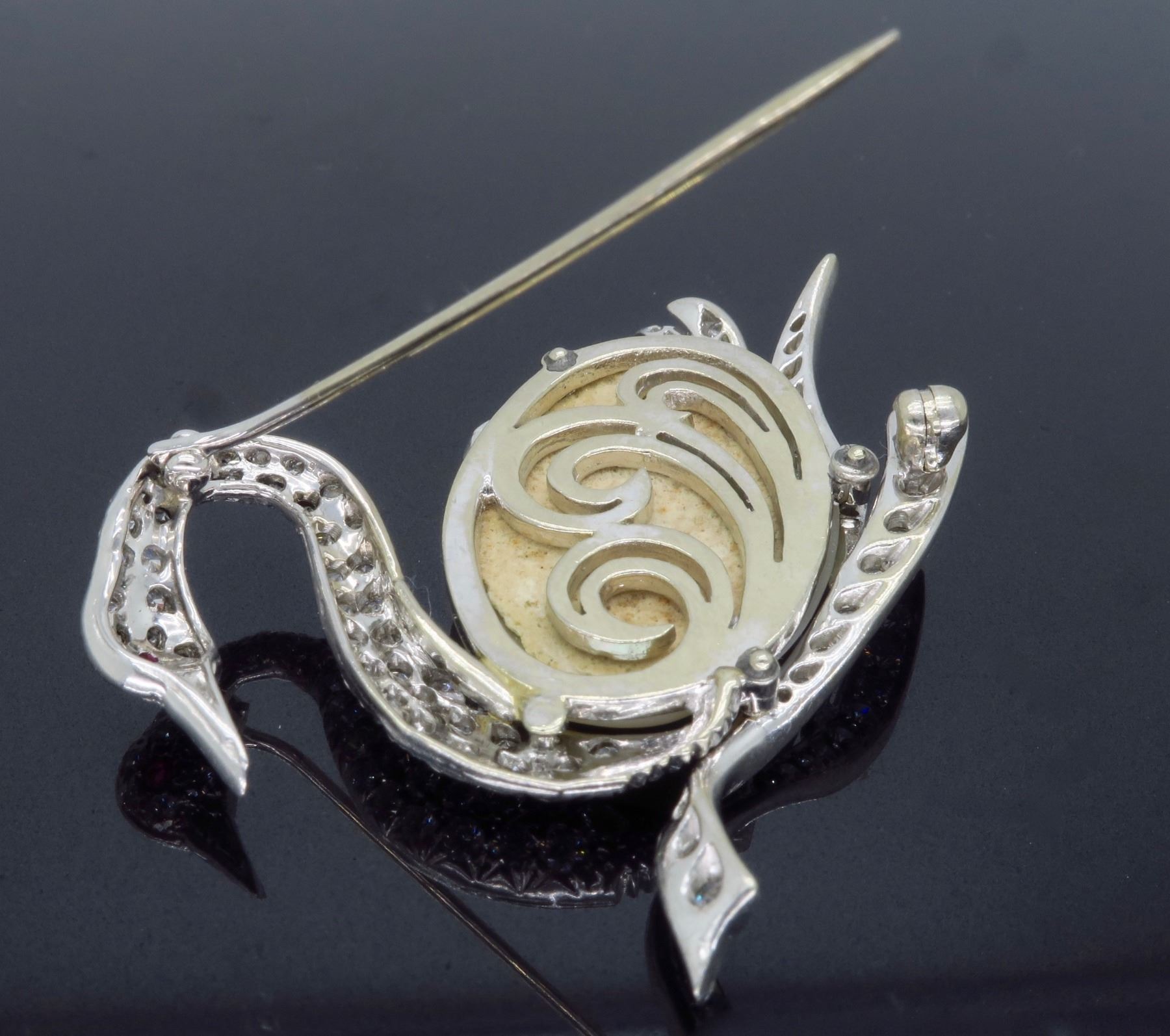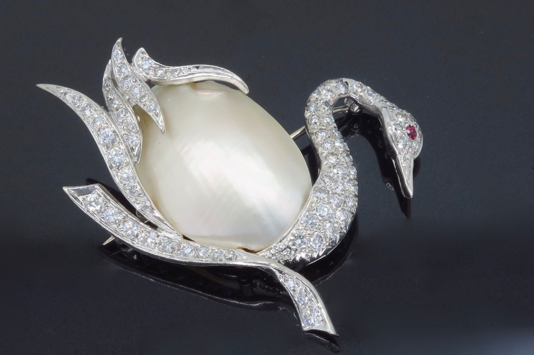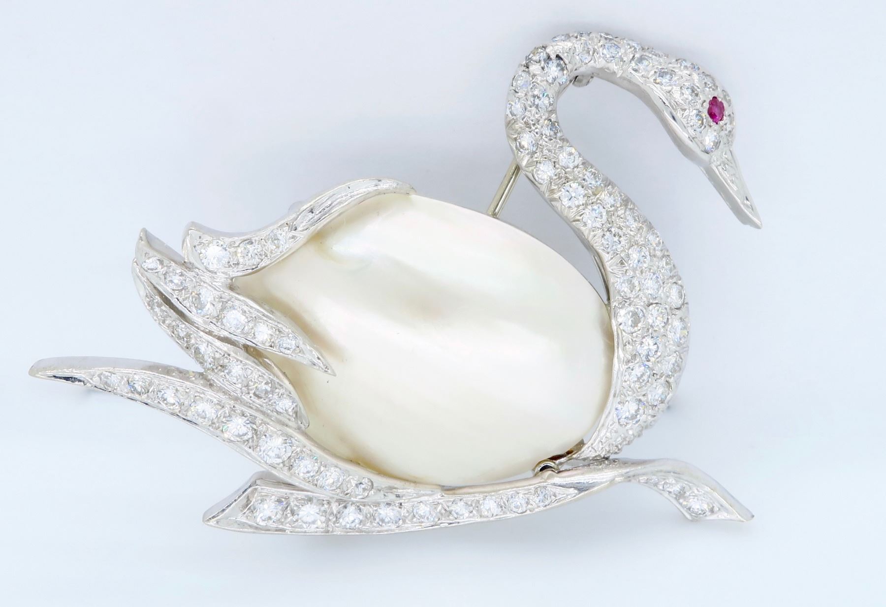 One 14KT White Gold Pearl and Diamond Brooch. (1) Oval shaped Mother of Pearl measuring 1 inch by 0.75 inches. Diamonds with a total weight of 1.50cts with a color of F-I and clarity of VS-1 to SI-1. Total weight of this brooch is 12.4 grams. Total size of this brooch is 2 inches by 1.5 inches.