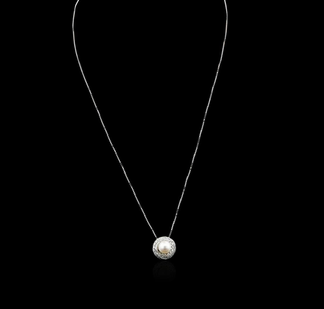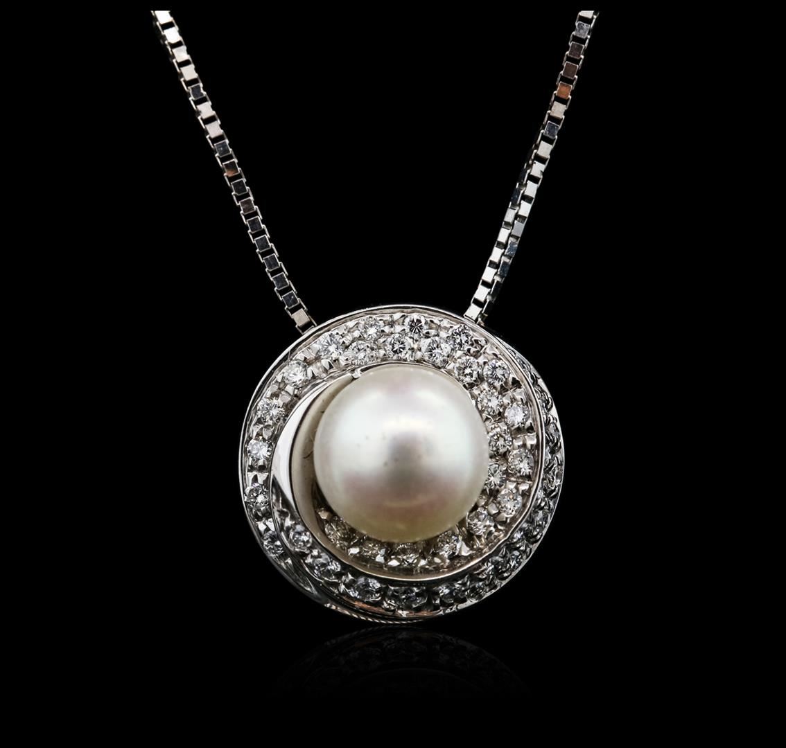 One pendant with chain featuring: 14KT white gold weighing 7.60 grams containing one pearl measuring approximately 8.00mm and diamonds with a total approximate weight of 1.25cts.