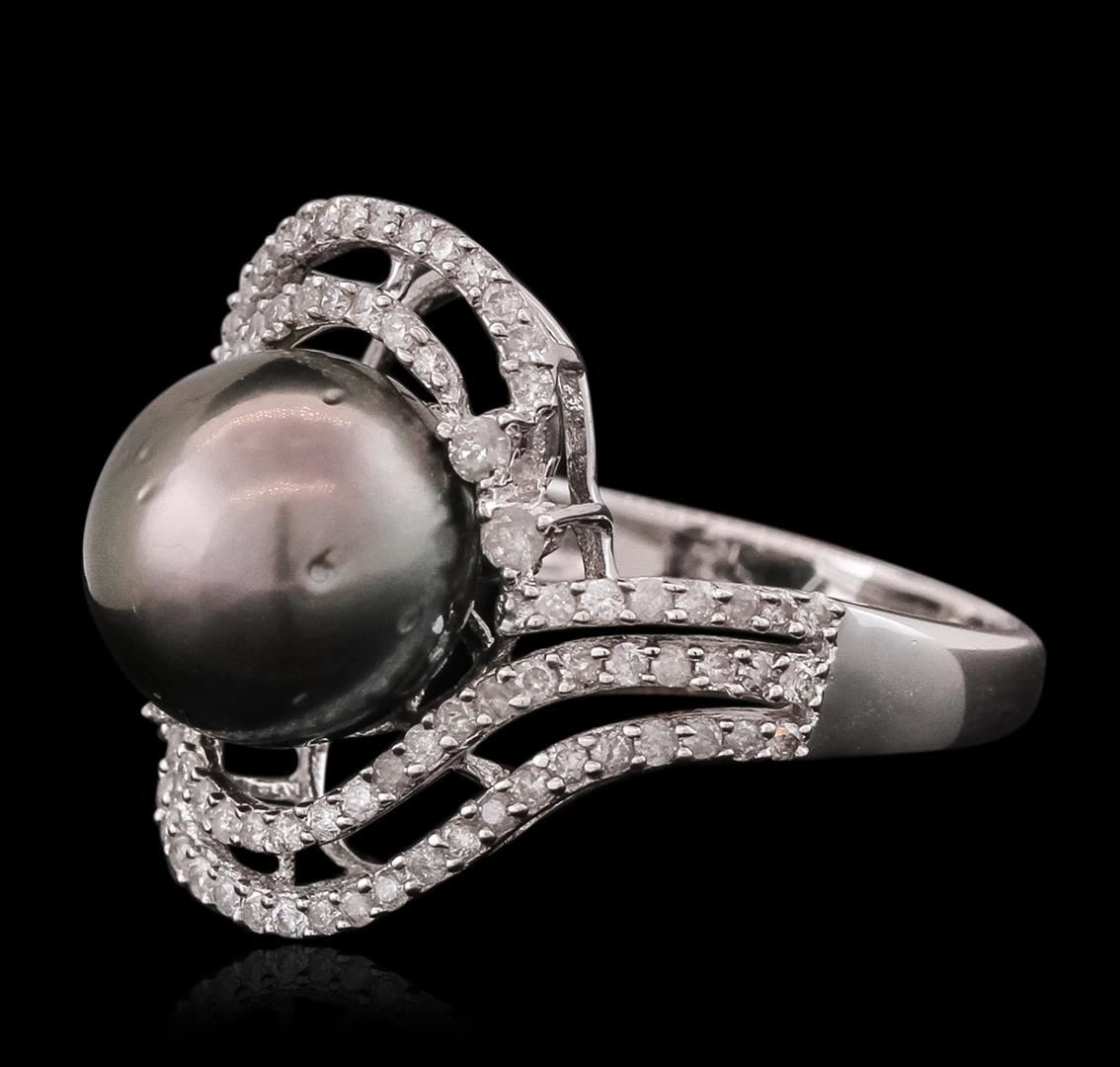 One electronically tested 14KT white gold ladies combination cast & assembled pearl and diamond ring with a split shank with a bright polish finish. Identified with markings of "14K". Condition is new. Containing: Ninety-Six prong set round brilliant cut diamonds, measuring 1.50 - 1.00 x 0.75mm (depth est.) approximate total weight of 96 Stones = 0.50ct. Clarity: I-1 to I-2. Color: I - J, Cut is Good. One Tahitian pearl, 10.2mm in size to 10.2mm in size. The pearl is black in color with a good luster, round, moderately blemished Colored gemstones are presumed to have been subjected to commonly used enhancement processes. All diamonds and colored gemstones are graded in the mounting, unless otherwise stated. Total Weight of Diamonds 0.50ct. Total Weight of Ring 5.50 grams. GGL Appraised at $3,575.00.