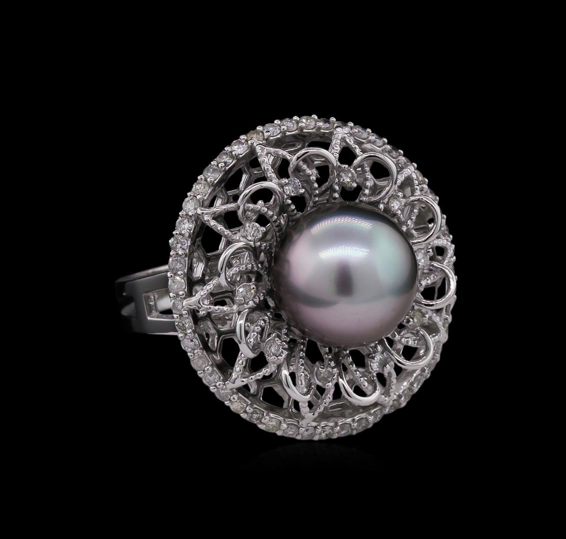 One electronically tested 14KT white gold Ladies ring with a bright polish finish. Condition is new. Identified with markings of "585". Containing: One Tahitian pearl, 10.6mm in size to 10.6mm in size. The pearl is silver in color with a good luster, round, moderately blemished. Sixty prong set round brilliant cut diamonds, measuring 1.30 - 1.20 x 0.75mm (depth est.) approximate. Total Weight of 60 Stones = 0.43ct. Clarity: I-1 to I-2. Color: I - J, Cut is Good. Total Weight of Diamonds 0.43ct. Total Weight of Ring 9.00 grams. GGL Appraised at $5,205.00.