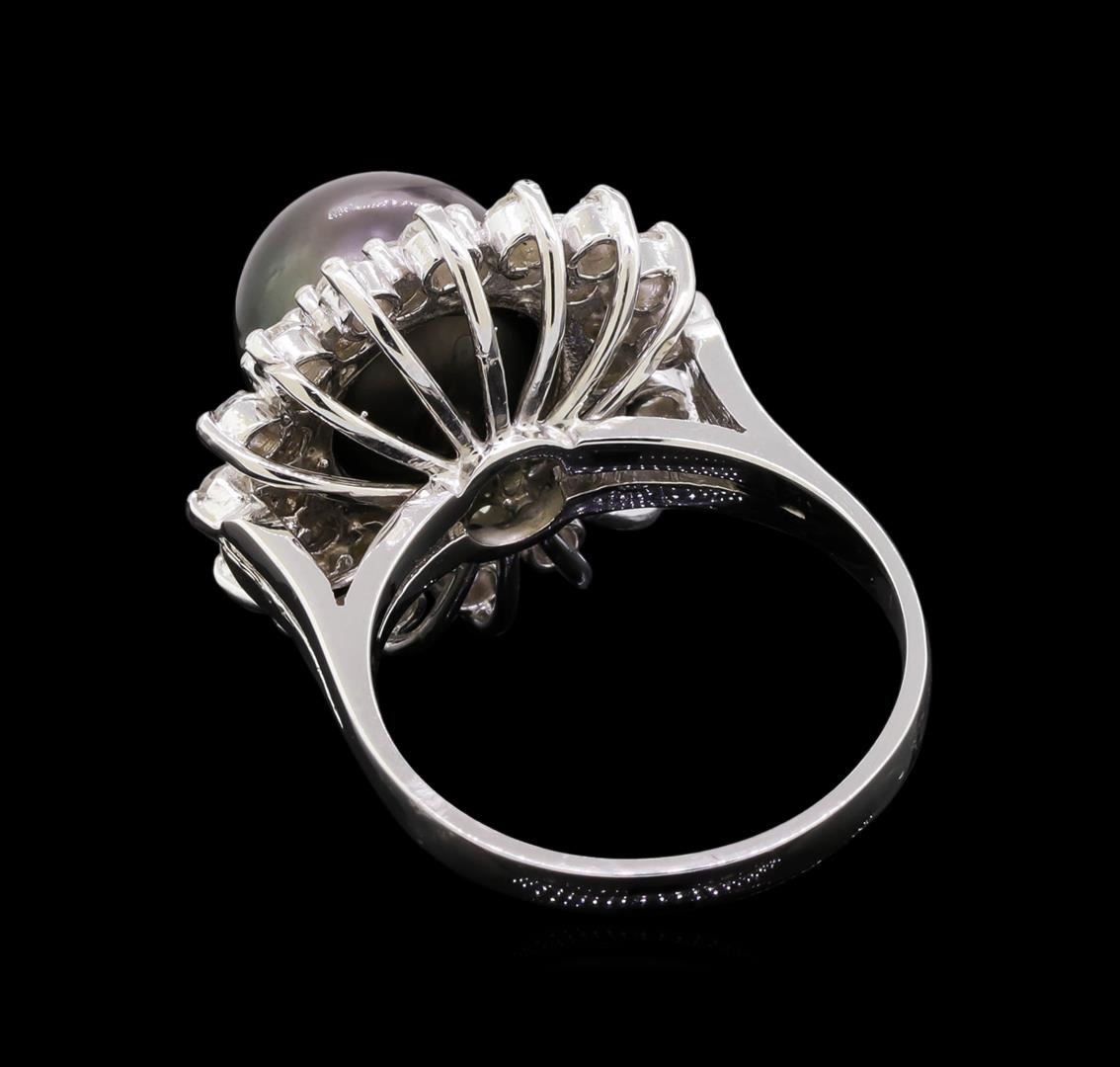One electronically tested 14KT white gold ladies cast Tahitian cultured pearl & diamond ring with a bright finish. The featured Tahitian cultured pearl is set within a tiered diamond bezel, supported by a ribbed under gallery, completed by a two millimeter wide band. Identified with markings of "K14". Condition is good. Containing: One black Tahitian cultured pearl, 10.0mm in size. The pearl is black in color and exhibiting orient with a medium luster, mostly round, lightly spotted Indications of resin residue on the post. This resin is a usual & customary setting tool for pearls. Graded in the setting. Tahitian cultured pearls form in the large "Black Lipped" Pinctada Margaritifera oyster, which is about twice the size of the Japanese Akoya oyster. This warm water species from across the central and South Pacific Ocean is at home in the bays and lagoons of the islands & atolls of French Polynesia. Tahitian cultured pearl farmers generally raise their oysters in lagoons. Tahitian cultured pearls take from two to four years to form. Black pearls are known for their iridescent, vibrant, almost metallic natural colors, unique among saltwater cultured pearls. Though commonly called "Tahitian" pearls, they are actually gray, to a lighter or darker degree. Tahitian pearls have the unique ability to display a variety of colors at the same time, which can be seen glistening on their surface. Thirty-Two prong set round brilliant cut diamonds, measuring 2.00 - 1.90 x 1.17mm (depth est.) approximate total weight of 32 Stones = 0.86ct. Graded in the setting. Clarity: I-1 to I-2. Color: G - I. Total Weight of Diamonds 0.86ct. Total Weight of Ring 8.15 grams. AIG Appraised at $3,990.00.