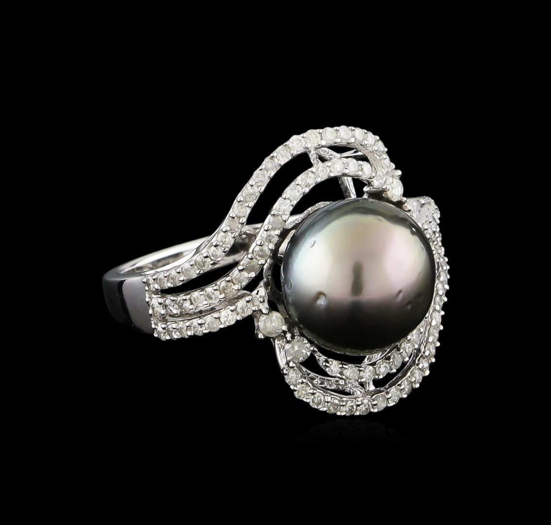 One electronically tested 14KT white gold ladies combination cast & assembled pearl and diamond ring with a split shank with a bright polish finish. Identified with markings of "14K". Condition is new. Containing: Ninety-Six prong set round brilliant cut diamonds, measuring 1.50 - 1.00 x 0.75mm (depth est.) approximate total weight of 96 Stones = 0.50ct. Clarity: I-1 to I-2. Color: I - J, Cut is Good. One Tahitian pearl, 10.2mm in size to 10.2mm in size. The pearl is black in color with a good luster, round, moderately blemished Colored gemstones are presumed to have been subjected to commonly used enhancement processes. All diamonds and colored gemstones are graded in the mounting, unless otherwise stated. Total Weight of Diamonds 0.50ct. Total Weight of Ring 5.50 grams. GGL Appraised at $3,575.00.