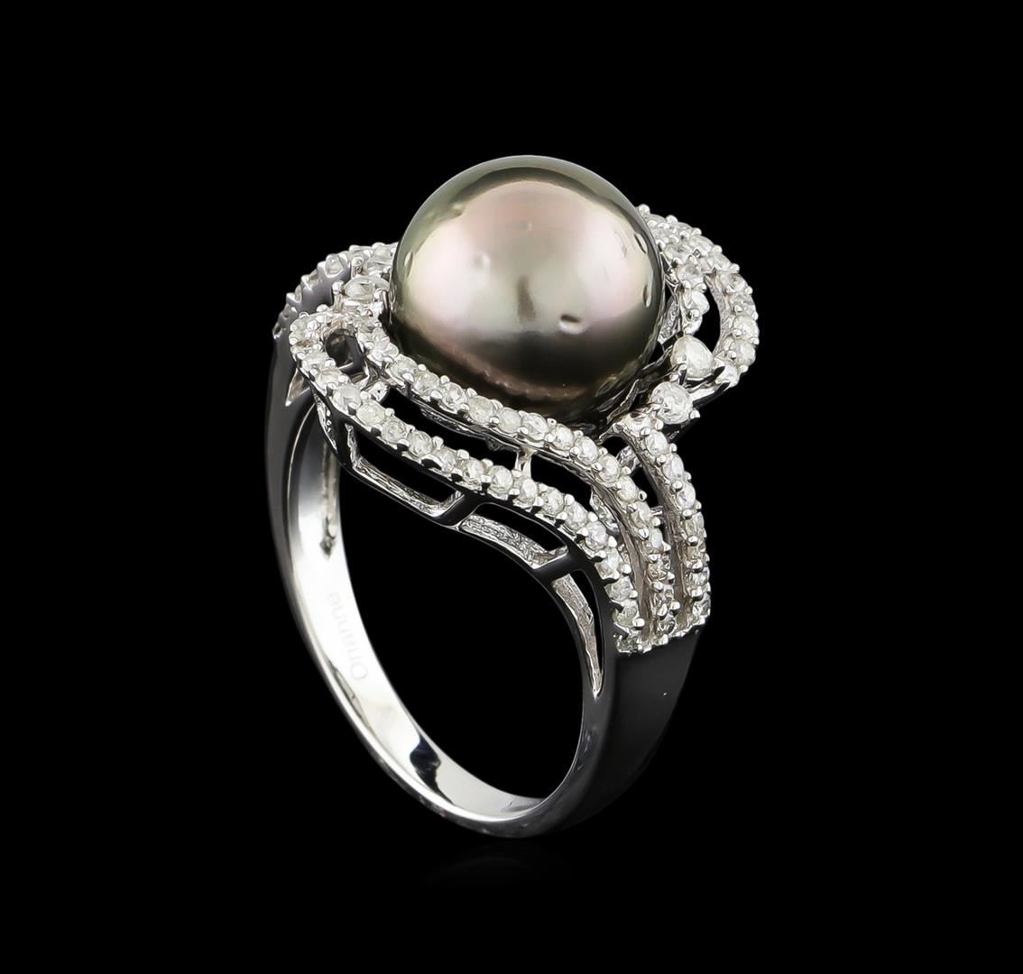 One electronically tested 14KT white gold ladies combination cast & assembled pearl and diamond ring with a split shank with a bright polish finish. Identified with markings of "14K". Condition is new. Containing: Ninety-Six prong set round brilliant cut diamonds, measuring 1.50 - 1.00 x 0.75mm (depth est.) approximate total weight of 96 Stones = 0.50ct. Clarity: I-1 to I-2. Color: I - J, Cut is Good. One Tahitian pearl, 10.2mm in size to 10.2mm in size. The pearl is black in color with a good luster, round, moderately blemished Colored gemstones are presumed to have been subjected to commonly used enhancement processes. All diamonds and colored gemstones are graded in the mounting, unless otherwise stated. Total Weight of Diamonds 0.50ct. Total Weight of Ring 5.50 grams. GGL Appraised at $3,575.00.