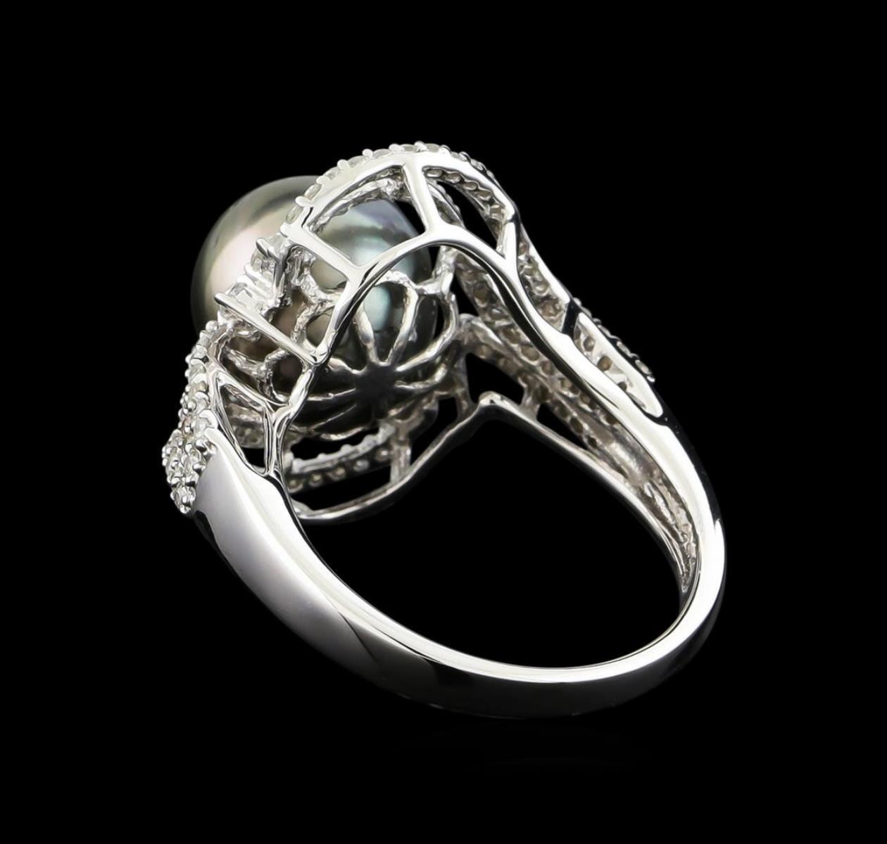 One electronically tested 14KT white gold ladies combination cast & assembled pearl and diamond ring with a split shank with a bright polish finish. Identified with markings of "14K". Condition is new. Containing: Ninety-Six prong set round brilliant cut diamonds, measuring 1.50 - 1.00 x 0.75mm (depth est.) approximate total weight of 96 Stones = 0.50 ct. Clarity: I-1 to I-2. Color: I - J, Cut is Good. One Tahitian pearl, 10.2mm in size to 10.2mm in size. The pearl is black in color with a good luster, round, moderately blemished Colored gemstones are presumed to have been subjected to commonly used enhancement processes. All diamonds and colored gemstones are graded in the mounting, unless otherwise stated. Total Weight of Diamonds 0.50 ct. Total Weight of Ring 5.50 grams. GGL Appraised.