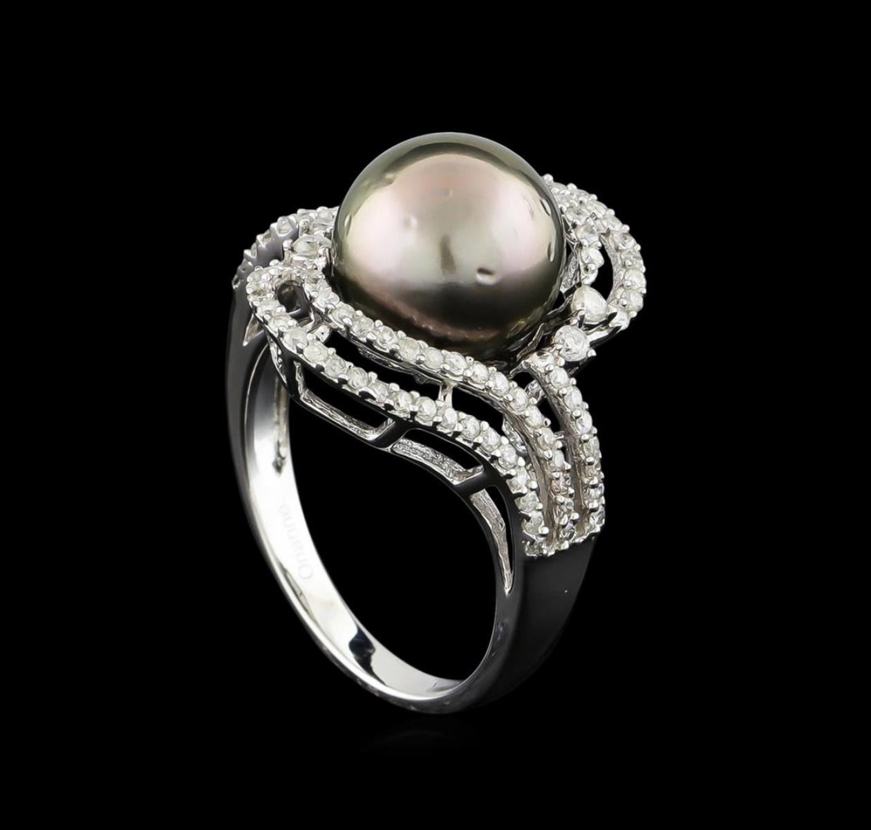 One electronically tested 14KT white gold ladies combination cast & assembled pearl and diamond ring with a split shank with a bright polish finish. Identified with markings of "14K". Condition is new. Containing: Ninety-Six prong set round brilliant cut diamonds, measuring 1.50 - 1.00 x 0.75mm (depth est.) approximate total weight of 96 Stones = 0.50 ct. Clarity: I-1 to I-2. Color: I - J, Cut is Good. One Tahitian pearl, 10.2mm in size to 10.2mm in size. The pearl is black in color with a good luster, round, moderately blemished Colored gemstones are presumed to have been subjected to commonly used enhancement processes. All diamonds and colored gemstones are graded in the mounting, unless otherwise stated. Total Weight of Diamonds 0.50 ct. Total Weight of Ring 5.50 grams. GGL Appraised.