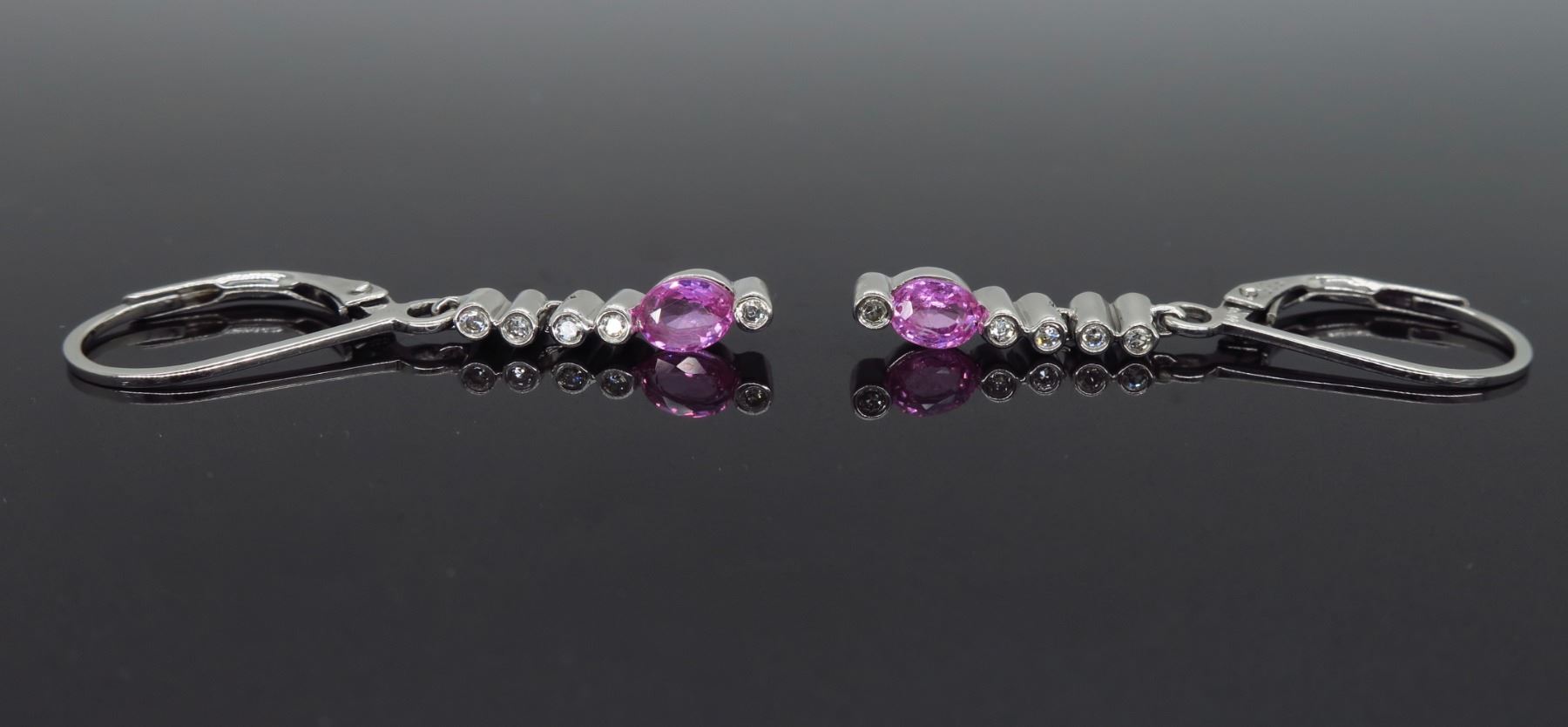 One 14KT White Gold Pink Tourmaline and Diamond Earrings. (2) Pink Tourmaline oval shaped stones each measuring 3.2 x 4.13mm. (10) single cut Diamonds with a total weight of 0.07cts with a color of G-J and clarity of SI-1 to I-1. Total weight of these earrings is 1.8 grams. Length of each earring is 1.25 inches.