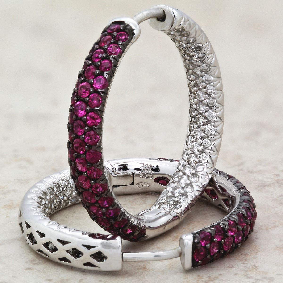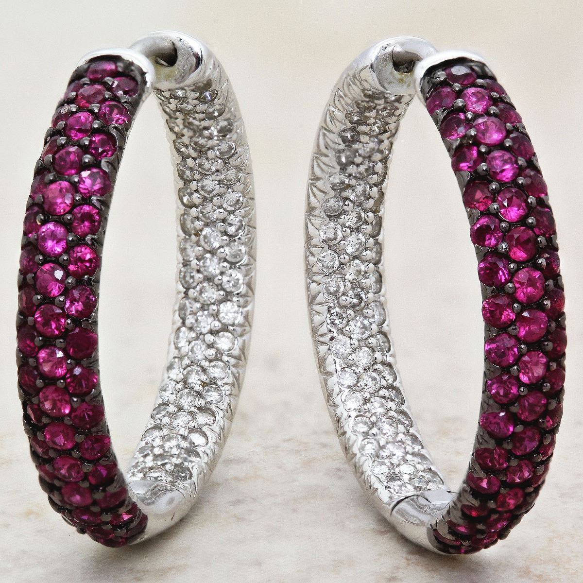 One pair stamped & tested 14KT white gold ladies cast ruby and diamond hoop earrings with hinged clip backs with a bright polish finish. Condition is excellent. Trademark is Super Bell. Identified with markings of "14K585". Containing: Ninety-two prong set round modified brilliant cut natural rubies, measuring 1.50 - 1.50 x 0.98 mm, approximate total weight of 2.00ct., clarity is slightly included, medium dark, moderately strong, slightly purplish red color, cut is very good. One hundred eight prong set round brilliant cut diamonds, measuring 1.50 - 1.50 x 0.90mm (depth est.) approximate total weight of 108 Stones = 1.35ct. Clarity of SI-1, color of F - G, cut is very good.