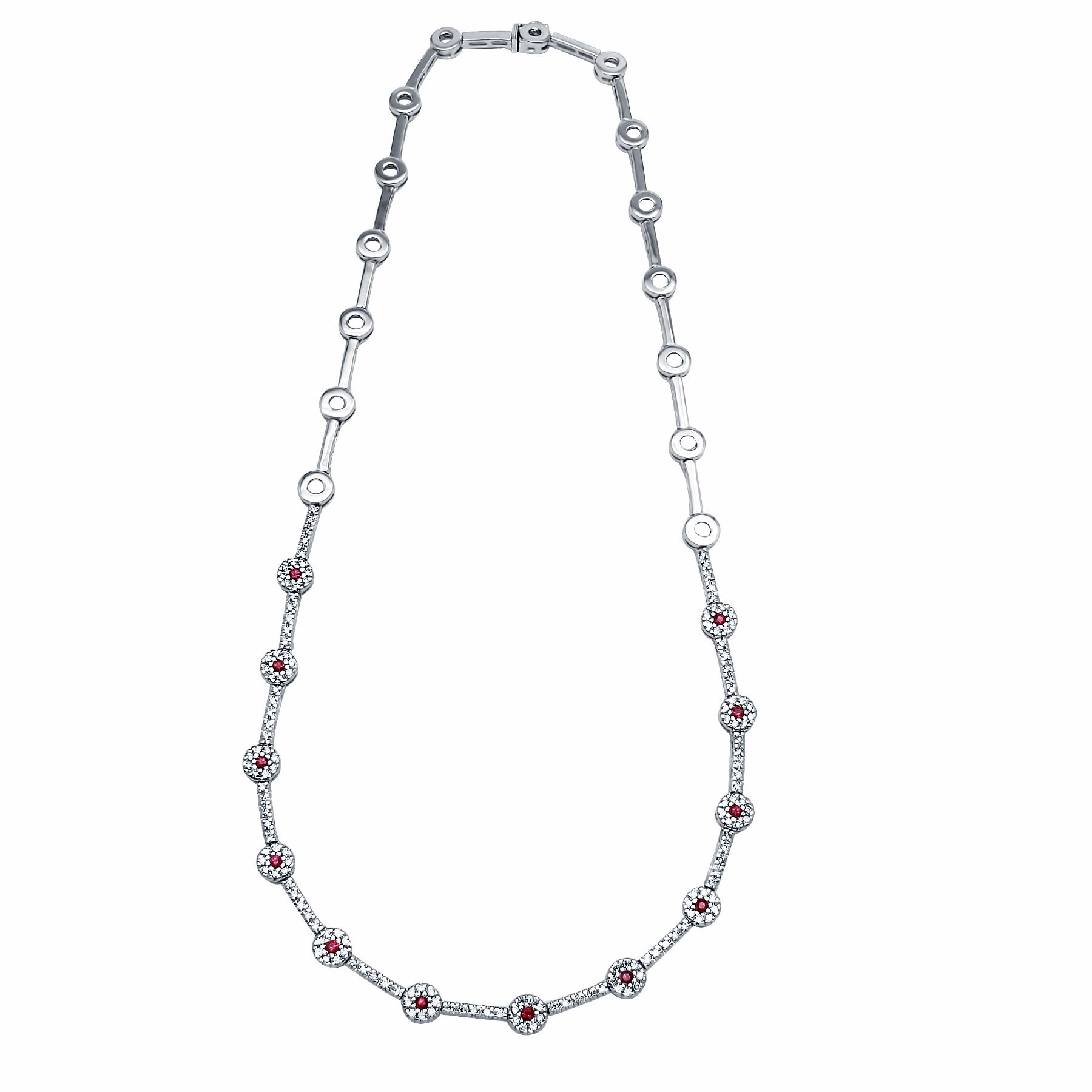 One 14KT White Gold Ruby and Diamond Necklace. (12) Rubies with a total weight of 0.61cts. (161) Diamonds with a total weight of 1.48cts with a color of I and clarity of SI-2 to I-1. Total weight of this necklace is 22.63 grams.