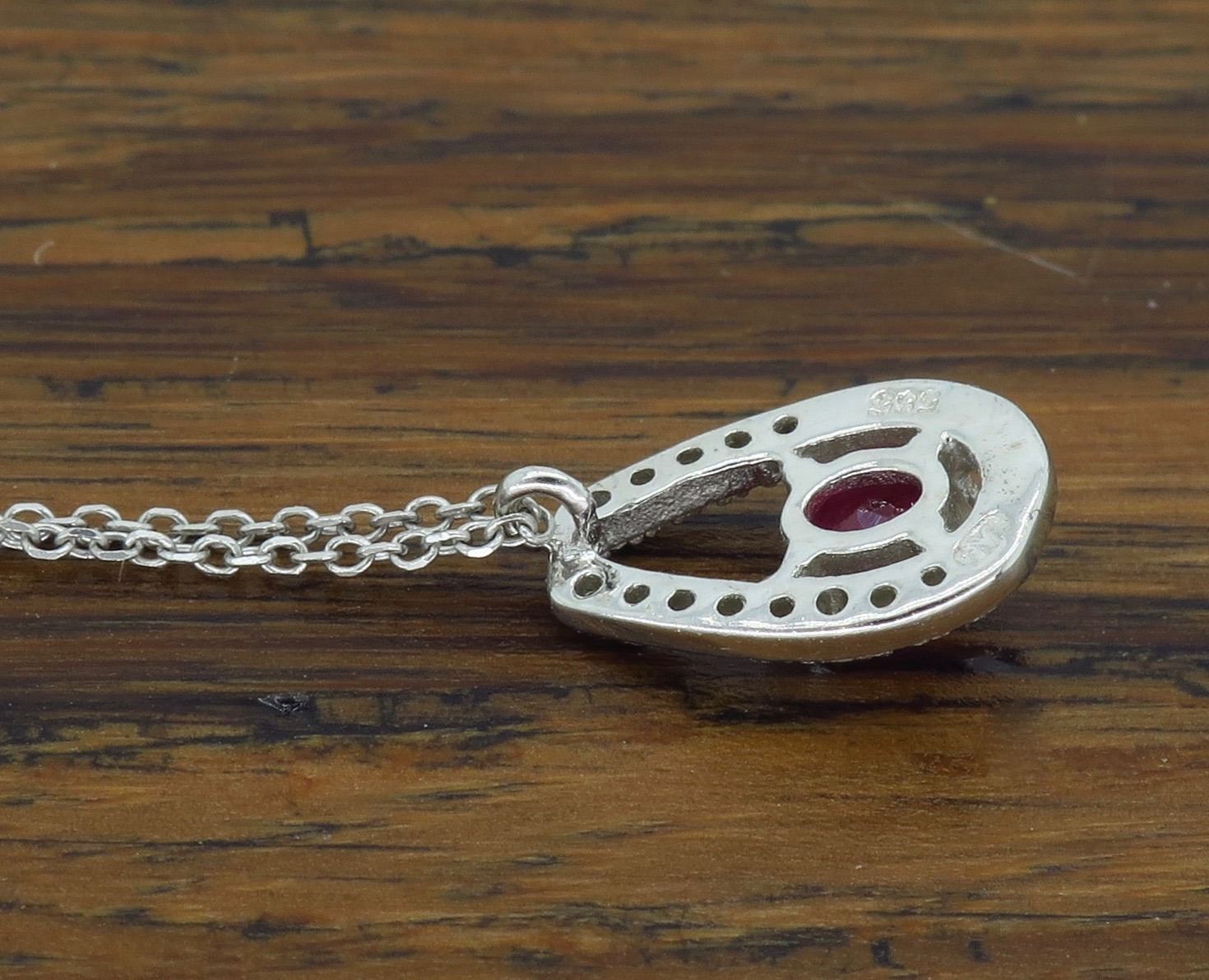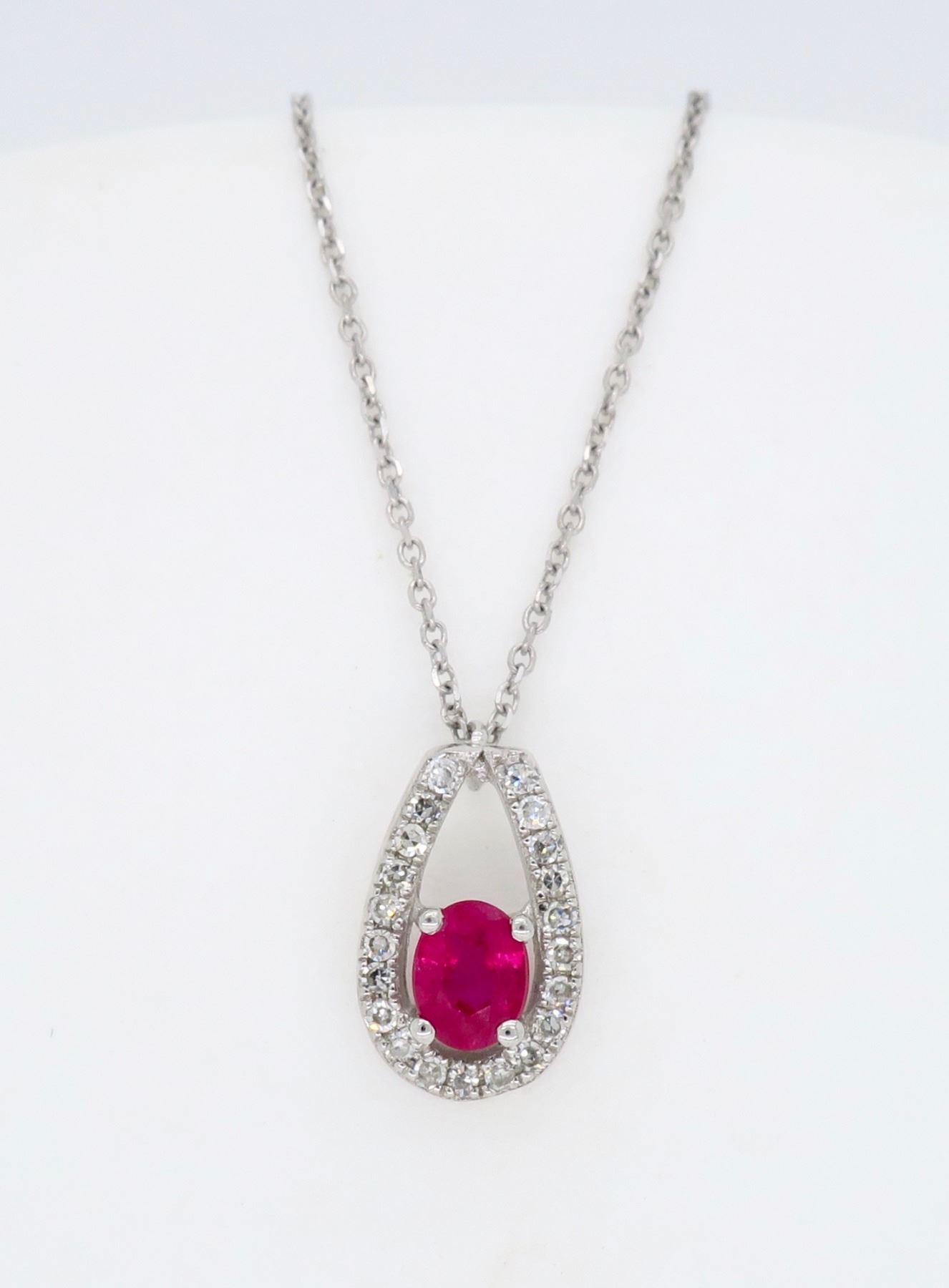 One 14KT White Gold Ruby and Diamond Pendant with Chain. (1) Oval Ruby measuring 3.9 x 3.19mm. (21) single cut Diamonds with a total weight of 0.08cts with a color of G-J and clarity of SI-2 to I-1. Total weight of this pendant is 1.2 grams. Adjustable chain from 15.5 inches to 16.5 inches long.