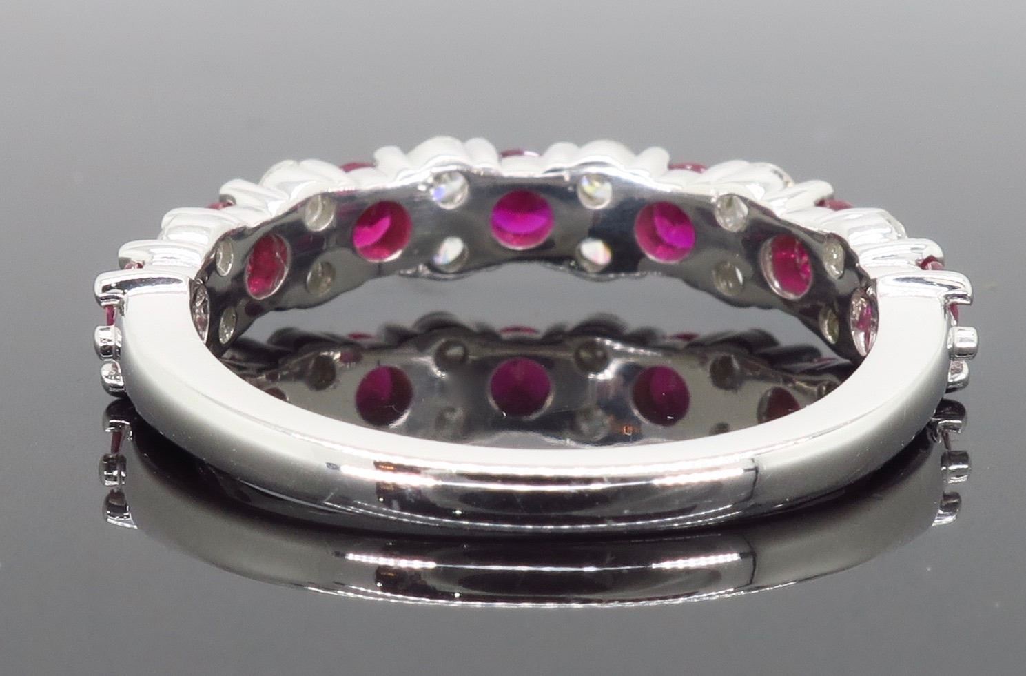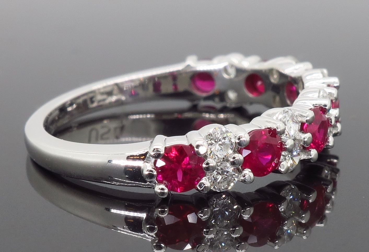 One 14KT White Gold Ruby and Diamond Ring. Lab created Rubies measuring 3mm. Round Diamonds with a total weight of 0.42cts with a color of G-I and clarity of VS-2 to SI-2. Total weight of this ring is 2.9 grams. Ring size is 7.