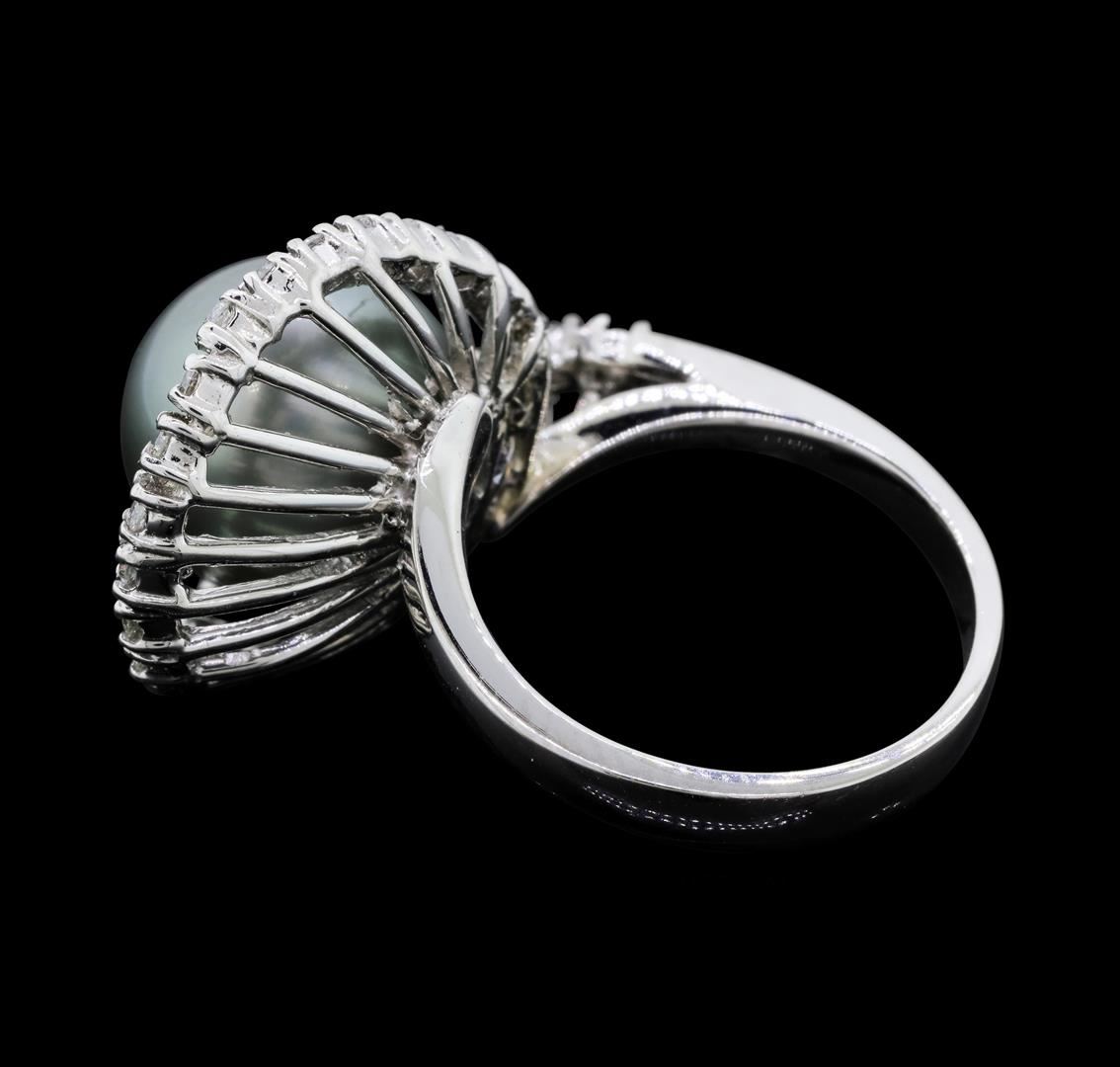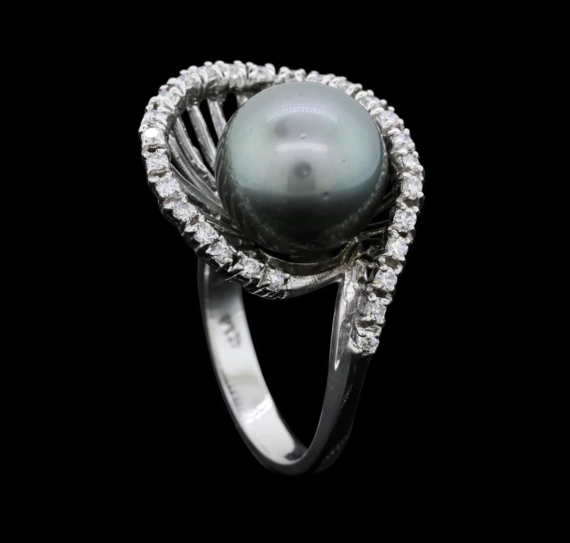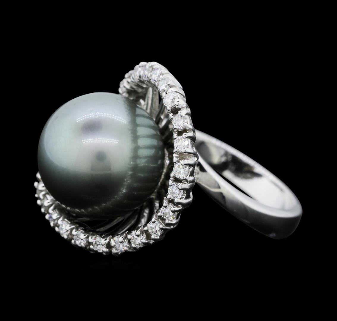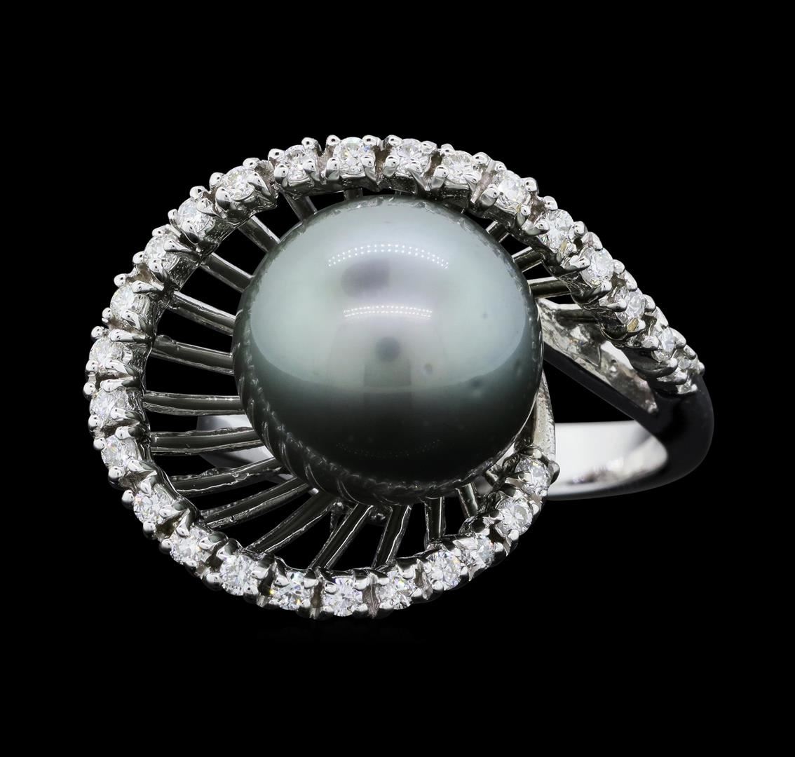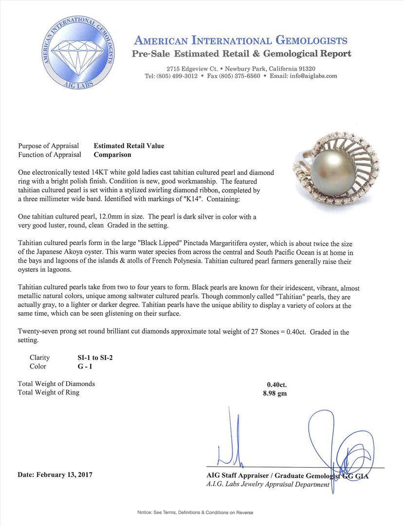 One electronically tested 14KT white gold ladies cast Tahitian cultured pearl and diamond ring with a bright polish finish. The featured Tahitian cultured pearl is set within a stylized swirling diamond ribbon, completed by a three millimeter wide band. Identified with markings of "K14". Condition is new, good workmanship. Containing: One Tahitian cultured pearl, 12.0mm in size. The pearl is dark silver in color with a very good luster, round, clean Graded in the setting. Tahitian cultured pearls form in the large "Black Lipped" Pinctada Margaritifera oyster, which is about twice the size of the Japanese Akoya oyster. This warm water species from across the central and South Pacific Ocean is at home in the bays and lagoons of the islands & atolls of French Polynesia. Tahitian cultured pearl farmers generally raise their oysters in lagoons. Tahitian cultured pearls take from two to four years to form. Black pearls are known for their iridescent, vibrant, almost metallic natural colors, unique among saltwater cultured pearls. Though commonly called "Tahitian" pearls, they are actually gray, to a lighter or darker degree. Tahitian pearls have the unique ability to display a variety of colors at the same time, which can be seen glistening on their surface. Twenty-Seven prong set round brilliant cut diamonds approximate total weight of 27 Stones = 0.40ct. Graded in the setting. Clarity: SI-1 to SI-2. Color: G - I. Total Weight of Diamonds 0.40ct. Total Weight of Ring 8.98gm. AIG Appraised.
