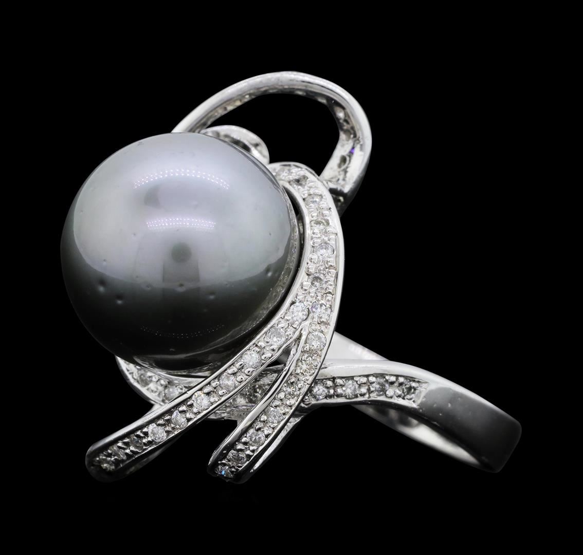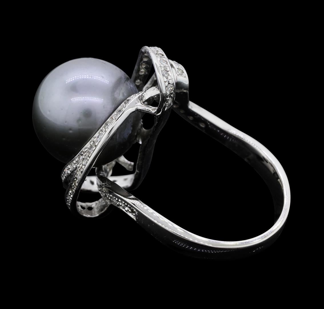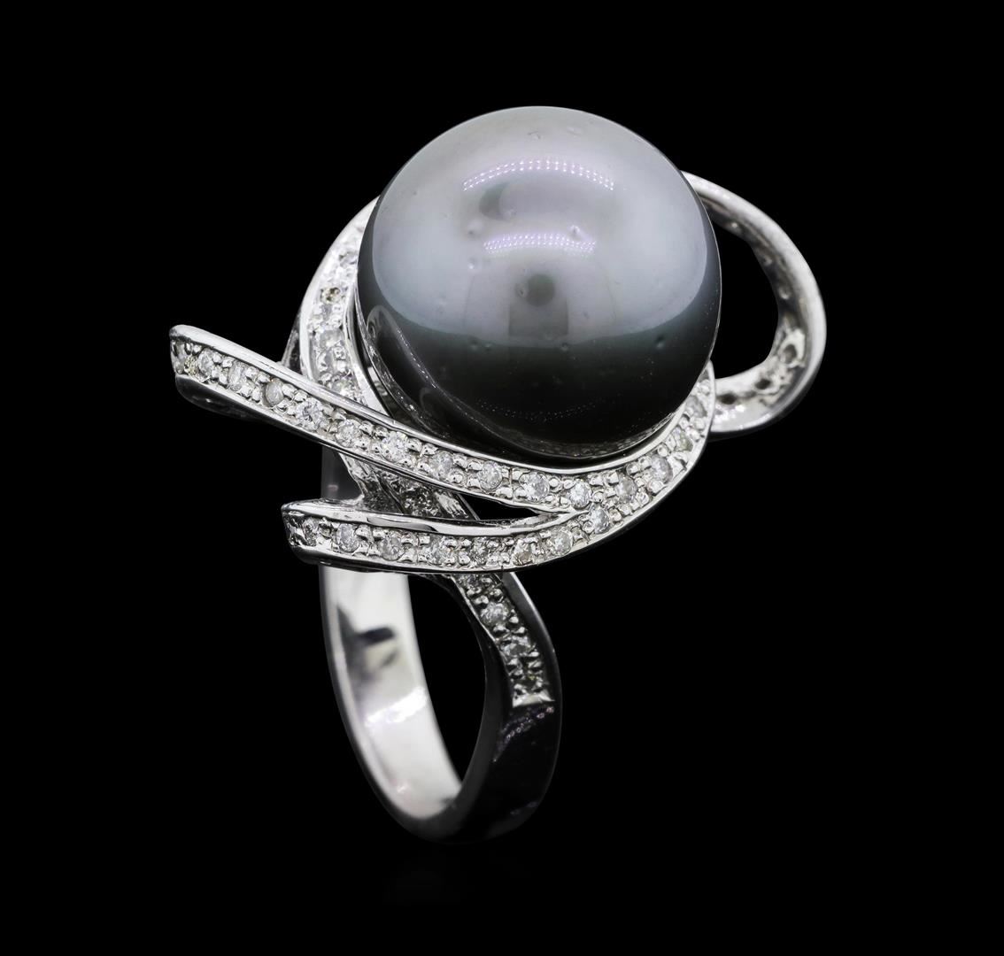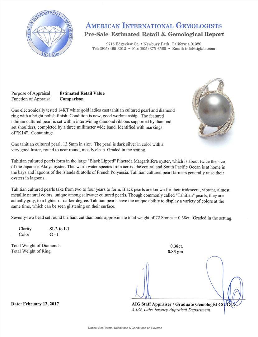 One electronically tested 14KT white gold ladies cast Tahitian cultured pearl and diamond ring with a bright polish finish. The featured Tahitian cultured pearl is set within intertwining diamond ribbons supported by diamond set shoulders, completed by a three millimeter wide band. Identified with markings of "K14". Condition is new, good workmanship. Containing: One Tahitian cultured pearl, 13.5mm in size. The pearl is dark silver in color with a very good luster, round to near round, mostly clean Graded in the setting. Tahitian cultured pearls form in the large "Black Lipped" Pinctada Margaritifera oyster, which is about twice the size of the Japanese Akoya oyster. This warm water species from across the central and South Pacific Ocean is at home in the bays and lagoons of the islands & atolls of French Polynesia. Tahitian cultured pearl farmers generally raise their oysters in lagoons. Tahitian cultured pearls take from two to four years to form. Black pearls are known for their iridescent, vibrant, almost metallic natural colors, unique among saltwater cultured pearls. Though commonly called "Tahitian" pearls, they are actually gray, to a lighter or darker degree. Tahitian pearls have the unique ability to display a variety of colors at the same time, which can be seen glistening on their surface. Seventy-Two bead set round brilliant cut diamonds approximate total weight of 72 Stones = 0.38ct. Graded in the setting. Clarity: SI-2 to I-1. Color: G - I. Total Weight of Diamonds 0.38ct. Total Weight of Ring 8.83gm. AIG Appraised.