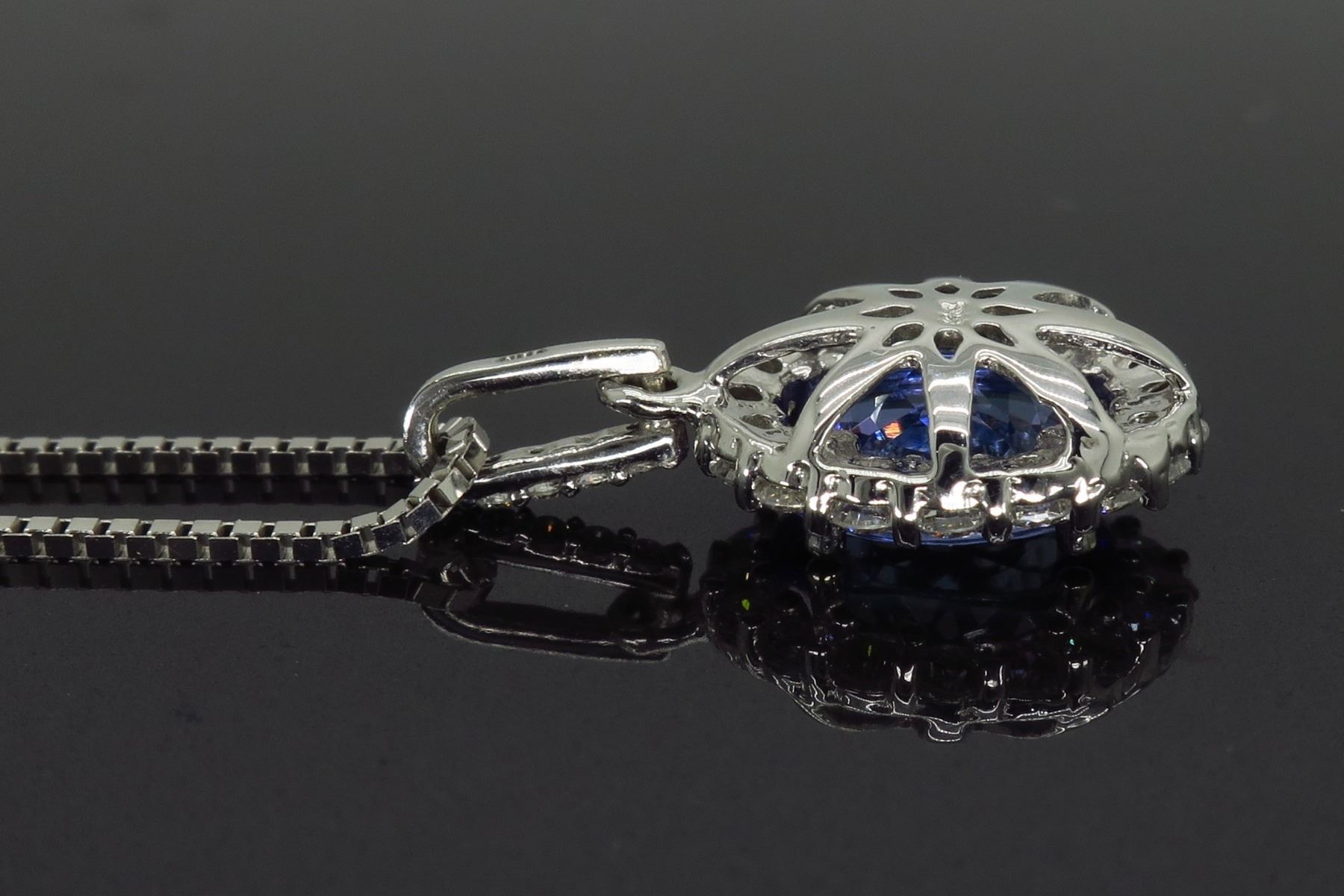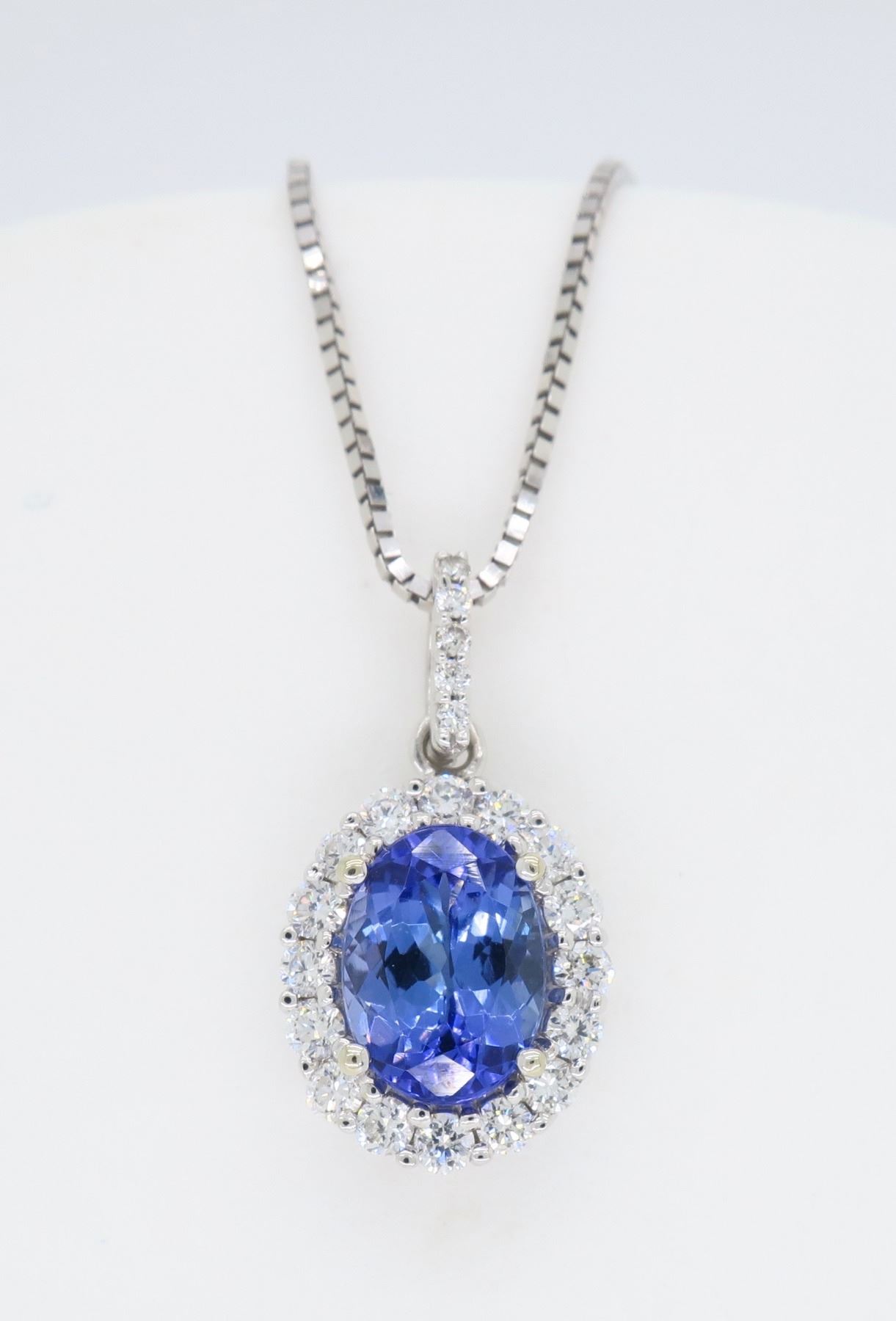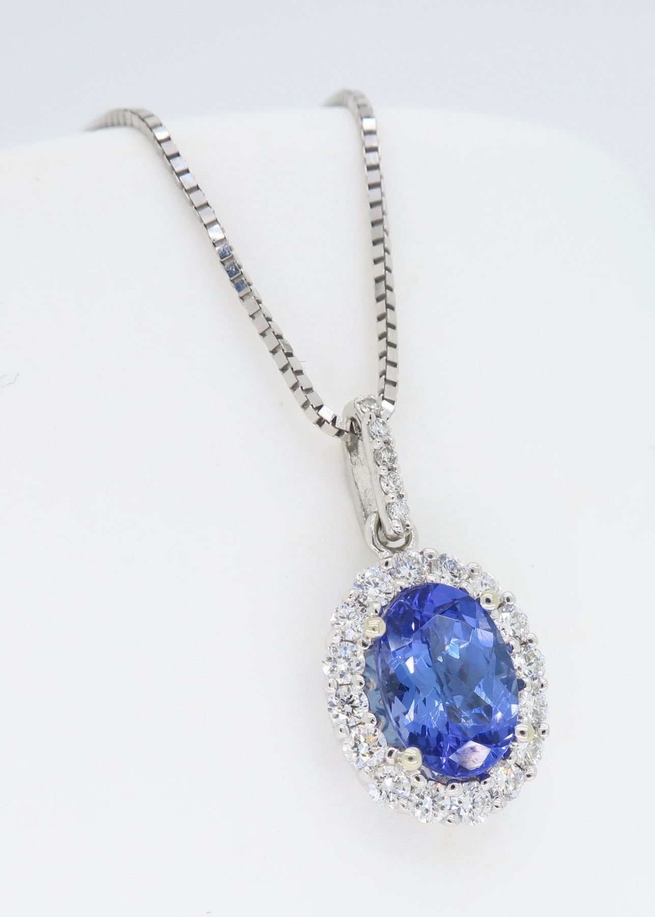 One 14KT White Gold Tanzanite and Diamond Pendant with Chain. (1) Tanzanite stone measuring 8x6mm. (21) round Diamonds with a color of G-I and clarity of SI-2. Total weight of this pendant is 3.4 grams. Pendant length is 18 inches. Pendant length is 0.75 inches.