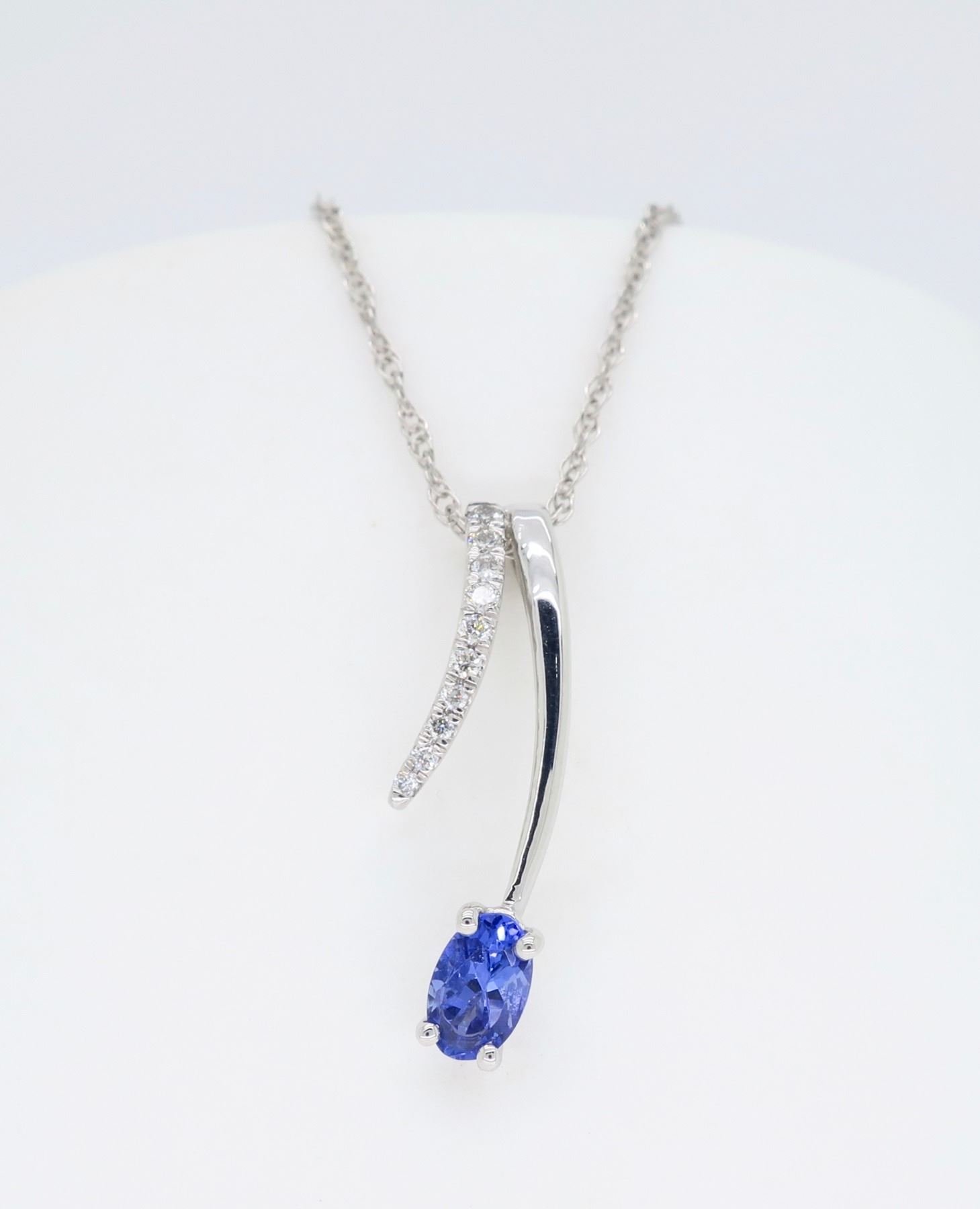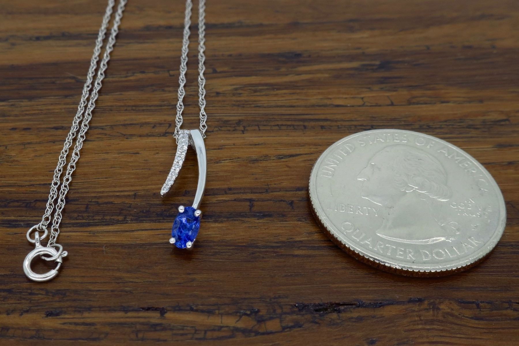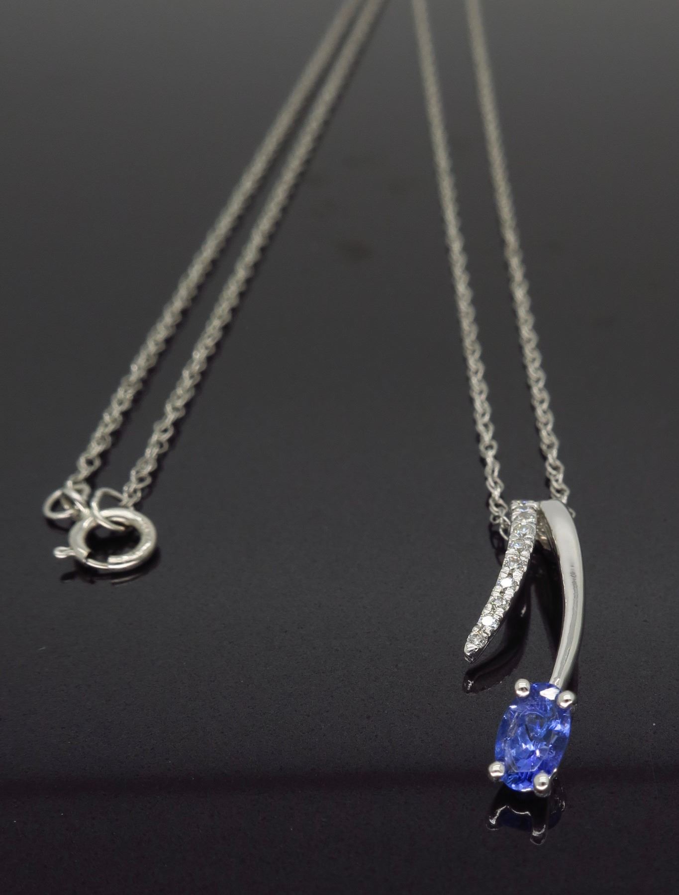 One 14KT White Gold Tanzanite and Diamond Pendant with Chain. (1) Tanzanite stone measuring 3 x 5mm. (10) round Diamonds with a total weight of 0.05cts with a color of G-J and clarity of SI-2 to I-1. Total weight of this pendant is 1.6 grams. Total length of this chain is 18 inches long.