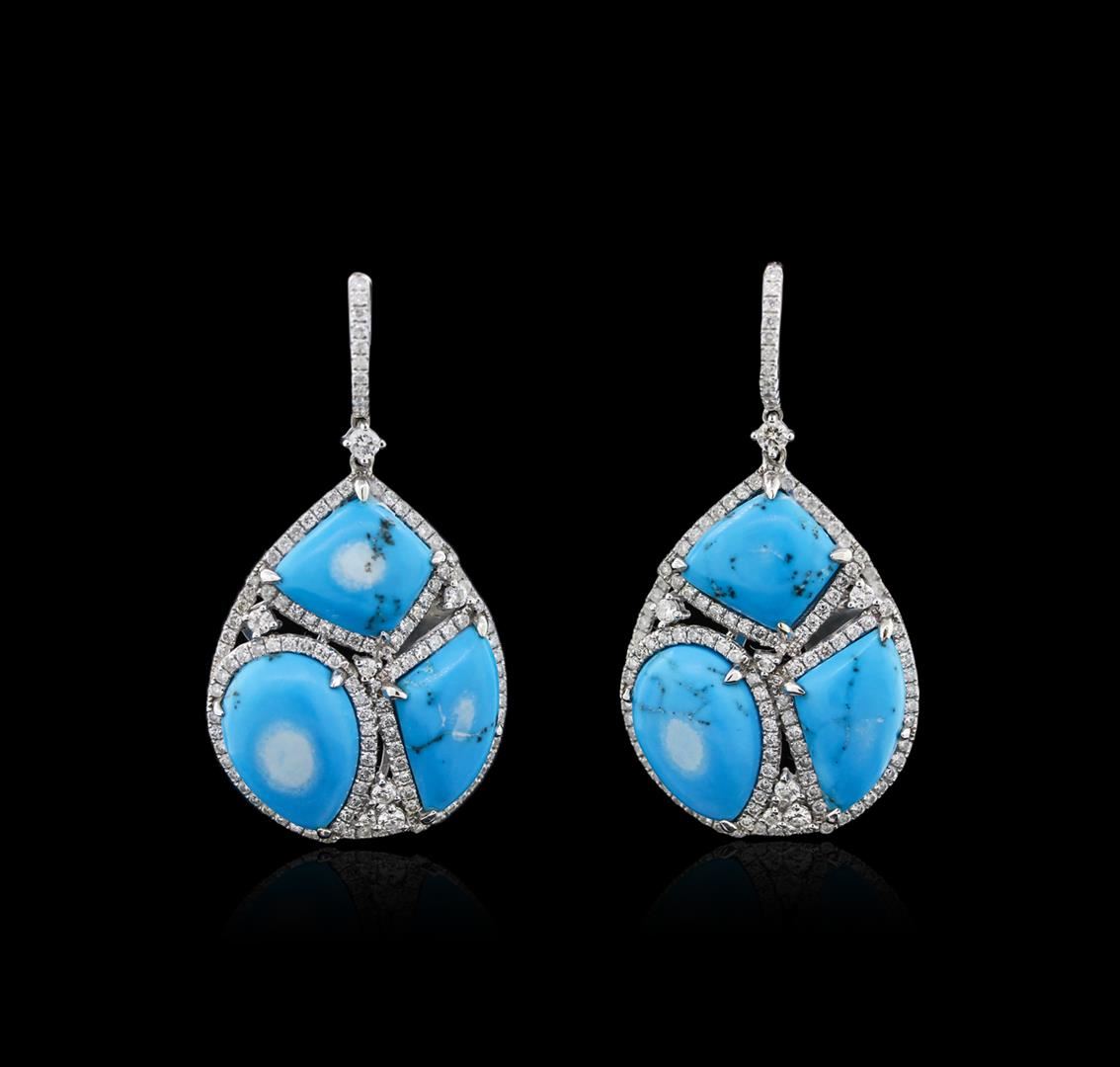 One pair of earrings featuring: 14KT white gold weighing 11.05 grams containing six turquoise and 244 round diamonds with a total weight of 2.00ct.