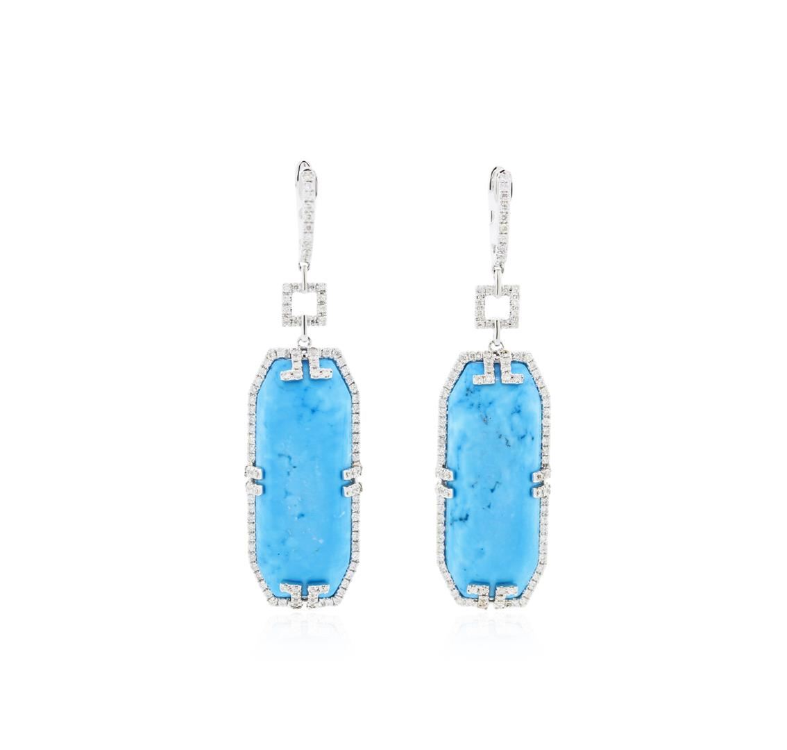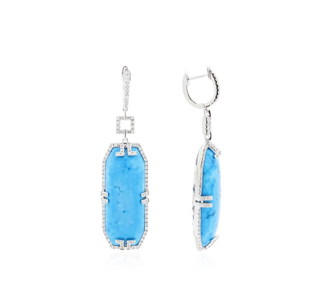 One pair of earrings featuring: 14KT white gold weighing 8.90 grams containing two turquoise and 214 round diamonds with a total weight of 1.01ct.