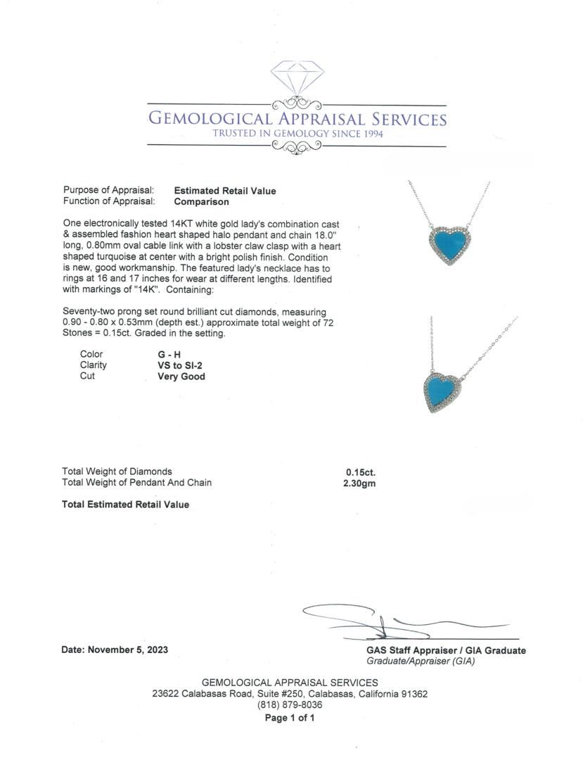One electronically tested 14KT white gold lady's combination cast & assembled fashion heart shaped halo pendant and chain 18.0" long, 0.80mm oval cable link with a lobster claw clasp with a heart shaped turquoise at the center with a bright polish finish. GAS Appraised.