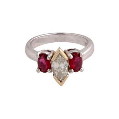 14KT white and yellow gold ladies diamond and ruby ring. Trademark KD. Identified with markings of 14K. One prong set marquise shaped cut diamond, measuring 8.40 x 4.70 x 2.90mm. Approximate weight of 0.66ct. Graded in the mounting. Clarity SI-2, Color J, Depth 61.7%, Table 54.5%. Two prong set oval mixed cut natural ruby, measuring 6.00 x 3.70 x 1.90mm, approximate total weight of 0.72ct., clarity is SI-1, type II, medium dark, moderately strong, slightly purplish red color, (GIA slpR 6/4, cut is good. Total weight of colored stones 0.72 ct. Total weight of dimaonds 0.66ct. Total weight of ring 5.73gm. AIG Gem and Jewelry Appraisal included with purchase. Total Retail Replacement Value $4,500.00.