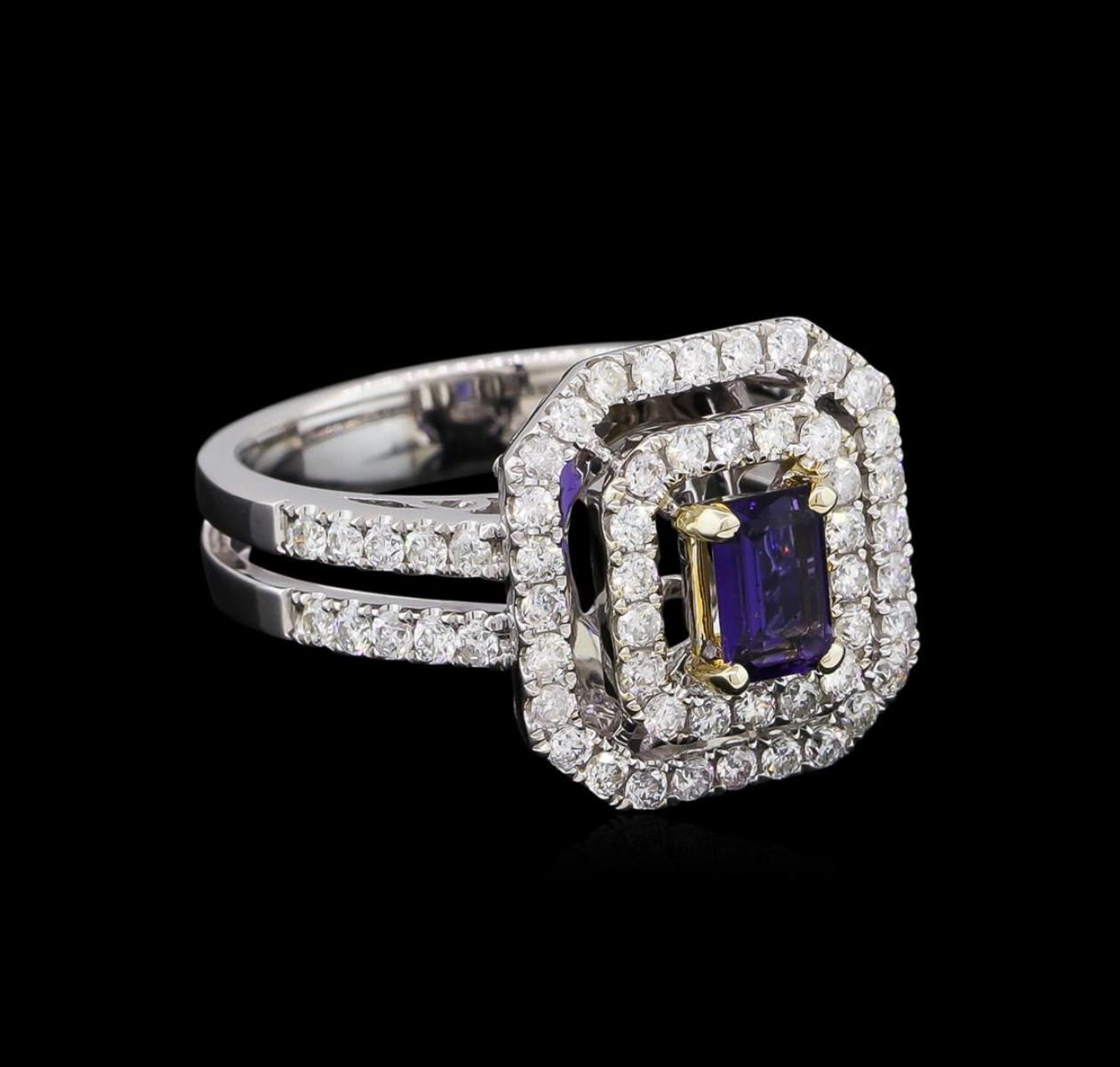 One electronically tested 14KT white and yellow gold Ladies combination cast & assembled ring with a bright polish finish. Condition is new. Identified with markings of "14K". Containing: Sixty-Five prong set round brilliant cut diamonds, measuring 1.20 - 1.20 x 0.72mm (depth est.) approximate. Total Weight of 65 Stones = 0.98ct. Clarity: I-1 to I-2. Color: J - K, Cut is Good. One prong set emerald modified step cut natural tanzanite, measuring 5.80 x 3.90 x 2.80mm, exact weight 0.40 ct., clarity is eye clean, type I, medium, very slightly grayish, violet color, (GIA V 5/3), cut is very good. Colored gemstones are presumed to have been subjected to commonly used color/clarity enhancement processes. Total Weight of Colored Stones 0.40 ct. Total Weight of Diamonds 0.98ct. Total Weight of Ring 6.40 grams. GGL Appraised.