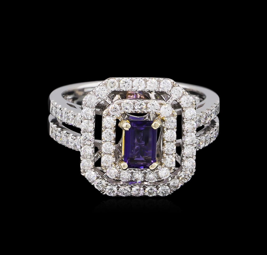 One electronically tested 14KT white and yellow gold Ladies combination cast & assembled ring with a bright polish finish. Condition is new. Identified with markings of "14K". Containing: Sixty-Five prong set round brilliant cut diamonds, measuring 1.20 - 1.20 x 0.72mm (depth est.) approximate. Total Weight of 65 Stones = 0.98ct. Clarity: I-1 to I-2. Color: J - K, Cut is Good. One prong set emerald modified step cut natural tanzanite, measuring 5.80 x 3.90 x 2.80mm, exact weight 0.40 ct., clarity is eye clean, type I, medium, very slightly grayish, violet color, (GIA V 5/3), cut is very good. Colored gemstones are presumed to have been subjected to commonly used color/clarity enhancement processes. Total Weight of Colored Stones 0.40 ct. Total Weight of Diamonds 0.98ct. Total Weight of Ring 6.40 grams. GGL Appraised.
