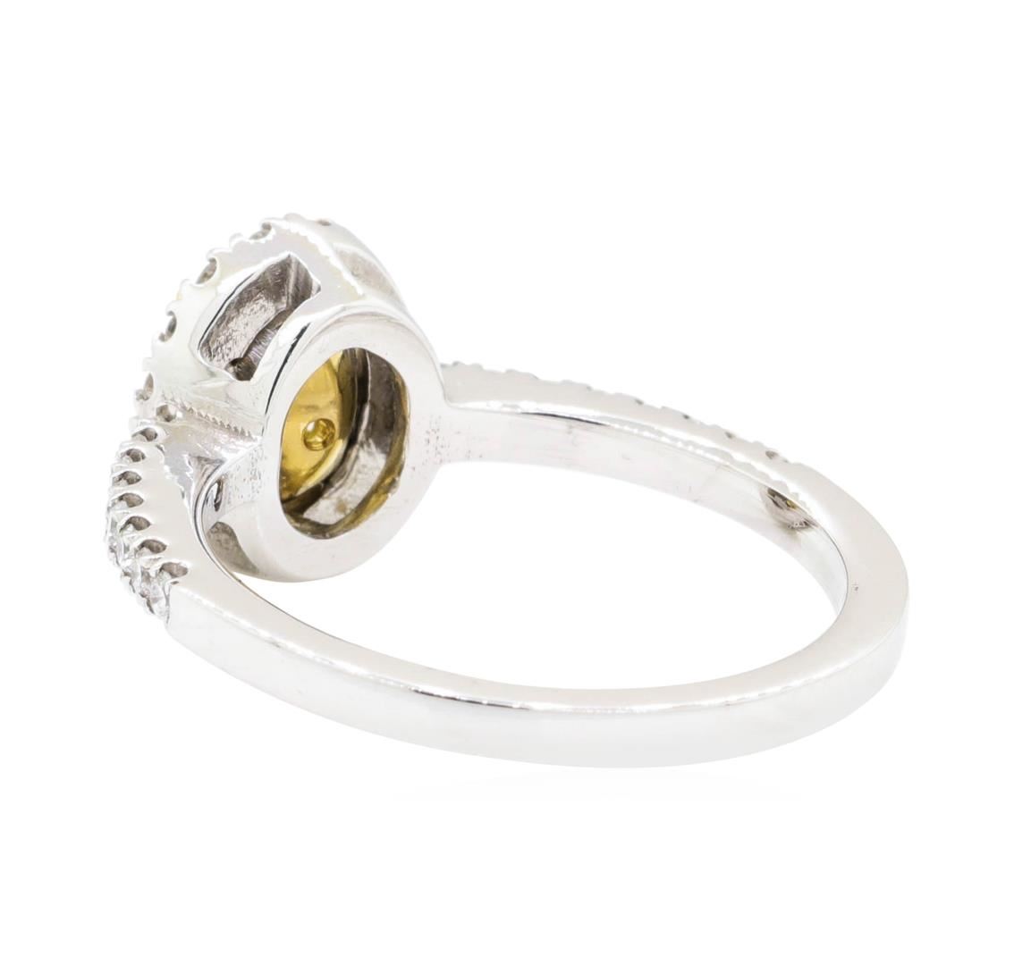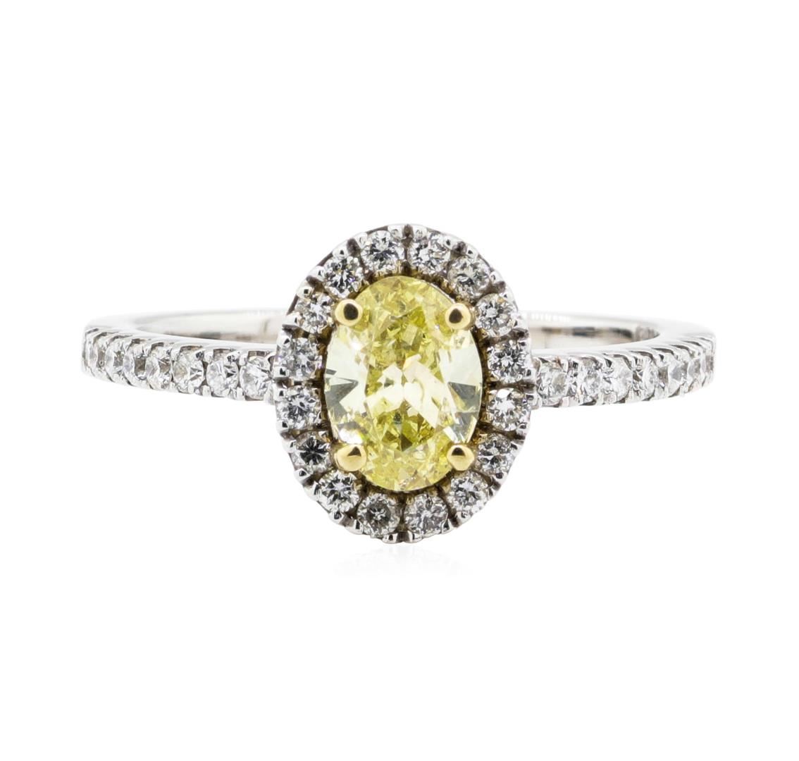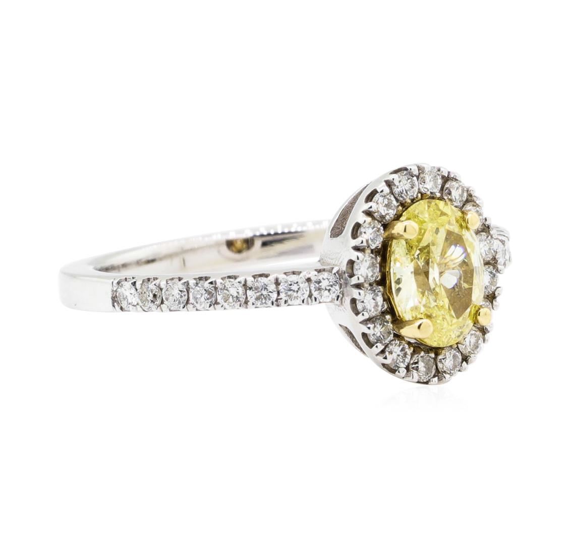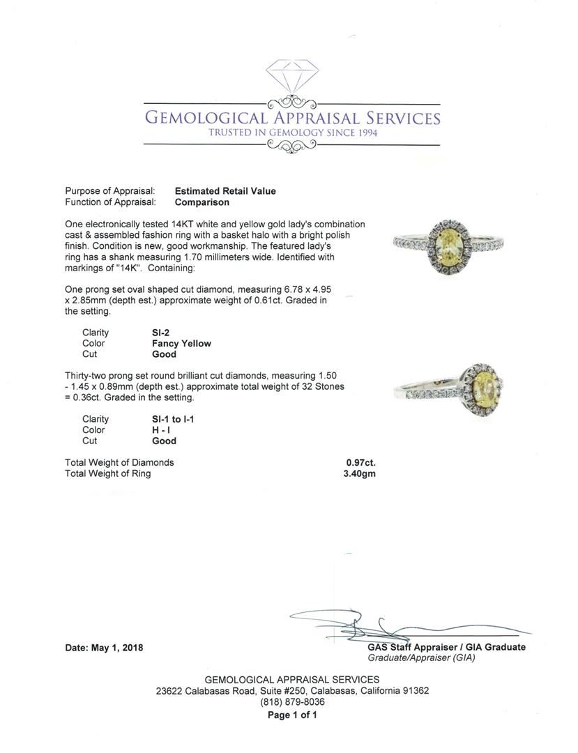 One electronically tested 14KT white and yellow gold Ladies combination cast & assembled fashion ring with a basket halo with a bright polish finish. The featured Ladies ring has a shank measuring 1.70 millimeters wide. Identified with markings of '14K'. Condition is new, good workmanship. Containing: One prong set oval shaped cut diamond, measuring 6.78 x 4.95 x 2.85mm (depth est.) approximate weight of 0.61ct. Graded in the setting. Color Fancy Yellow Clarity SI-2 Cut Good Thirty-Two prong set round brilliant cut diamonds, measuring 1.50 - 1.45 x 0.89mm (depth est.) approximate total weight of 32 Stones = 0.36ct. Graded in the setting. Color H - I Clarity SI-1 to I-1 Cut Good. Total Weight of Diamonds 0.97ct.. Total Weight of Ring 3.40gm. GAS Appraised.