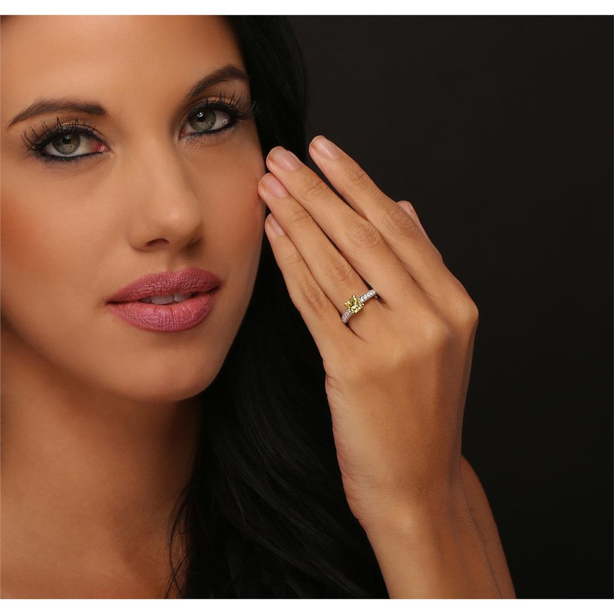 Natural Diamond Report Certificate US 68062805D Shape and Cut Corner Rect. Mod. Brilliant. Weight 1.06ct, Measurements 5.83 x 5.17 x 4.20mm Depth 81.2% Table 72% Culet None Girdle Thick to very thick polished, Polish good, Symmetry good, Fluorescence Medium Greenish Blue. Clarity Grade S13*C.E. Color Grade Fancy intense to fancy vivid green yellow. Comments: Feather Filled. *Grades are based on appearance after enhancement. Industry tests show that the color is stable under normal wear and up to 300C. Girdle inscribed "EGL US 68062805D C.E." Description: White gold ring with yellow gold accents stamped "14k" containing one (1) feather filled diamond, enhanced for color, described above. The ring also contains 46 round brilliant cut side stones that are F-G color, SI3-I1 clarity with a total weight of 0.29ct. Total weight of the ring is 3.4 grams. Graded as mounting permits.