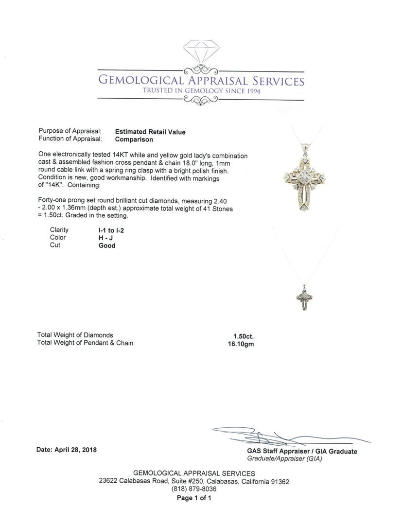 One electronically tested 14KT white and yellow gold Ladies combination cast & assembled fashion cross pendant & chain 18.0' long, 1mm round cable link with a spring ring clasp with a bright polish finish. Identified with markings of '14K'. Condition is new, good workmanship. Containing: Forty-One prong set round brilliant cut diamonds, measuring 2.40 - 2.00 x 1.36mm (depth est.) approximate total weight of 41 Stones = 1.50ct. Graded in the setting. Color H - J Clarity I-1 to I-2 Cut Good. Total Weight of Diamonds 1.50ct.. Total Weight of Pendant & Chain 16.10gm. GAS Appraised.