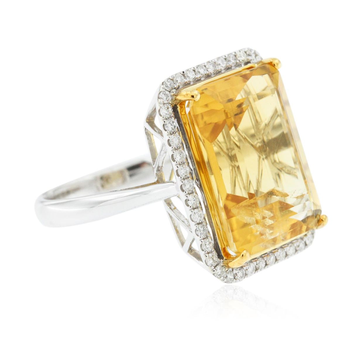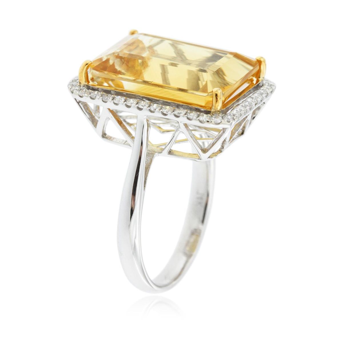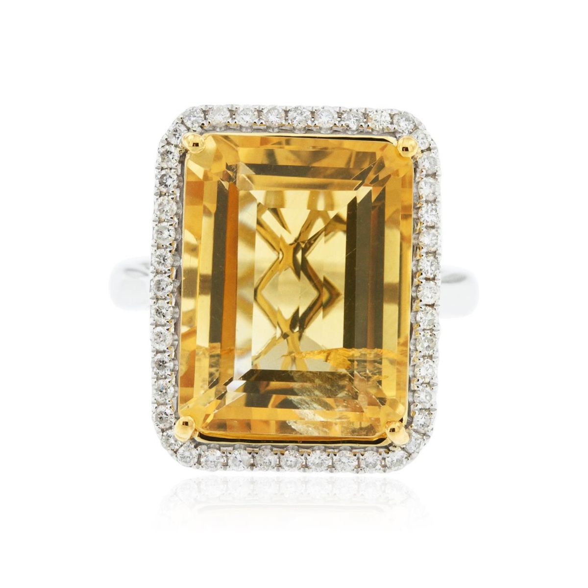 One electronically tested 14KT white and yellow gold Ladies combination cast & assembled ring with a bright polish finish. Condition is new. Identified with markings of "14K". Containing: Forty-Four bead set round brilliant cut diamonds, measuring 1.10 - 1.10 x 0.66mm (depth est.) approximate. Total Weight of 44 Stones = 0.50ct. Clarity: I-1 to I-2. Color: H - J, Cut is Good. One prong set emerald modified step cut natural citrine quartz, measuring 15.70 x 12.00 x 7.90mm, exact weight 11.18ct., clarity is eye clean, type I, medium light, brownish, yellow color, (GIA Y 4/3), cut is very good. Colored gemstones are presumed to have been subjected to commonly used color/clarity enhancement processes. Total Weight of Colored Stones 11.18ct. Total Weight of Diamonds 0.50ct. Total Weight of Ring 6.60 grams. GGL Appraised at $4,385.00.